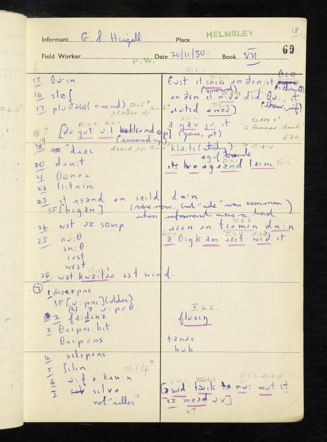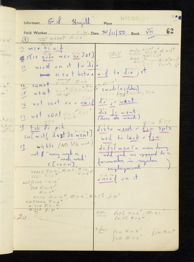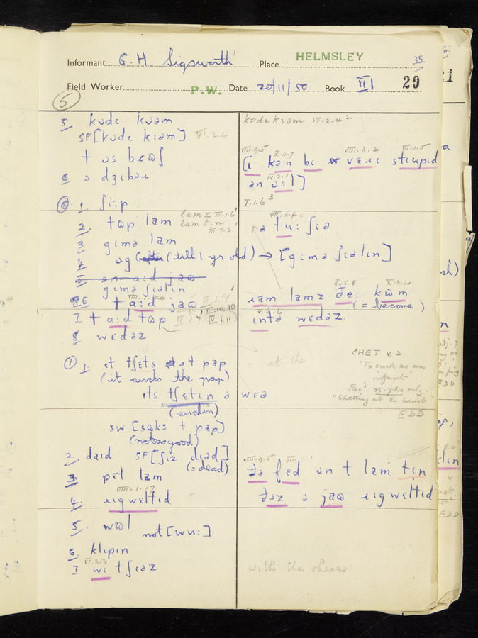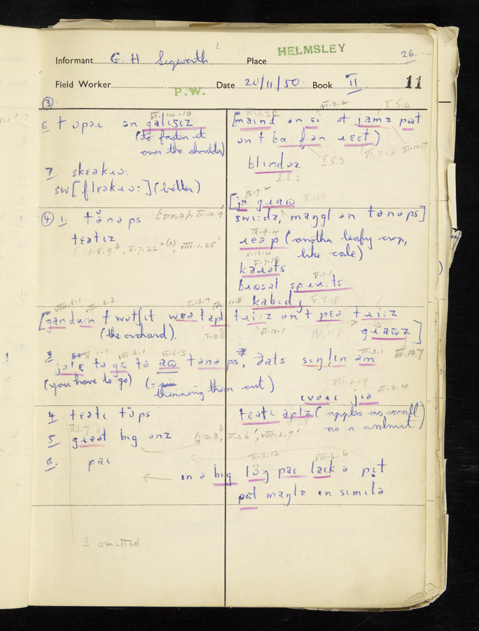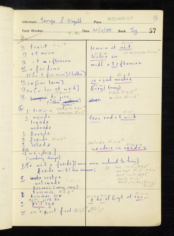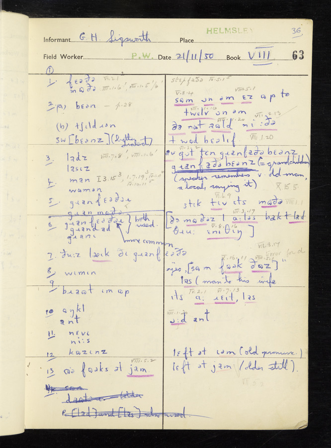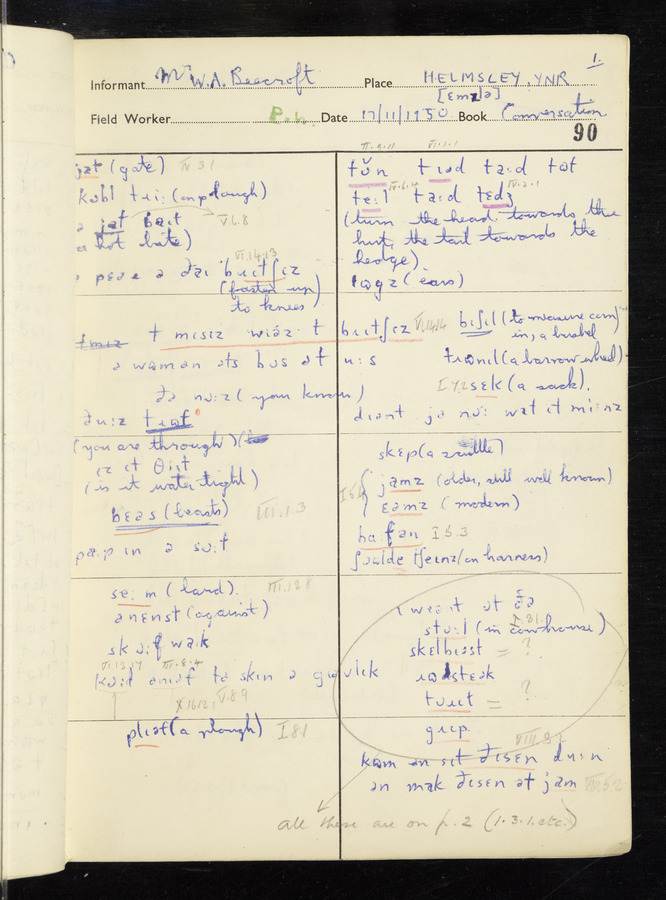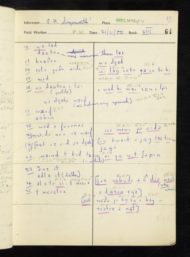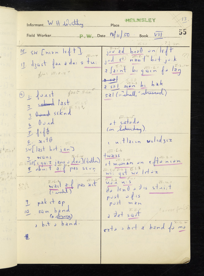 Interviews have been carried out by fieldworker Peter Wright. There are five informants for this response book - George Herbert Sigsworth, W. A. Beecroft, William H. Worthy, George S. Hugill and John William Peacock. Their responses can be found in the following books: George Herbert Sigsworth - II, III, VIII W. A. Beecroft - V, VI William H. Worthy - I, VII George S. Hugill - IV, VII John William Peacock - IV, VI