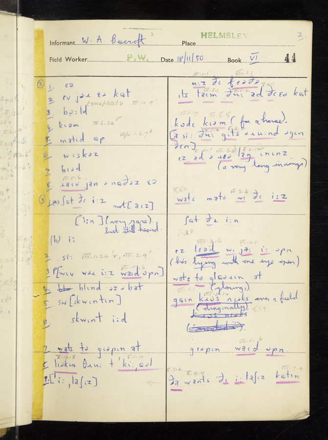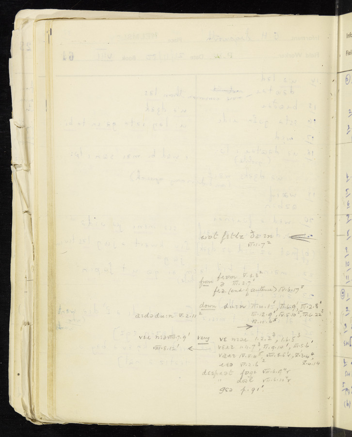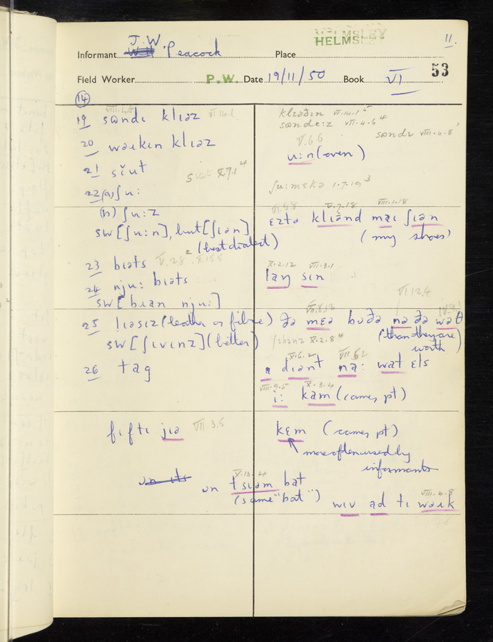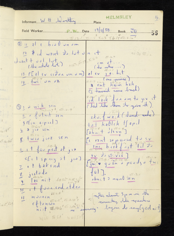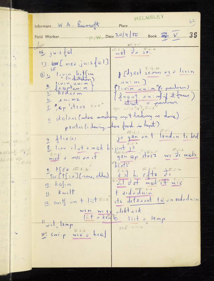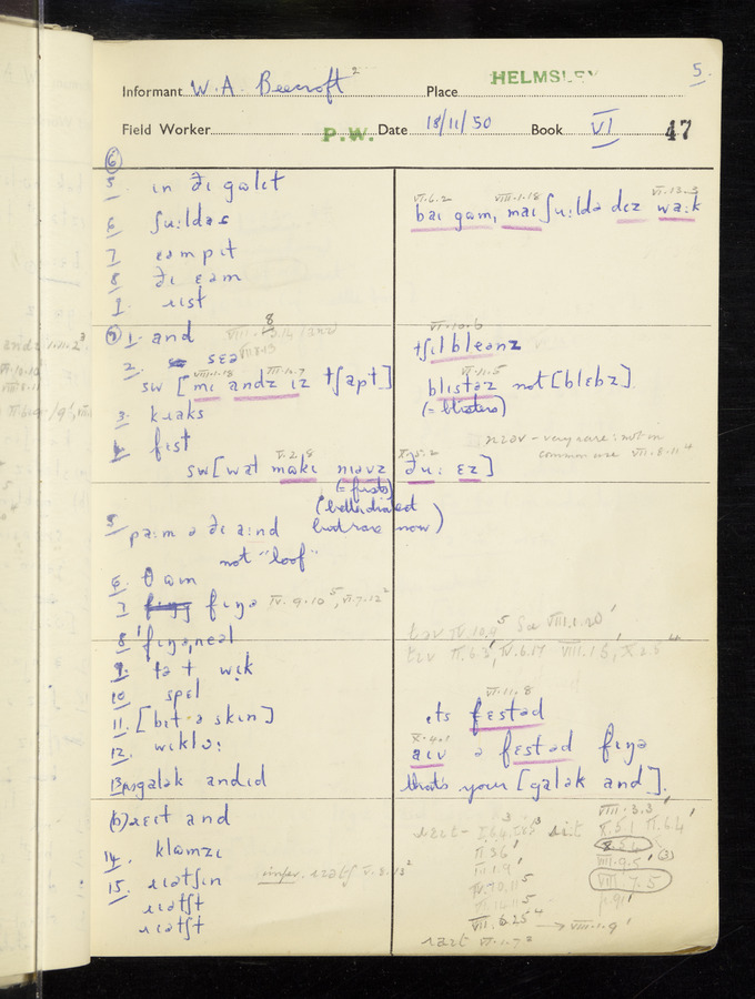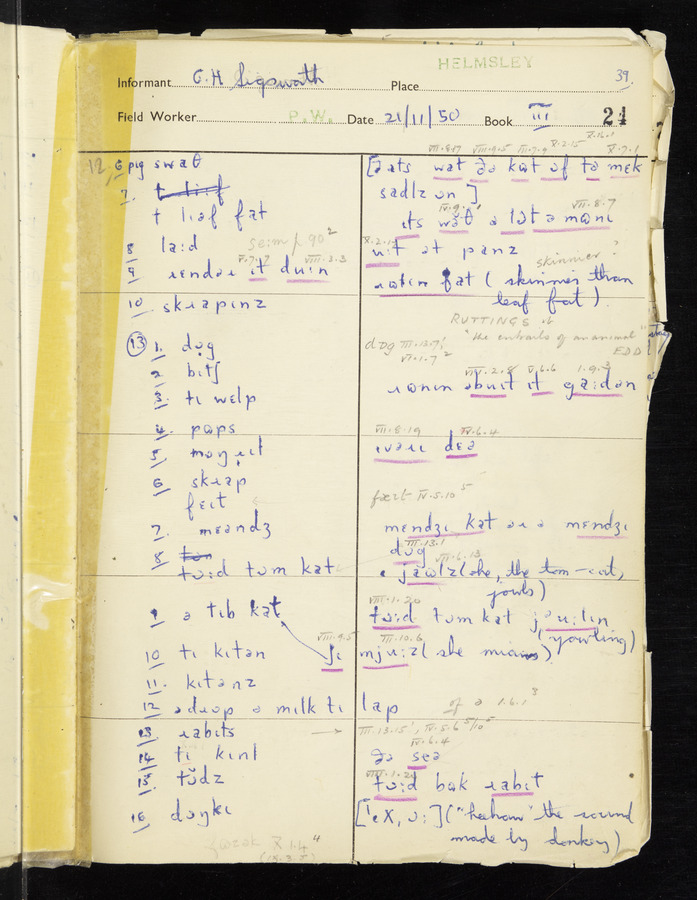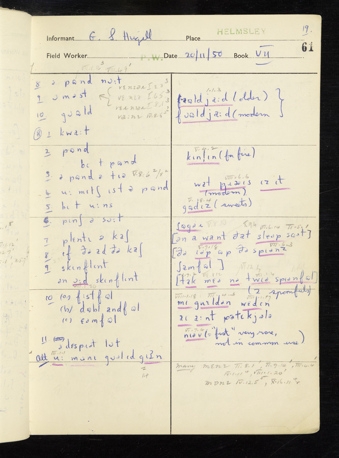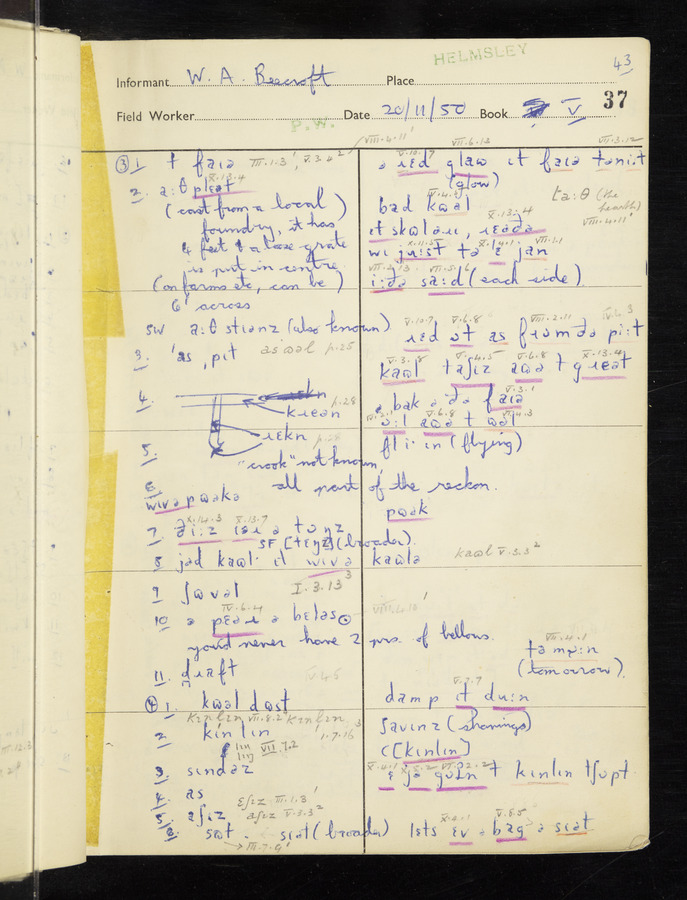 Interviews have been carried out by fieldworker Peter Wright. There are five informants for this response book - George Herbert Sigsworth, W. A. Beecroft, William H. Worthy, George S. Hugill and John William Peacock. Their responses can be found in the following books: George Herbert Sigsworth - II, III, VIII W. A. Beecroft - V, VI William H. Worthy - I, VII George S. Hugill - IV, VII John William Peacock - IV, VI