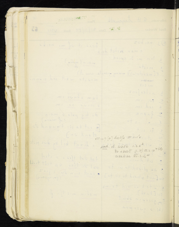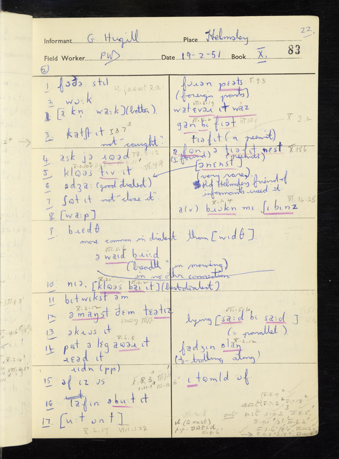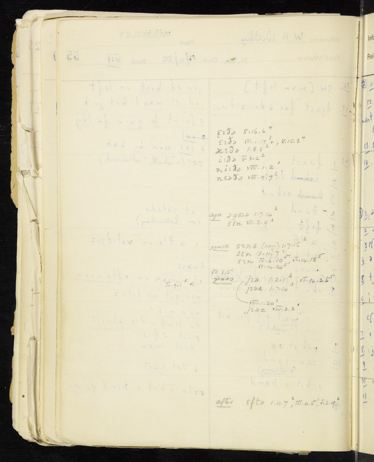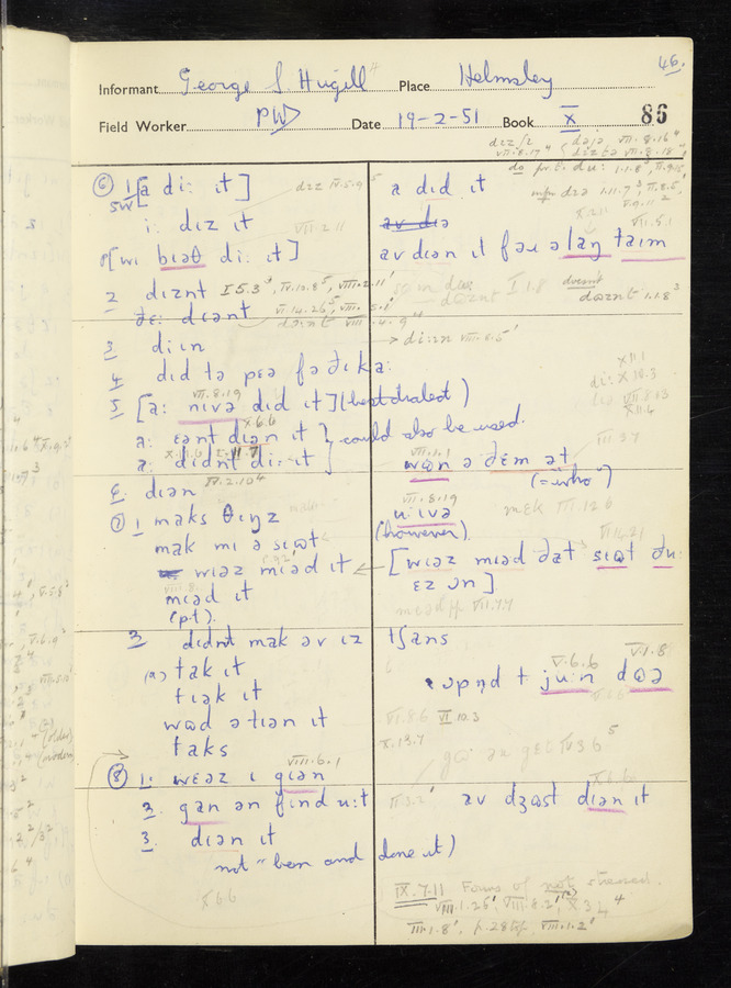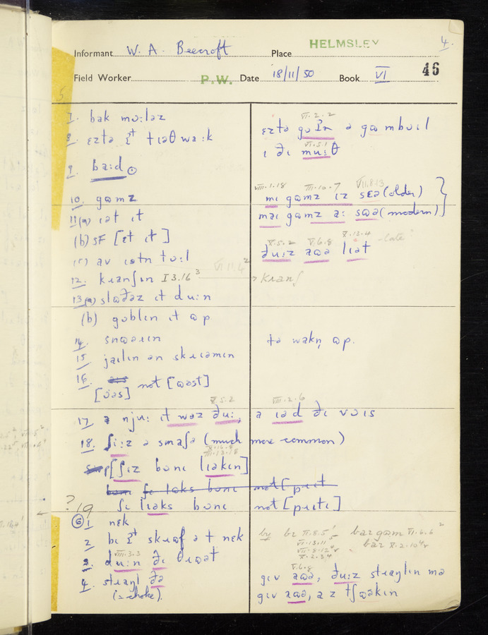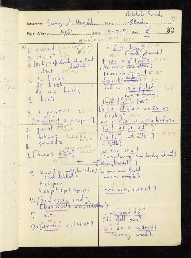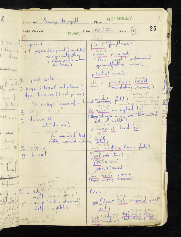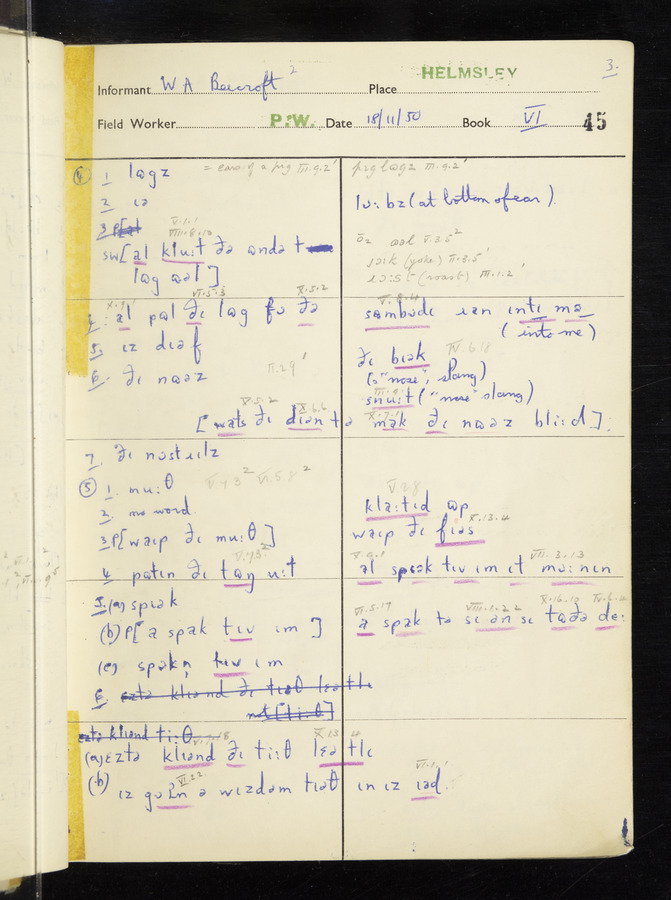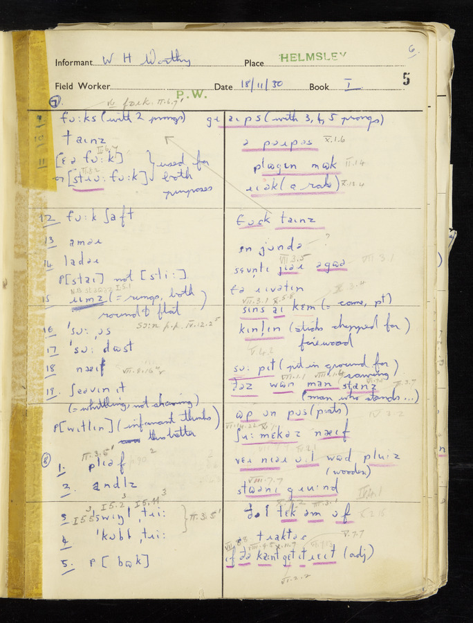 Interviews have been carried out by fieldworker Peter Wright. There are five informants for this response book - George Herbert Sigsworth, W. A. Beecroft, William H. Worthy, George S. Hugill and John William Peacock. Their responses can be found in the following books: George Herbert Sigsworth - II, III, VIII W. A. Beecroft - V, VI William H. Worthy - I, VII George S. Hugill - IV, VII John William Peacock - IV, VI