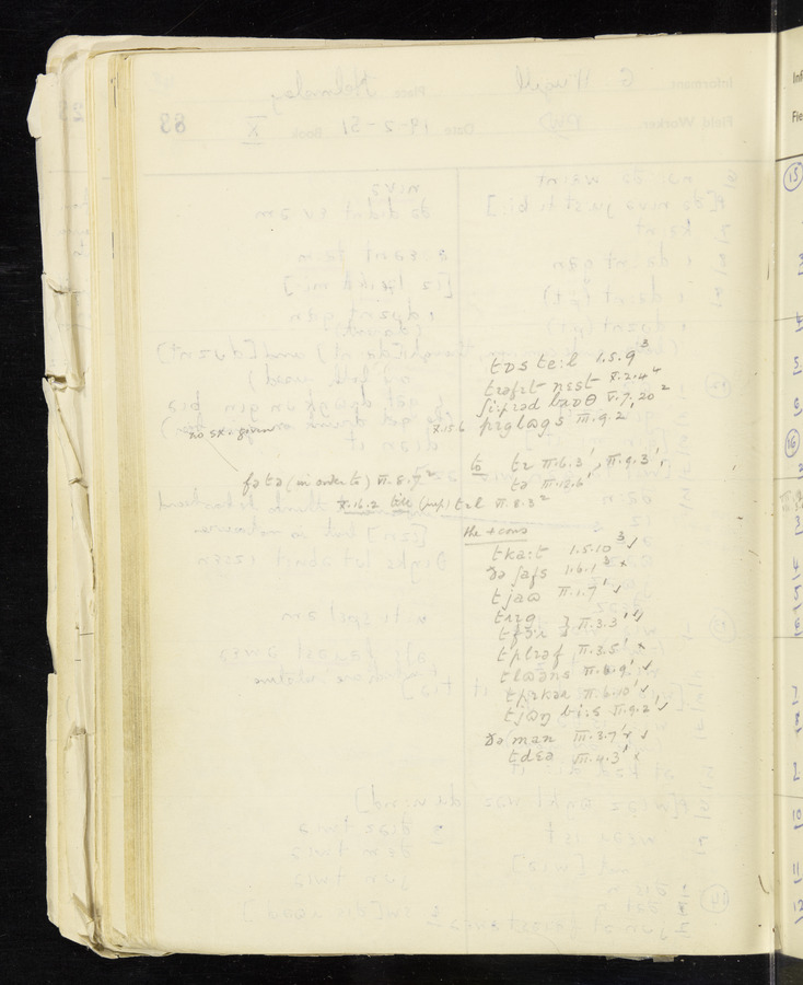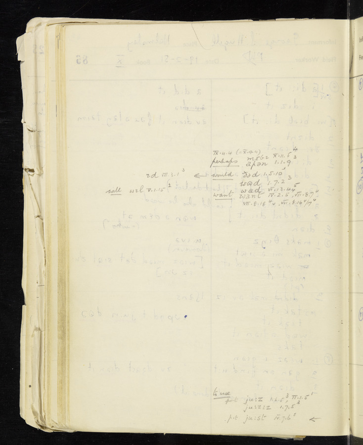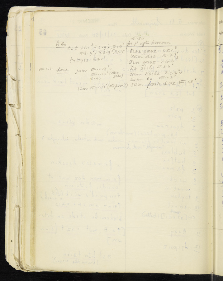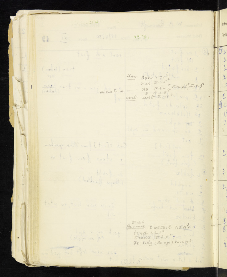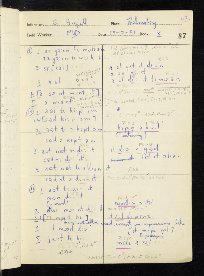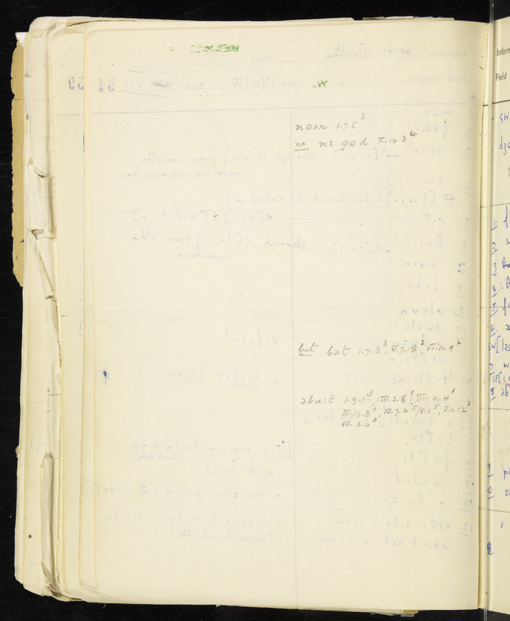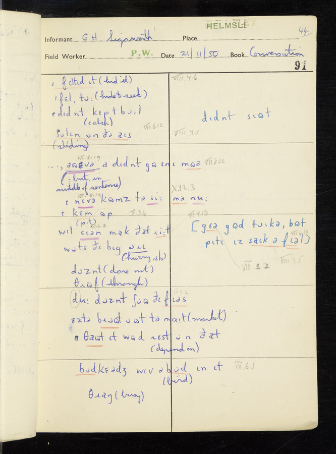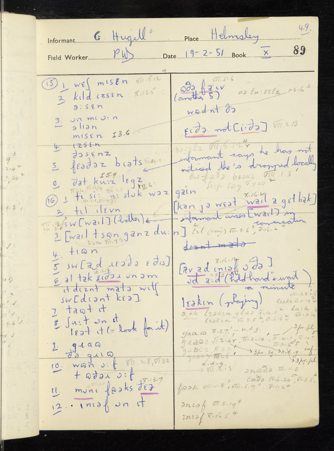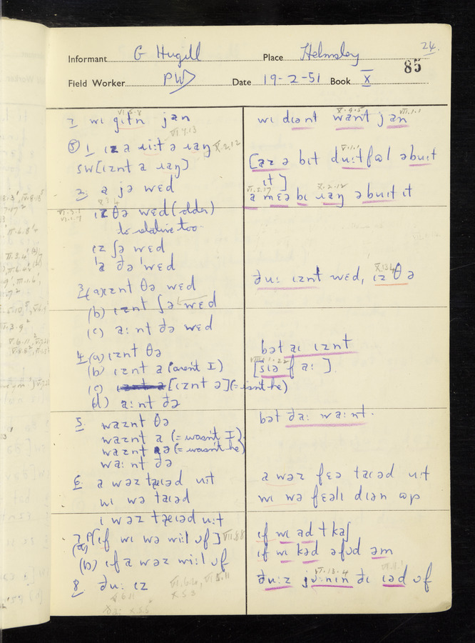 Interviews have been carried out by fieldworker Peter Wright. There are five informants for this response book - George Herbert Sigsworth, W. A. Beecroft, William H. Worthy, George S. Hugill and John William Peacock. Their responses can be found in the following books: George Herbert Sigsworth - II, III, VIII W. A. Beecroft - V, VI William H. Worthy - I, VII George S. Hugill - IV, VII John William Peacock - IV, VI