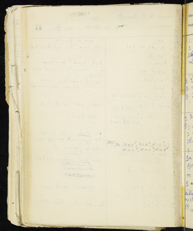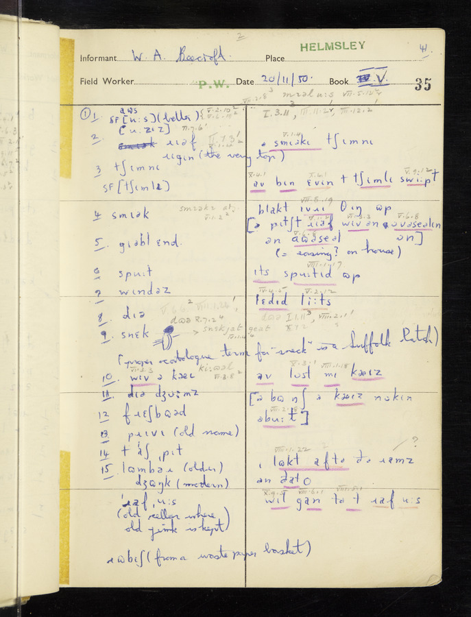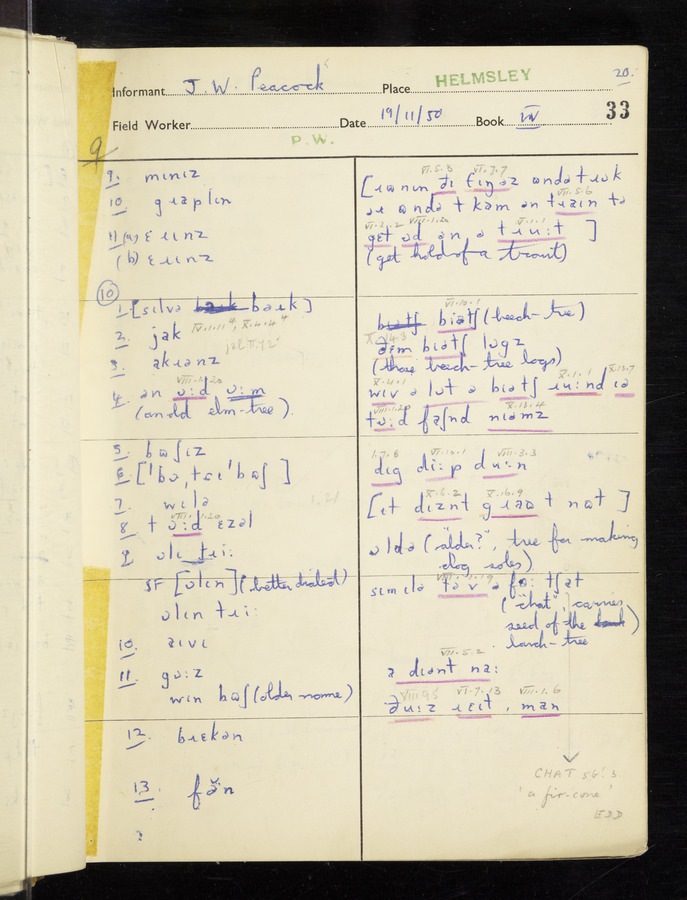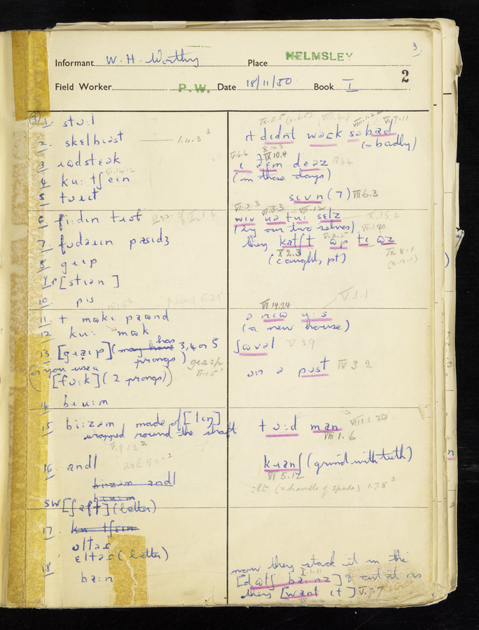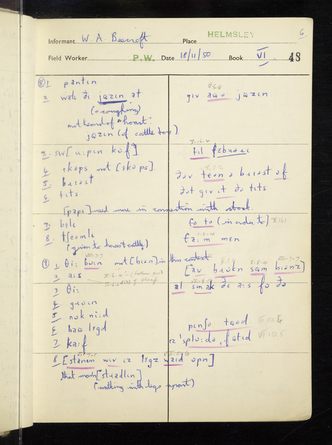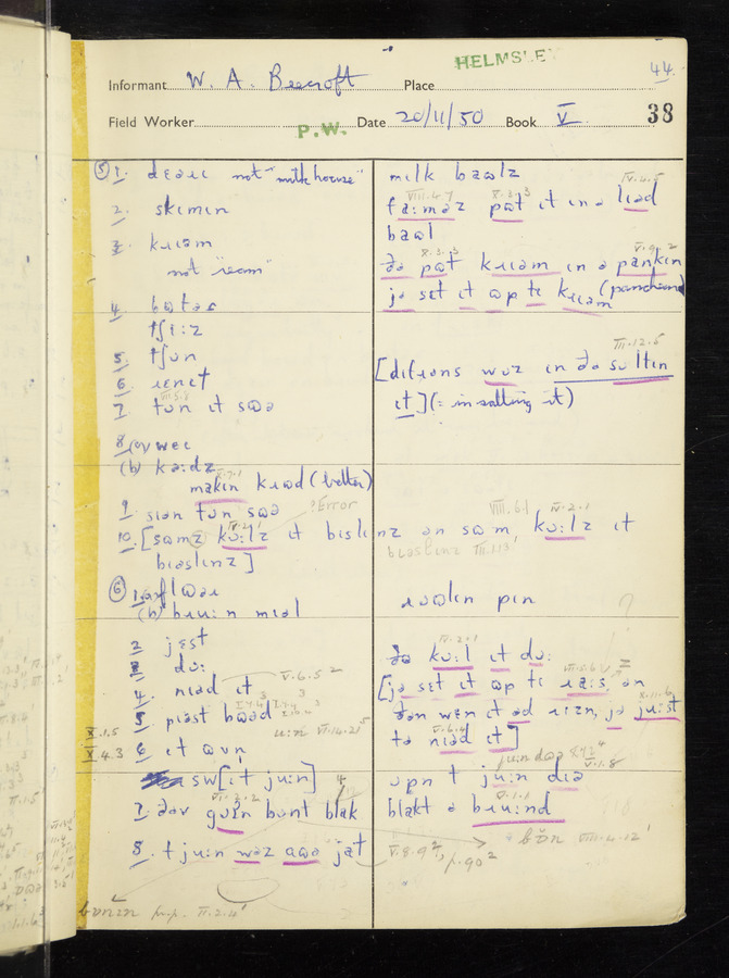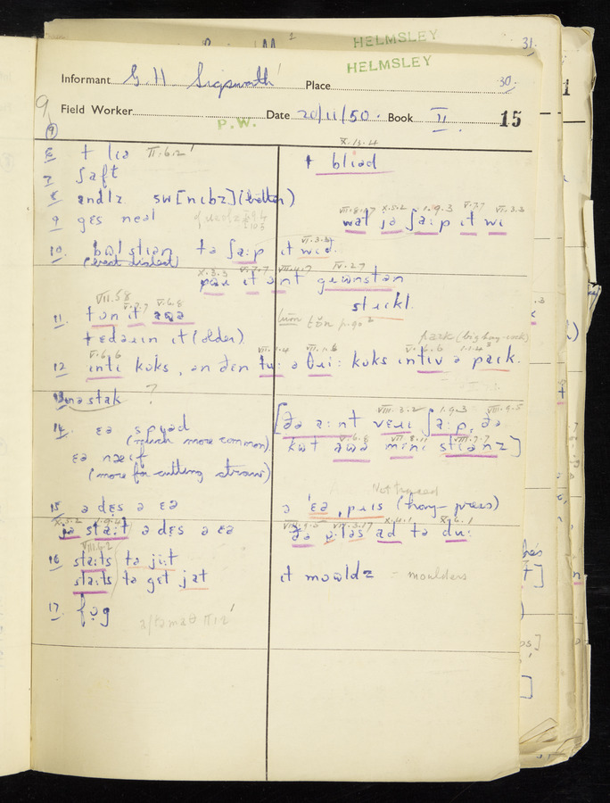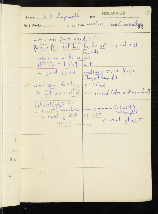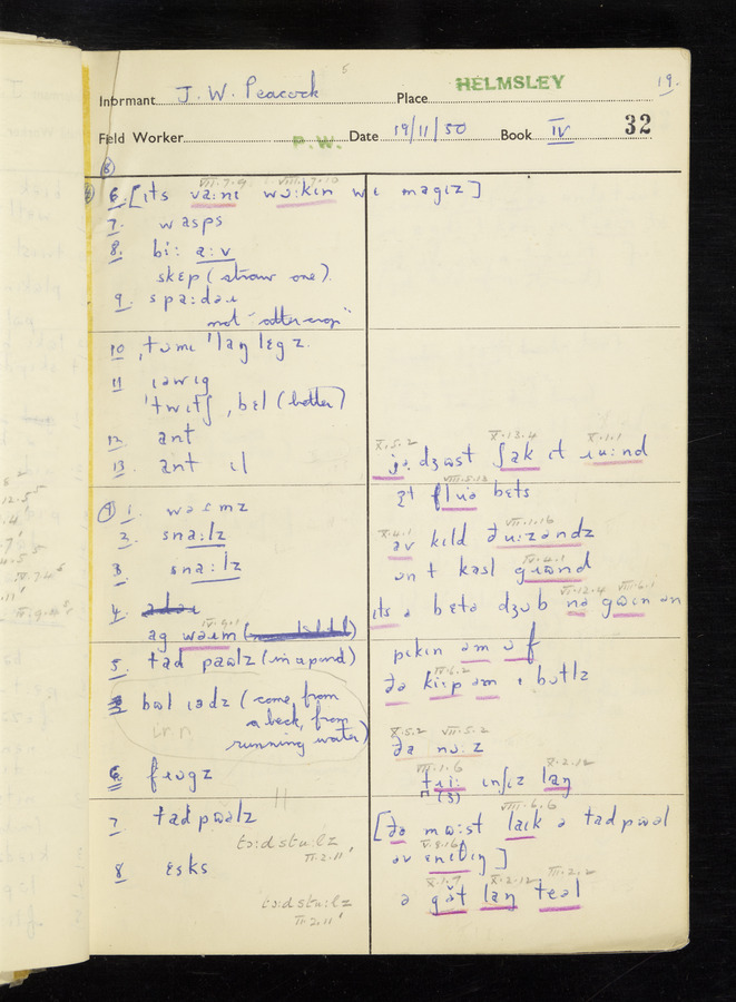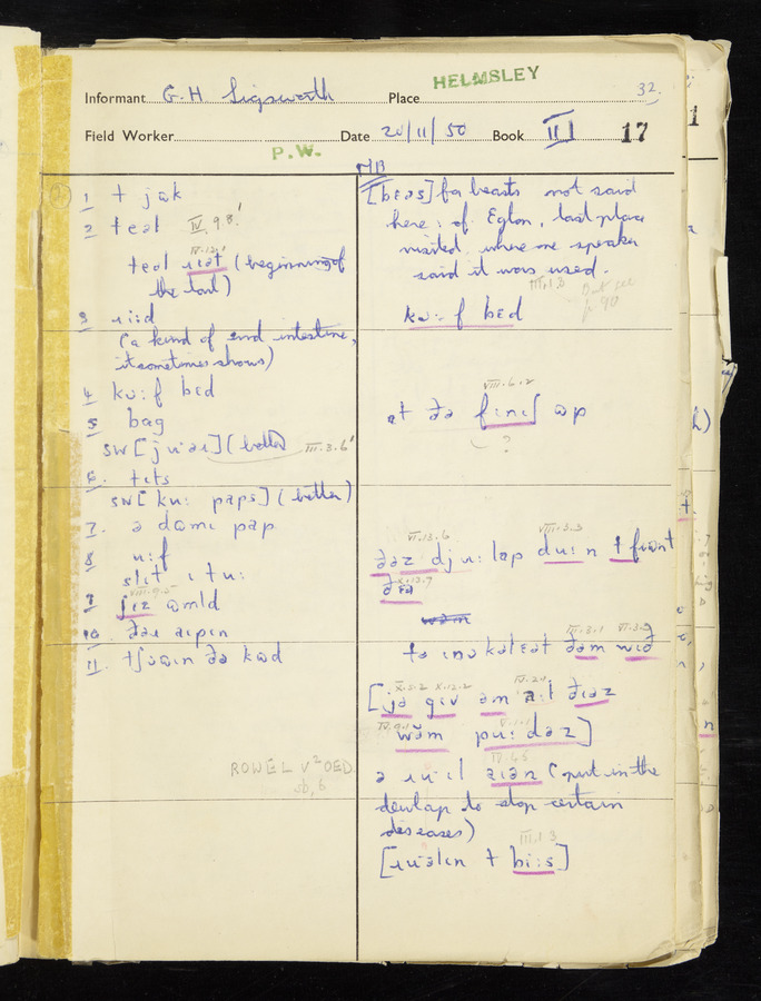 Response book recording the answers given by informants during the Survey of English Dialect. It includes 9 sections that cover a range of topics relating to work, domestic and social life. Answers are recorded in the International Phonetic Alphabet.