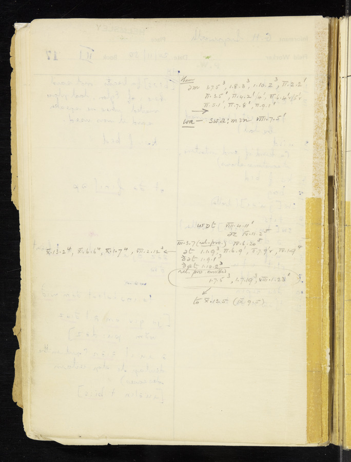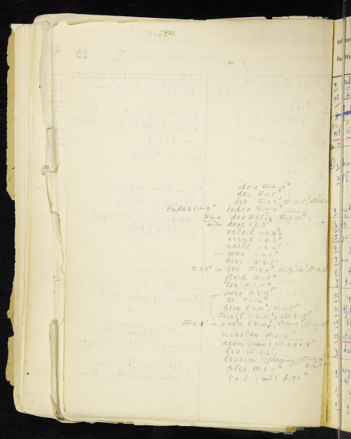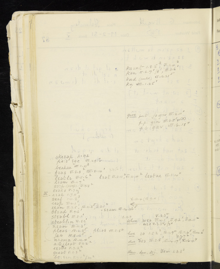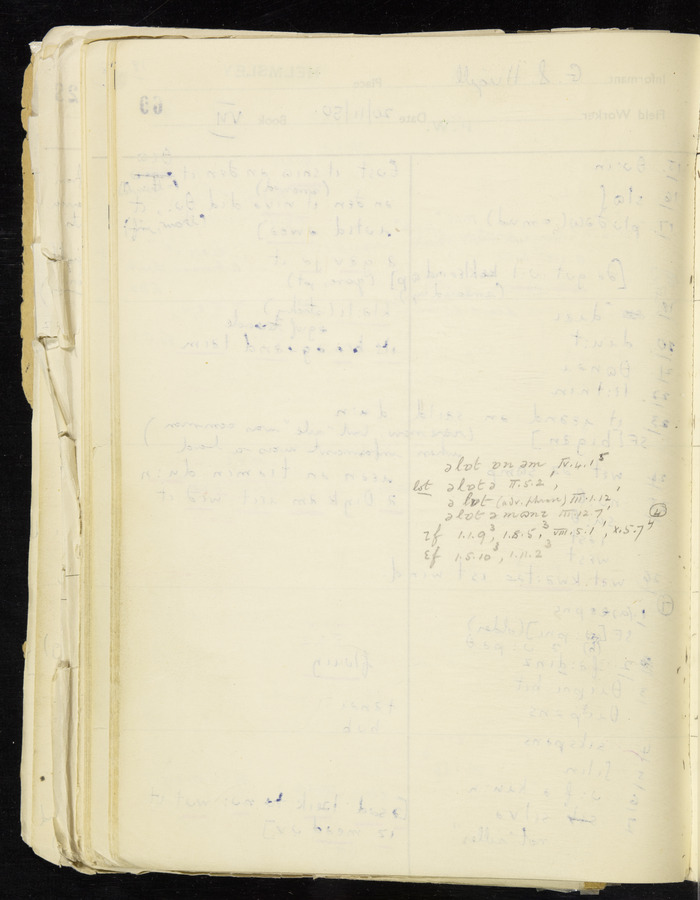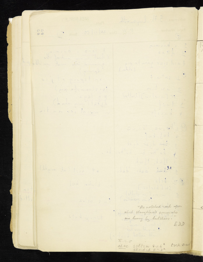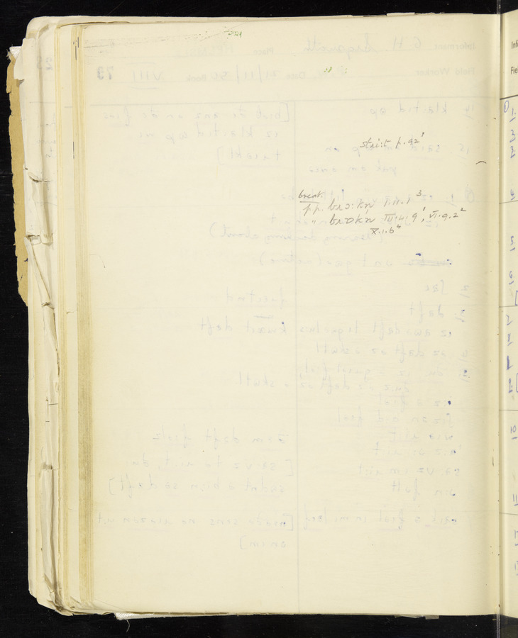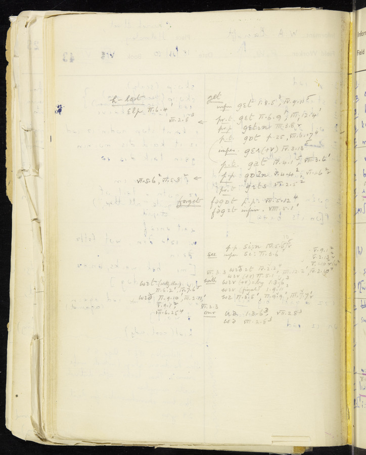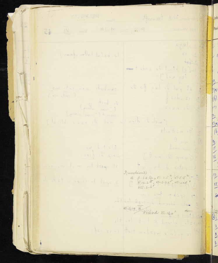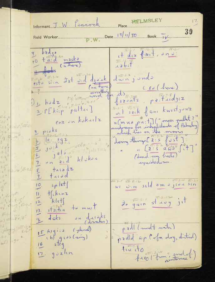Response book recording the answers given by informants during the Survey of English Dialect. It includes 9 sections that cover a range of topics relating to work, domestic and social life. Answers are recorded in the International Phonetic Alphabet.