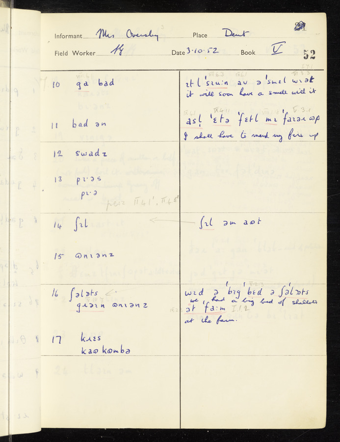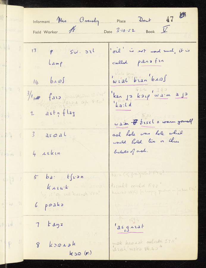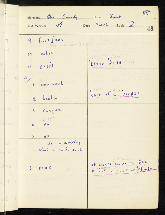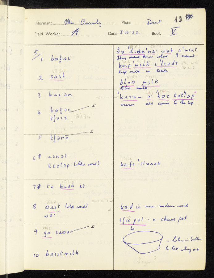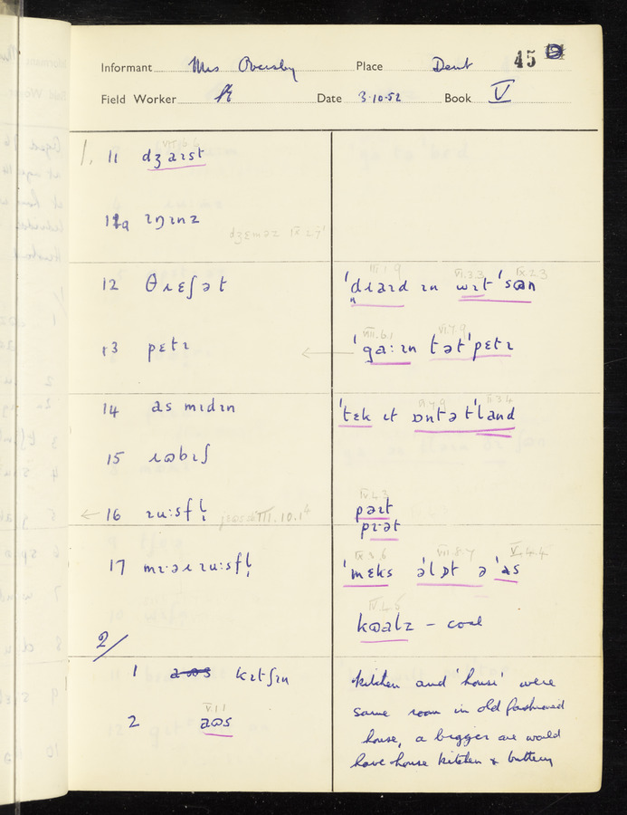 The answers of informant Mrs Oversby recorded by fieldworker Stanley Ellis in the International Phonetic Alphabet.