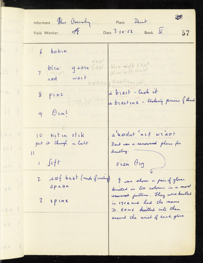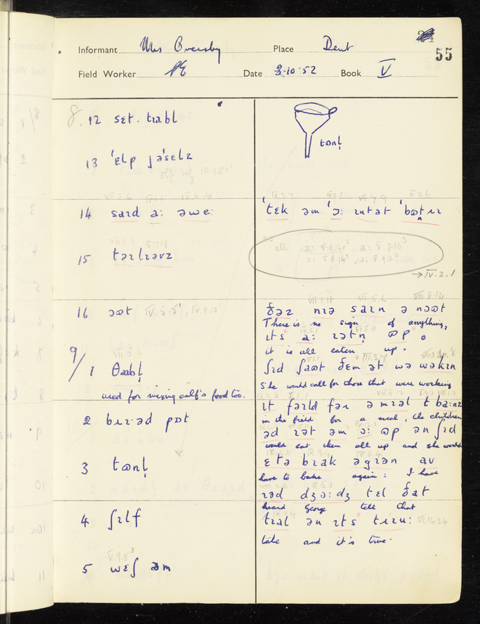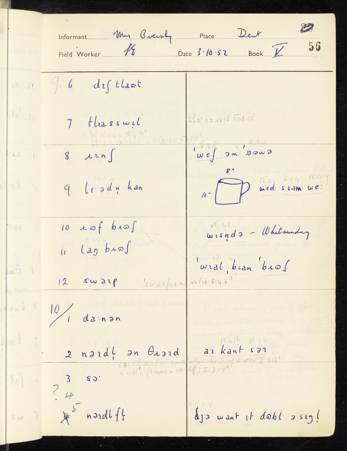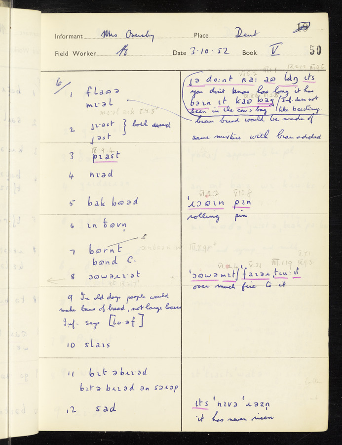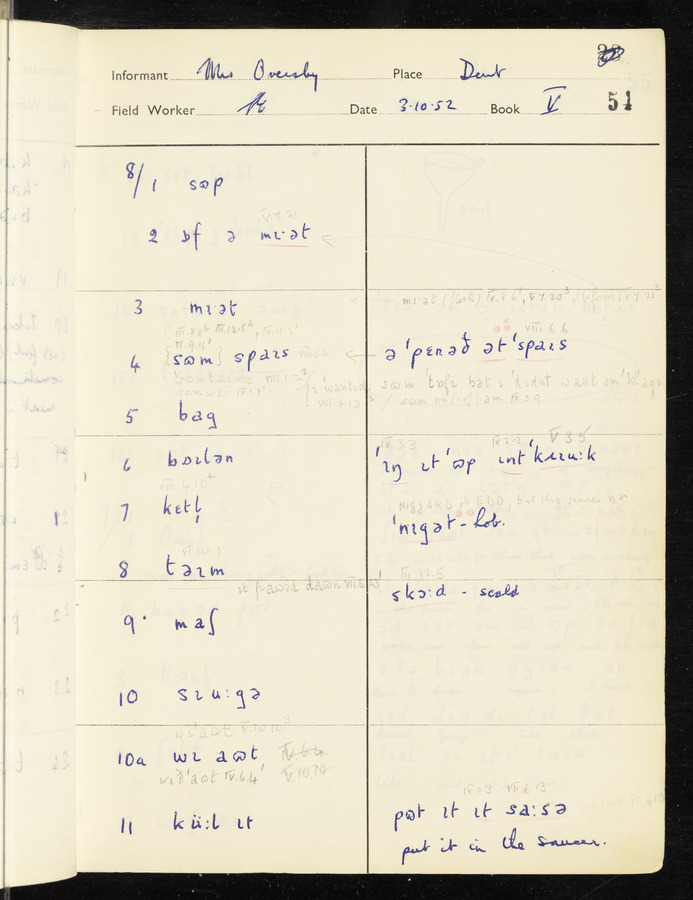 The answers of informant Mrs Oversby recorded by fieldworker Stanley Ellis in the International Phonetic Alphabet.