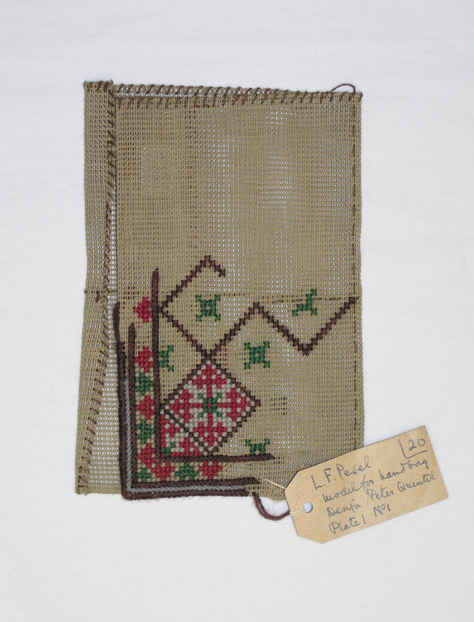 card label with handwritten ink inscription: 'L.F.Pesel 20 Model for handbag Design Peter Quentel Plate 1 No 1'