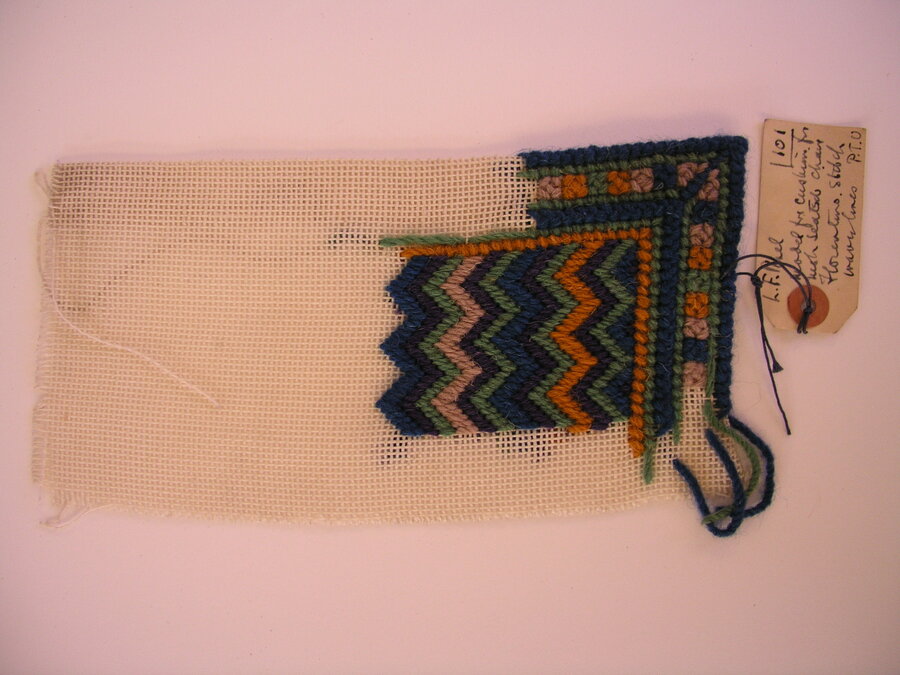 on card 'Model for cushions for rush seats and chairs. Florentine stitch wavy lines design suitable for slippers or under arm bag'