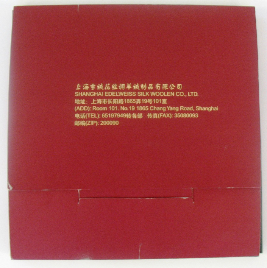 On red card envelope (also in Chinese): SHANGHAI EDELWEISS SILK WOOKEN CO., LTD. 1865 19 101 (ADD): Room 101. No.19 1865 Chang Yang Road, Shanghai (TEL):65197949 (FAX): 35080093 (ZIP): 200090 Equivalent information is on the attached washing instruction labels. The luggage style label has further details, including these reference numbers: CFTs 2005049 A/NMAL - 1 - 2004 GB 18401 - 2003 ISO9001: 2000
