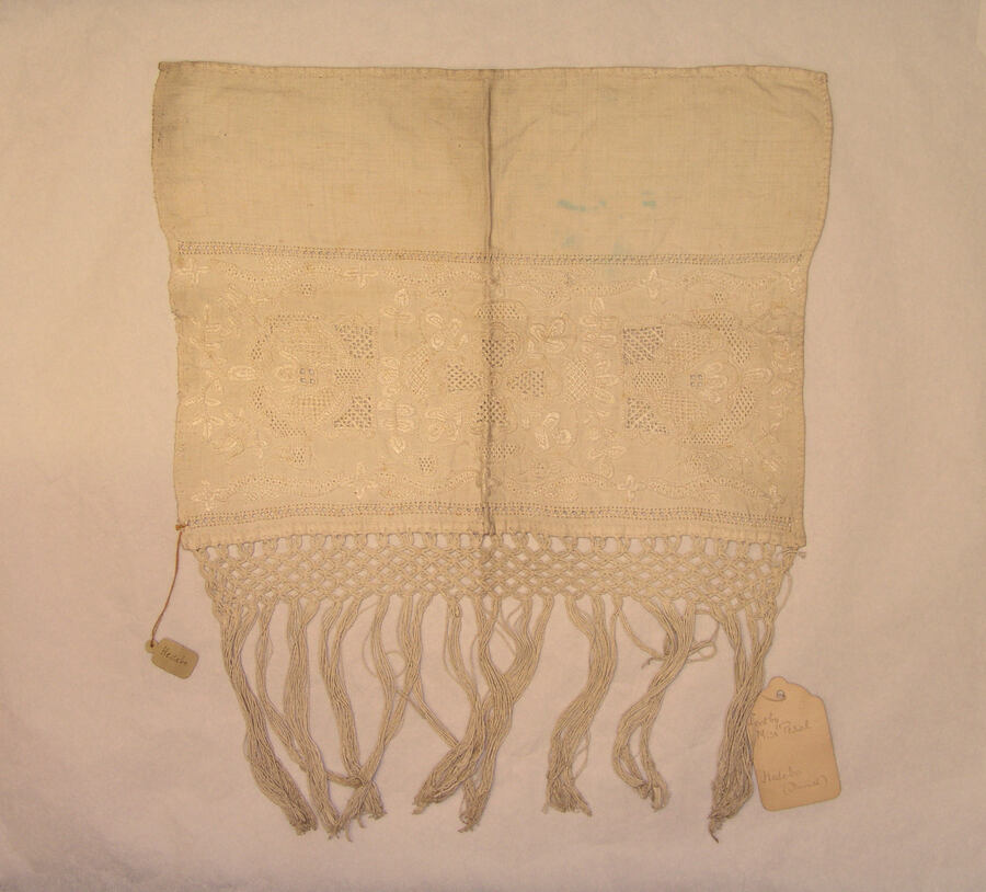 large buff coloured label with ink inscription 'lent by Miss Pesel Hedebo Danish'