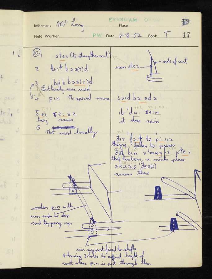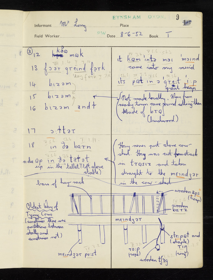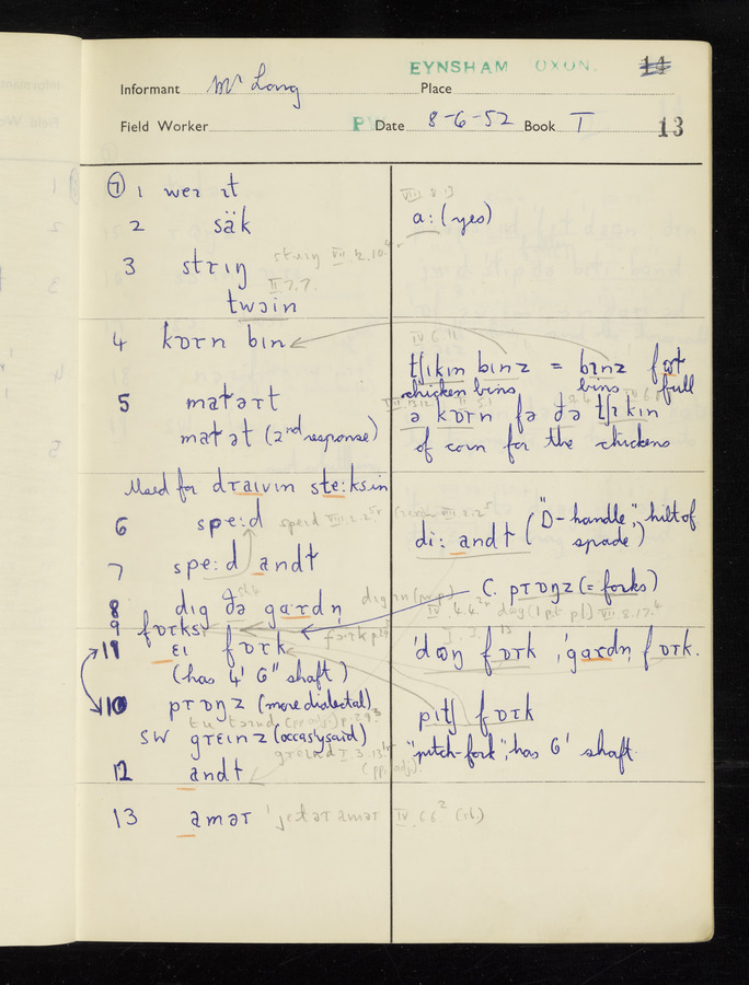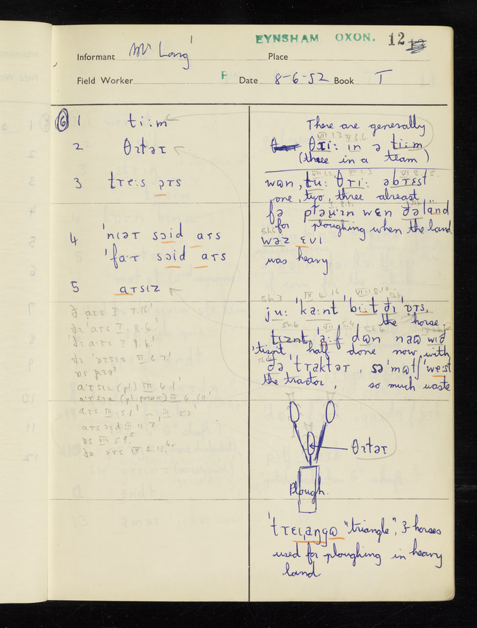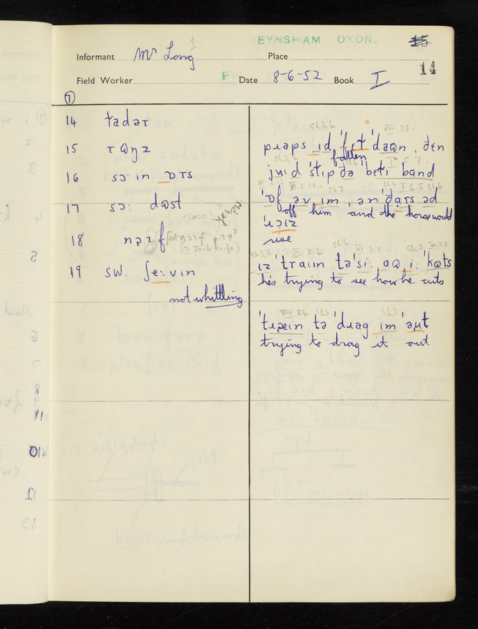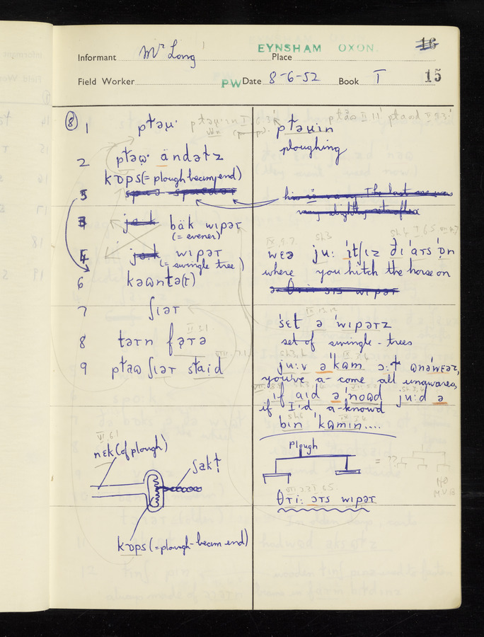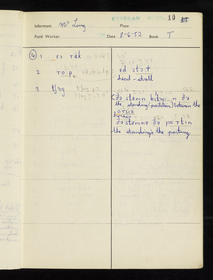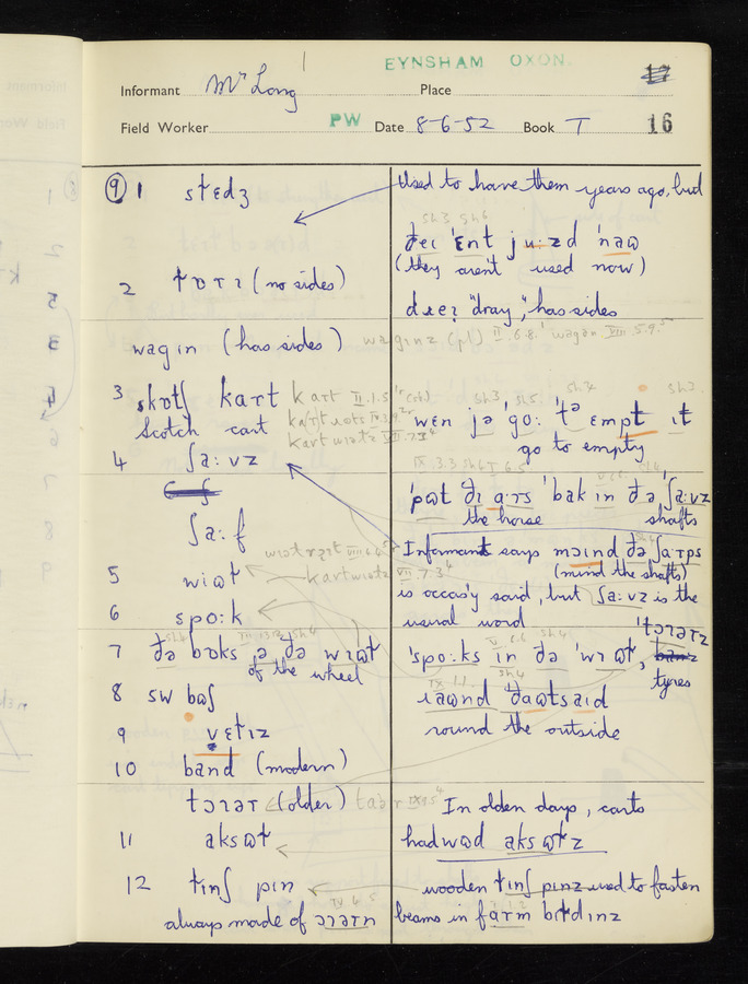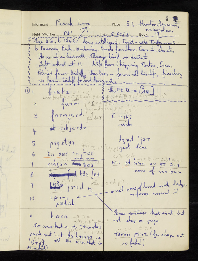 The answers of informant Frank Long recorded by fieldworker Peter Wright in the International Phonetic Alphabet.