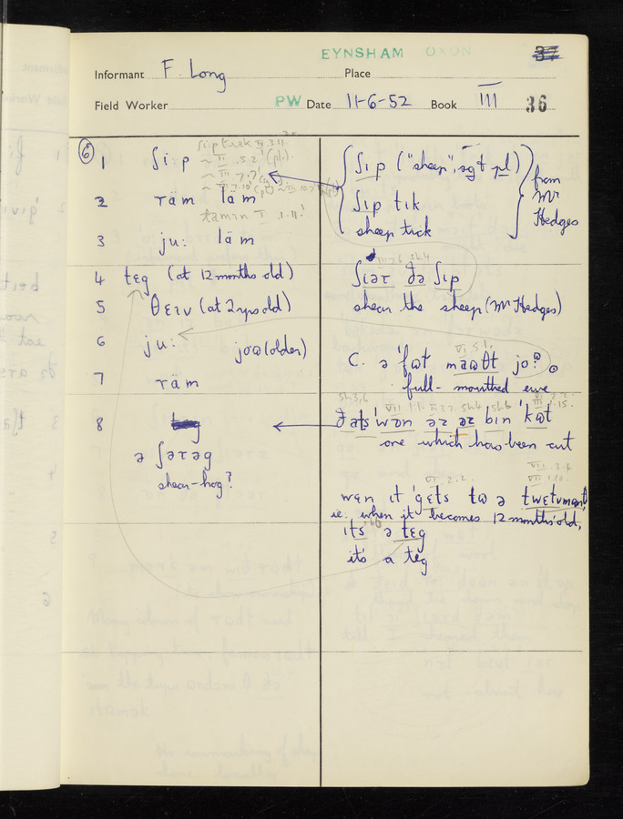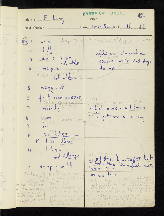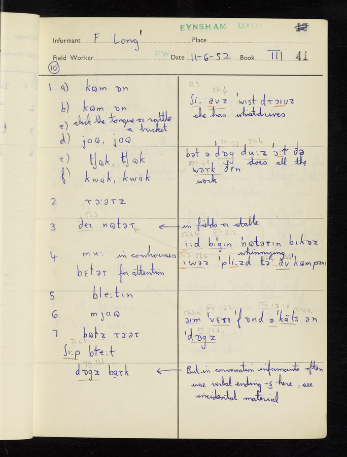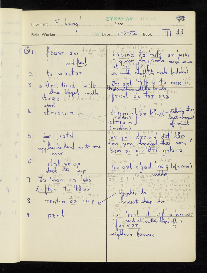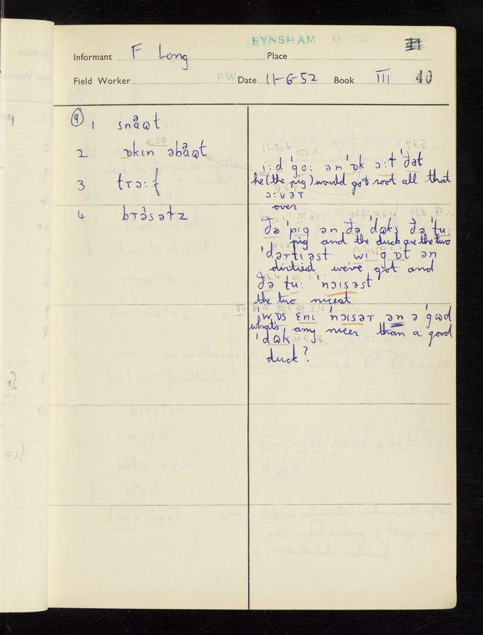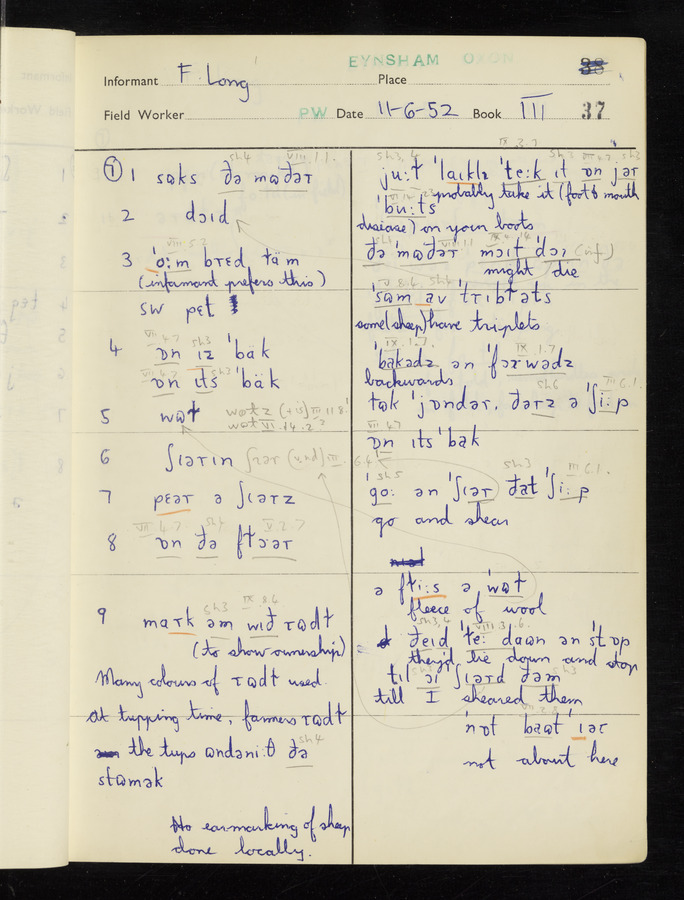 The answers of informant Frank Long recorded by fieldworker Peter Wright in the International Phonetic Alphabet.