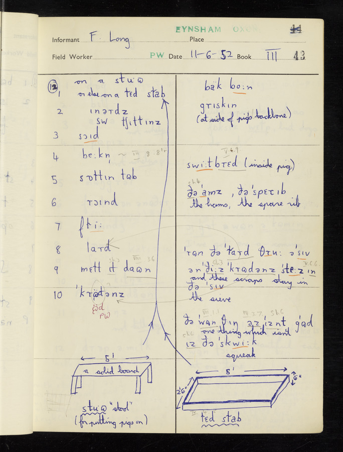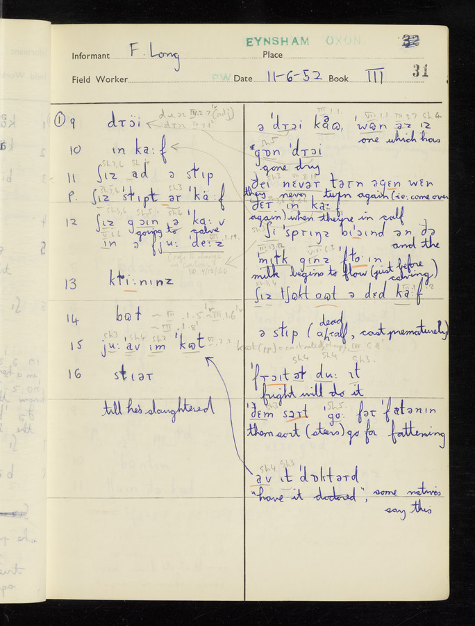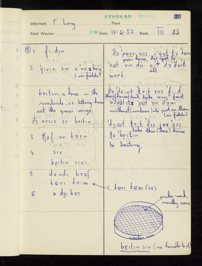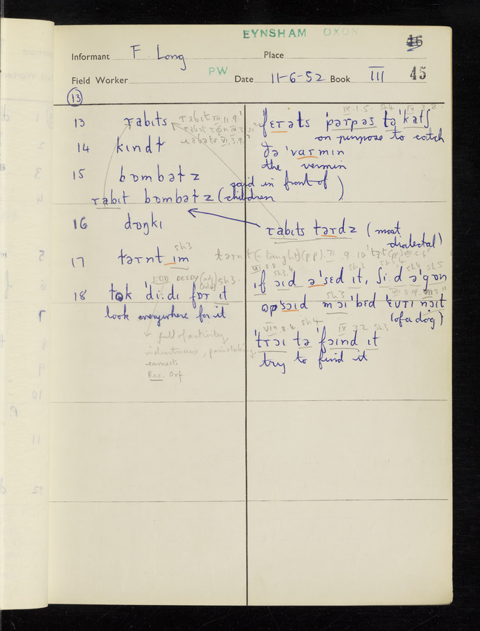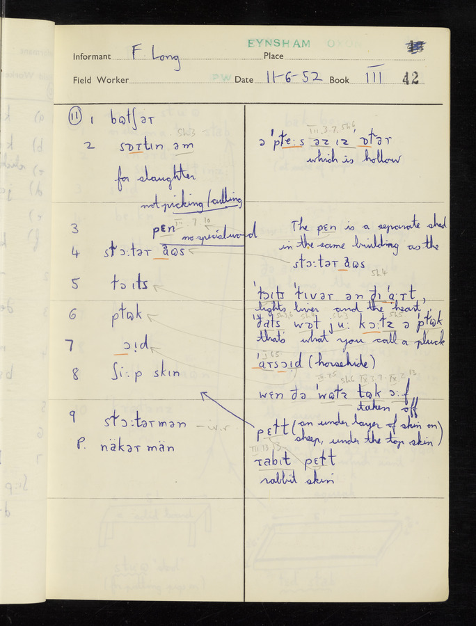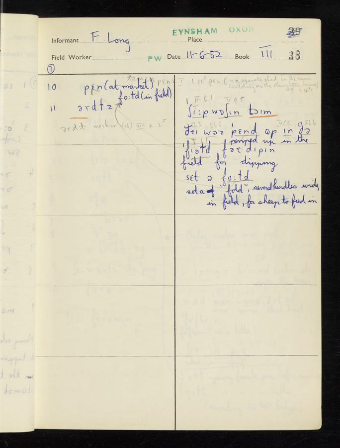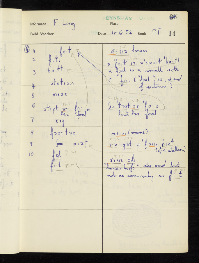 The answers of informant Frank Long recorded by fieldworker Peter Wright in the International Phonetic Alphabet.