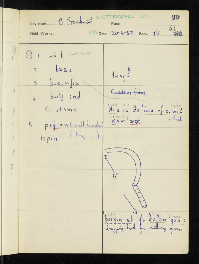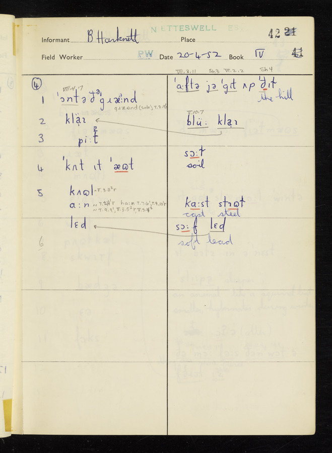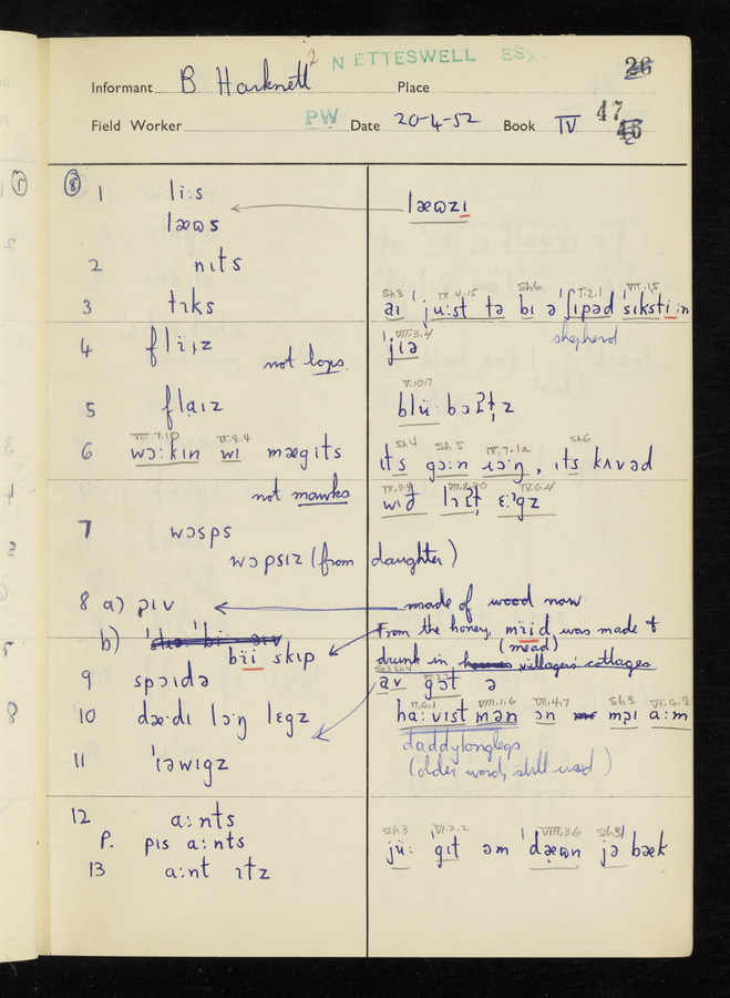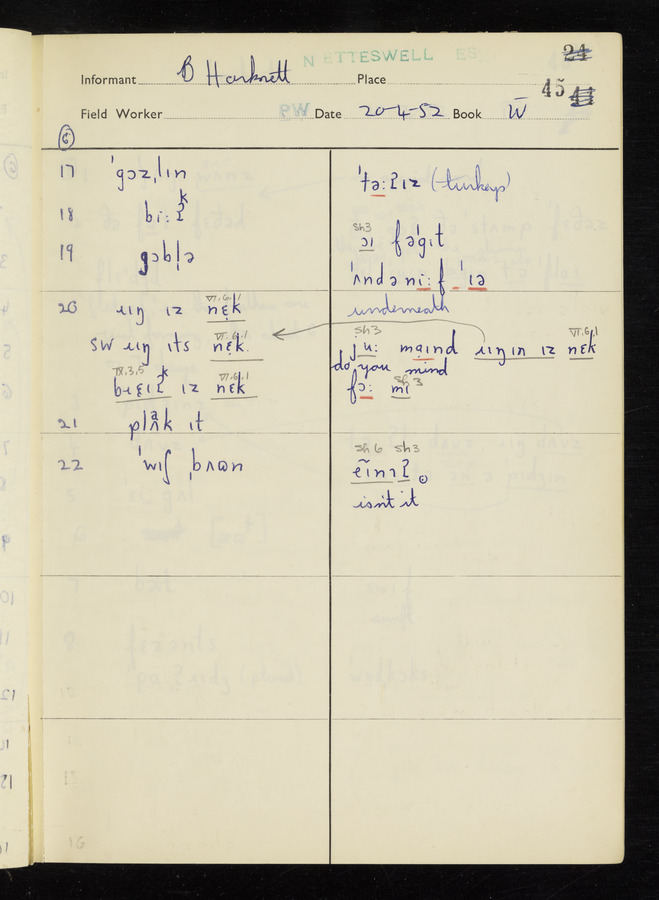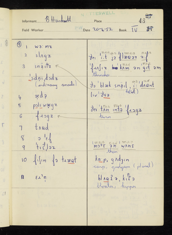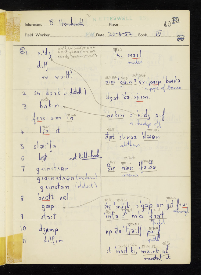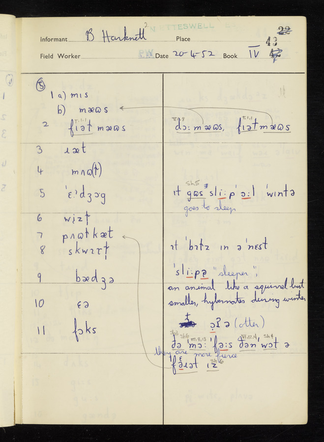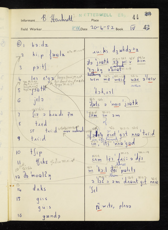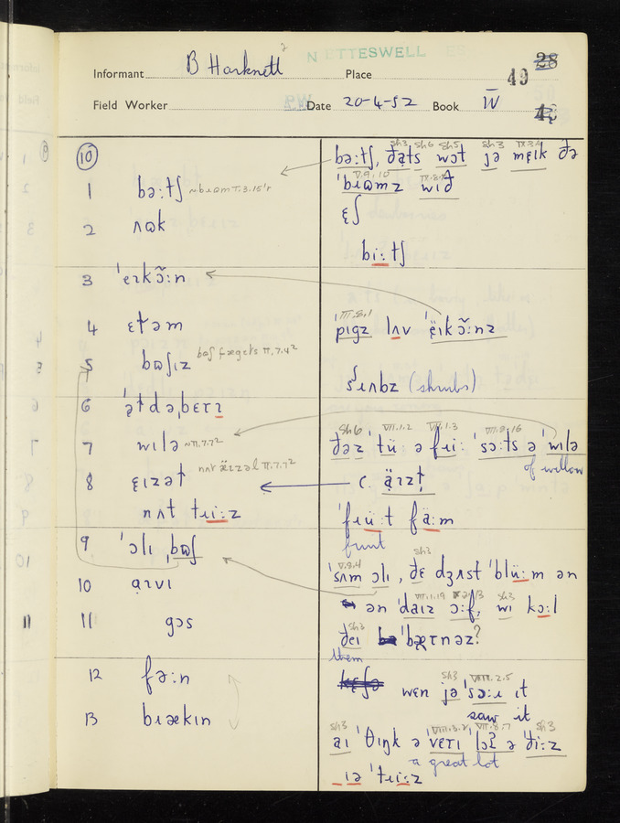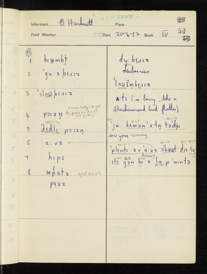 The answers of informant Benjamin Harknett recorded by fieldworker Peter Wright in the International Phonetic Alphabet.