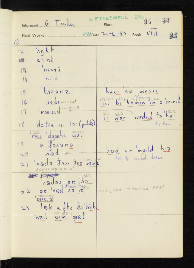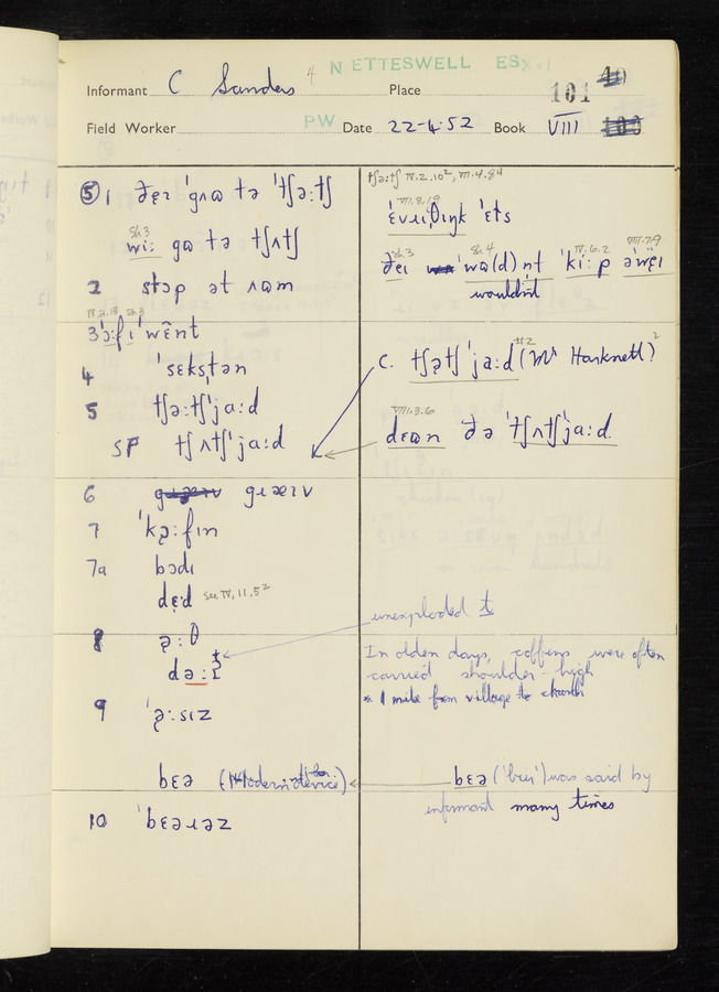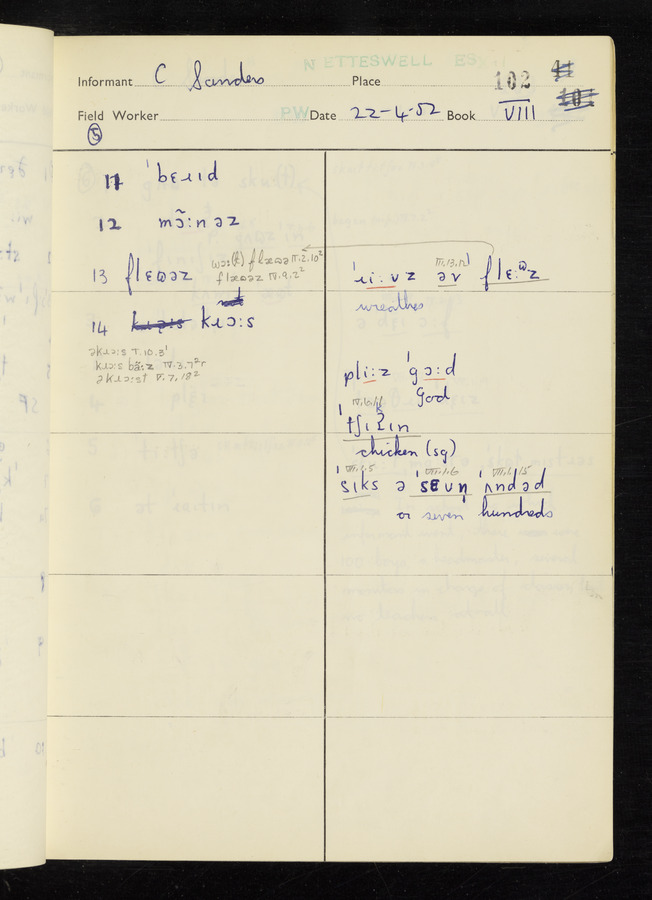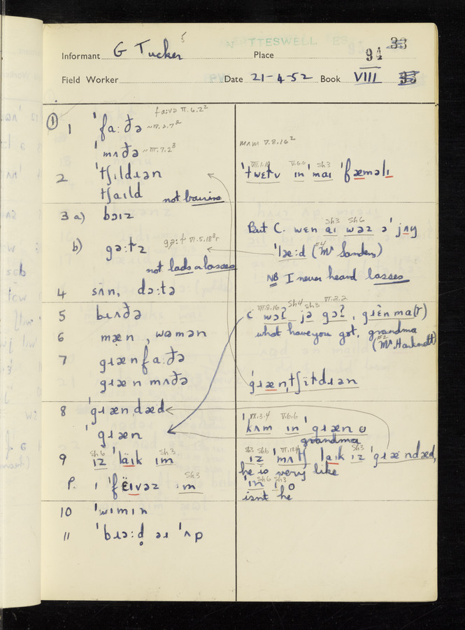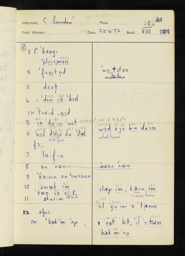 The answers of informant George Tucker and Charles Sanders recorded by fieldworker Peter Wright in the International Phonetic Alphabet.