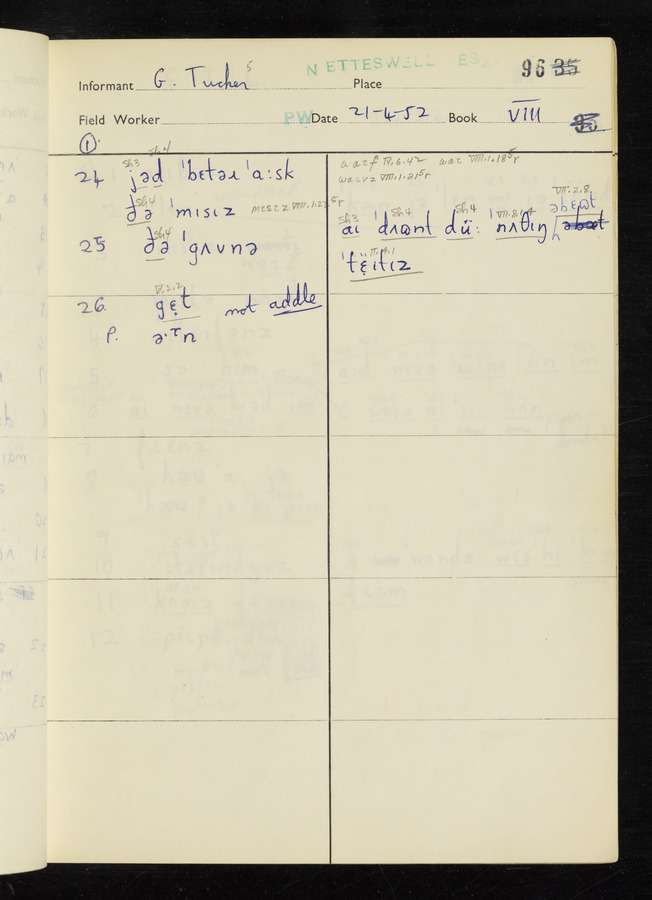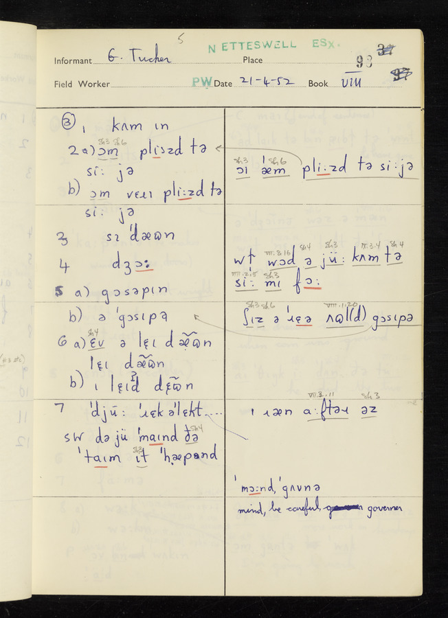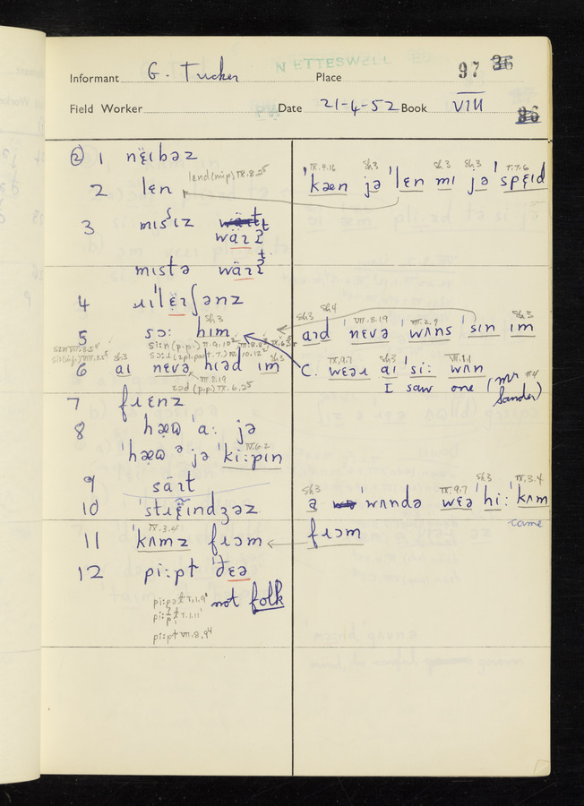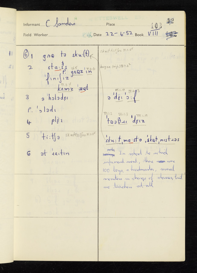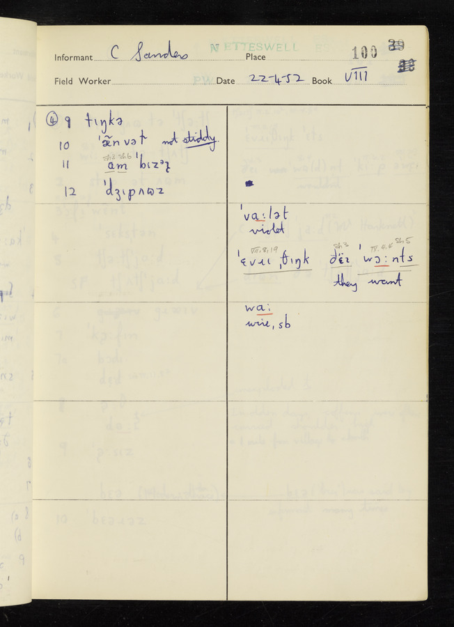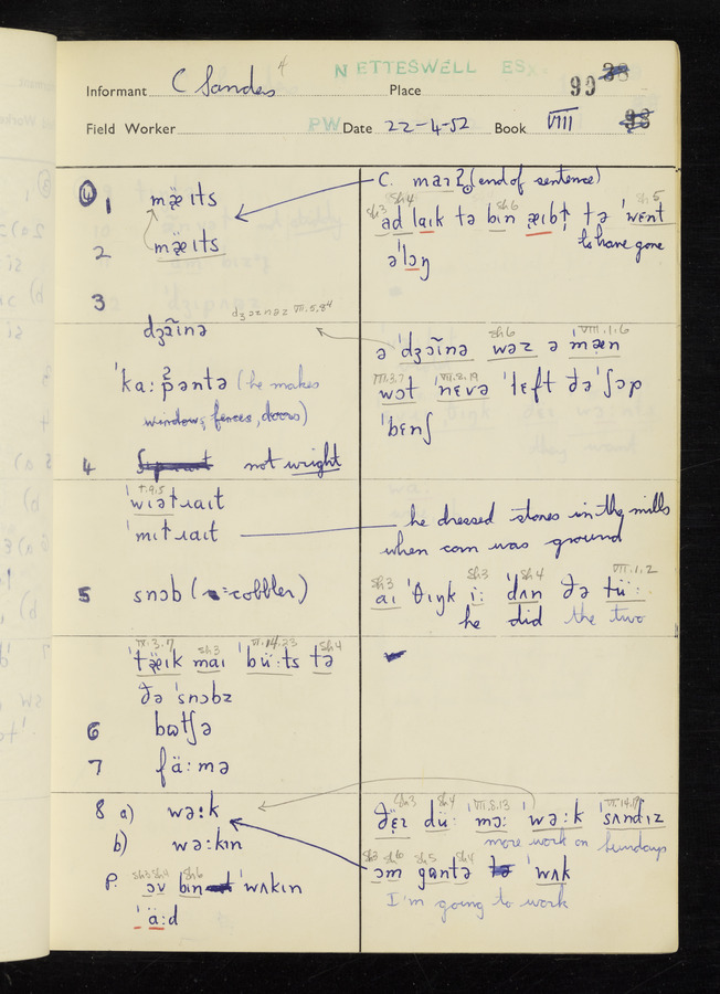 The answers of informant George Tucker and Charles Sanders recorded by fieldworker Peter Wright in the International Phonetic Alphabet.