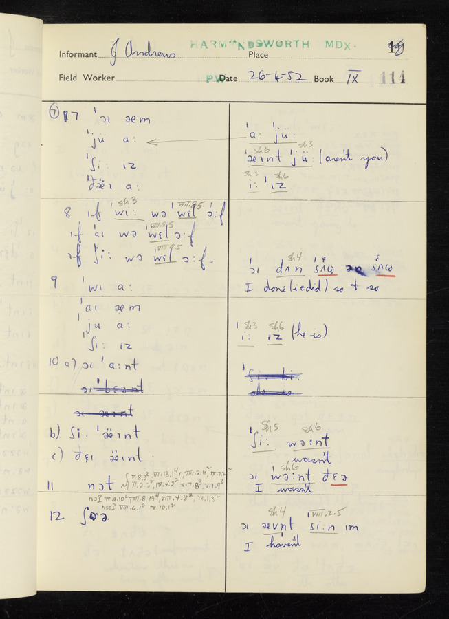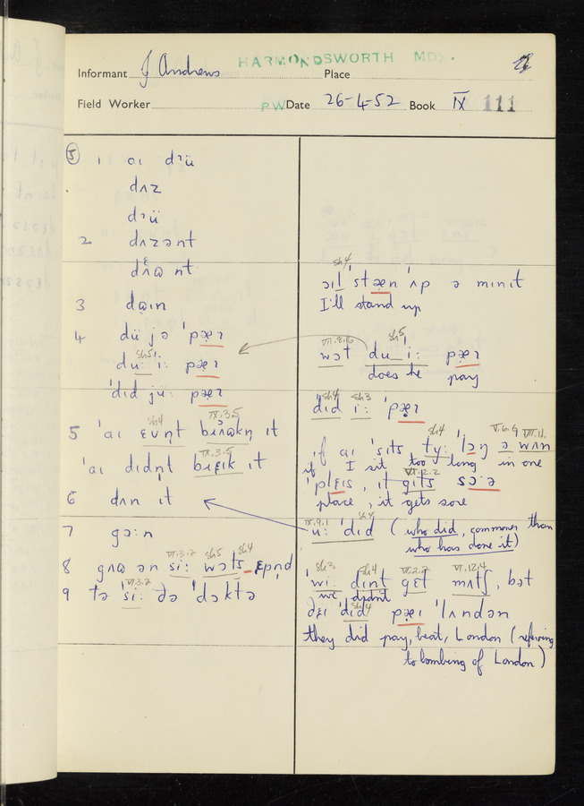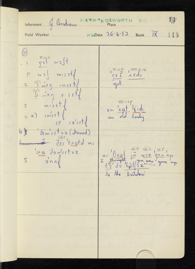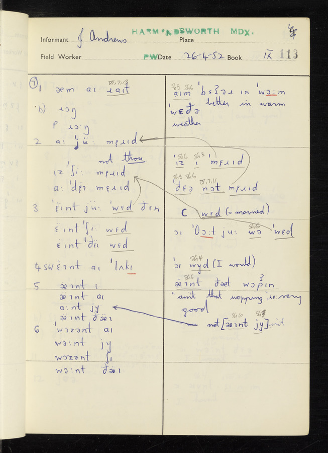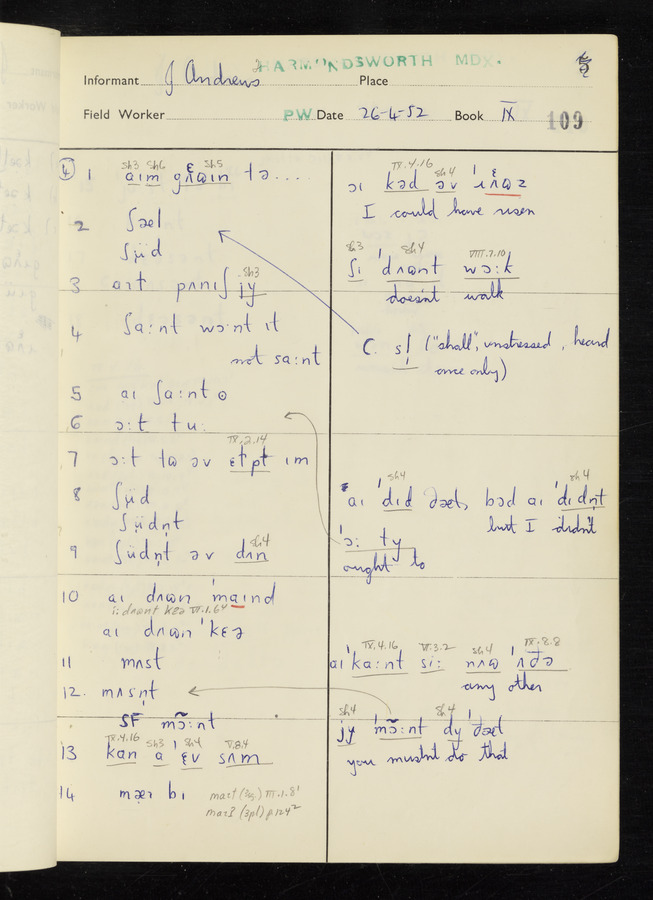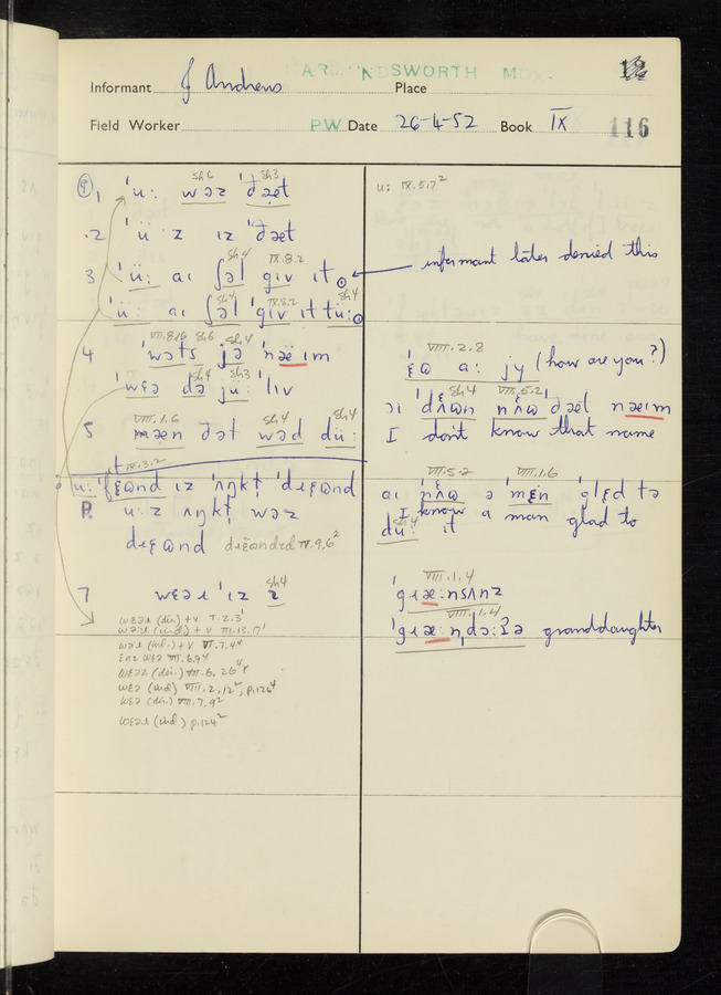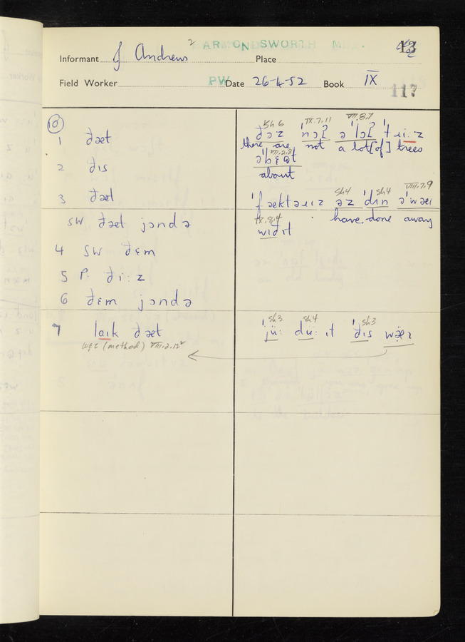 The answers of informant John Andrews recorded by fieldworker Peter Wright in the International Phonetic Alphabet.