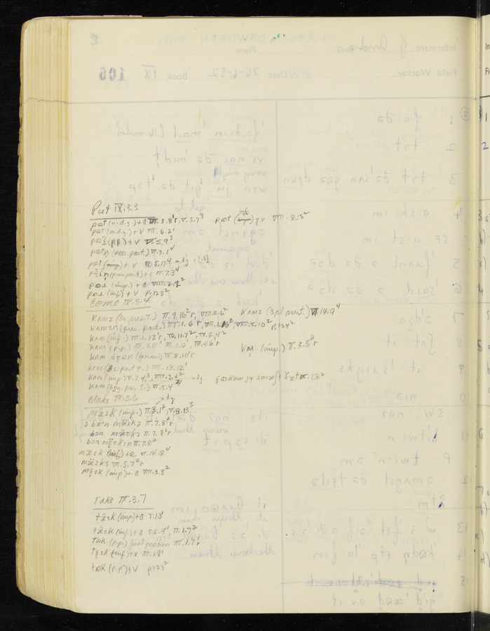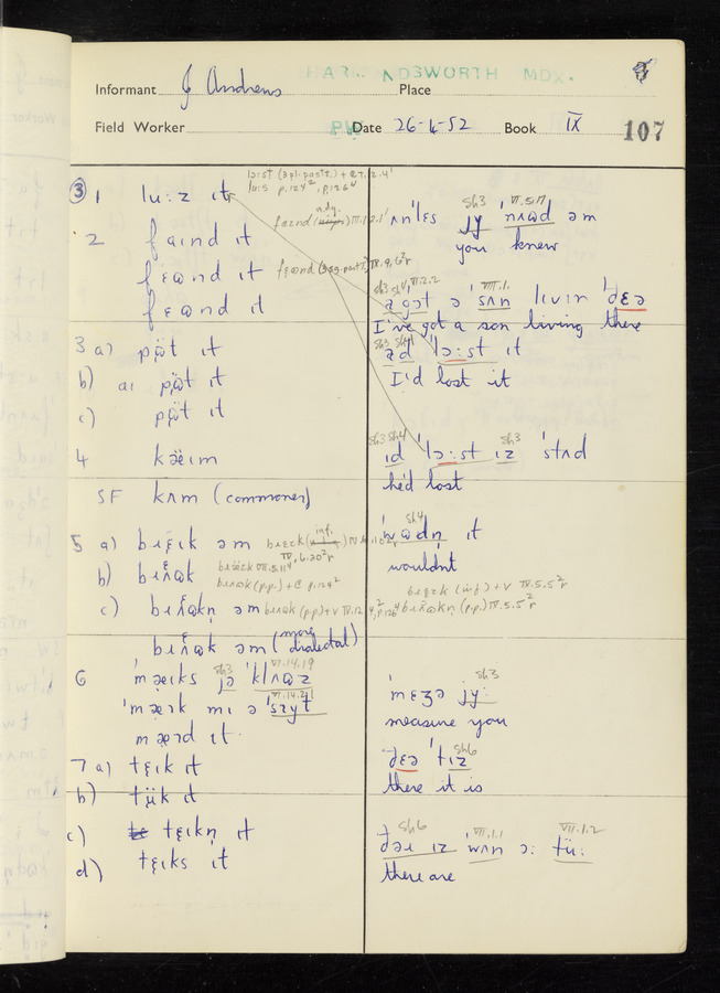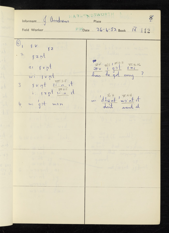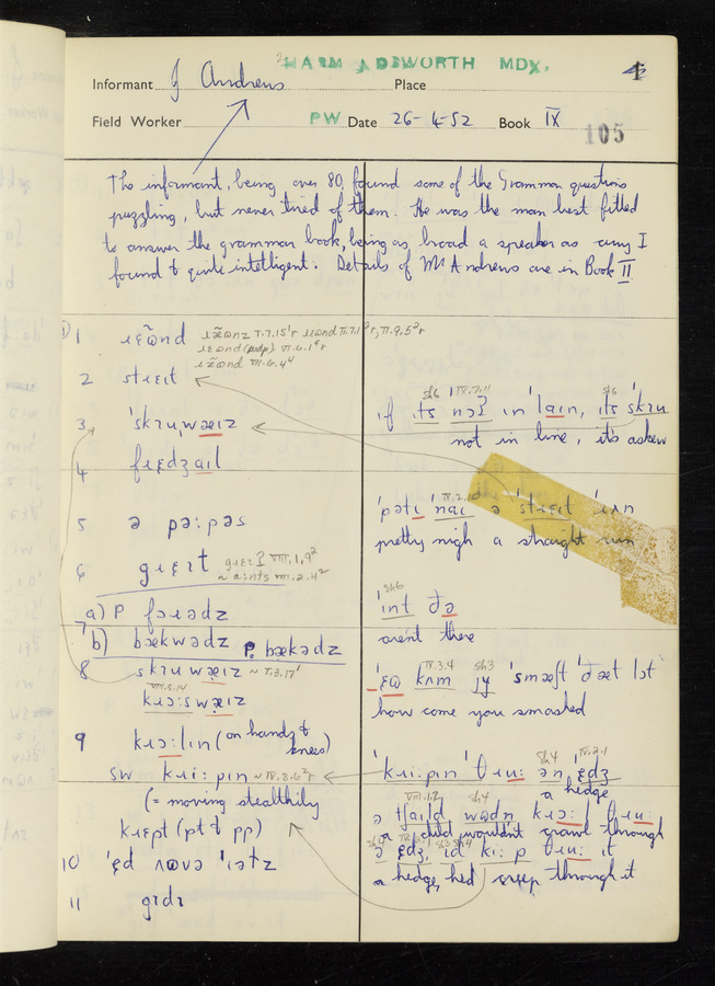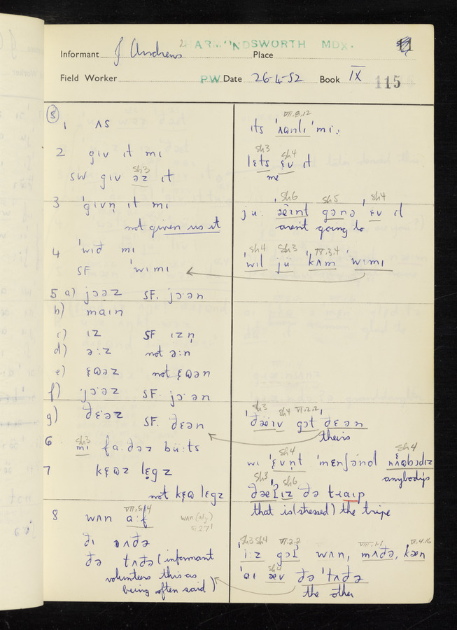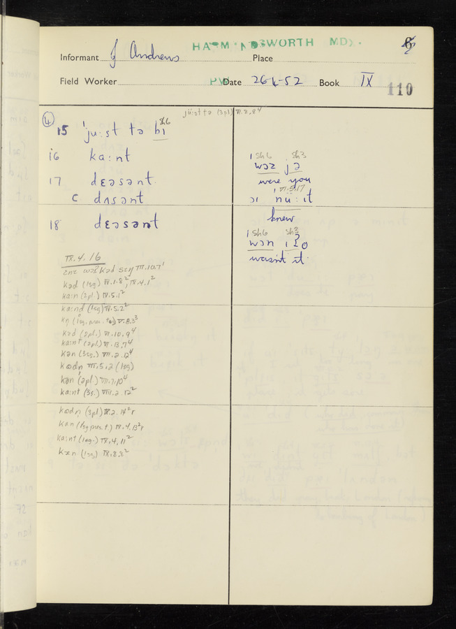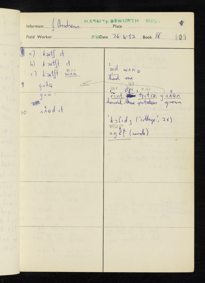 The answers of informant John Andrews recorded by fieldworker Peter Wright in the International Phonetic Alphabet.
