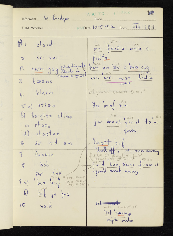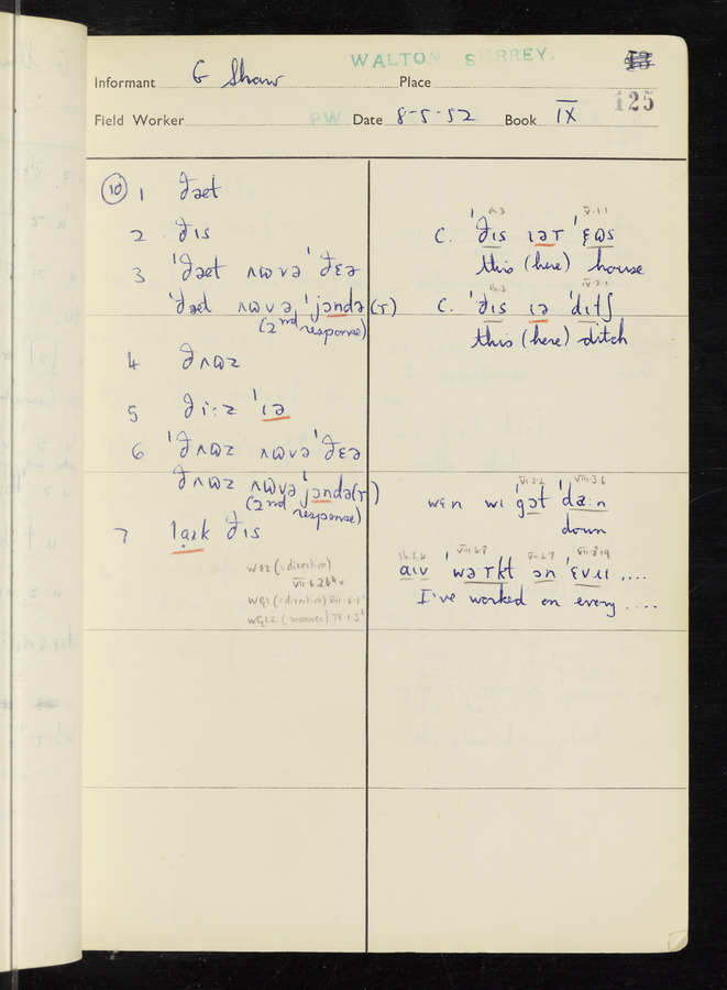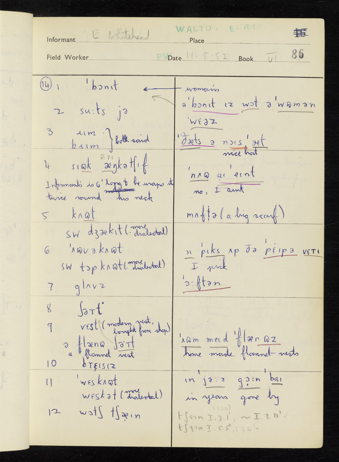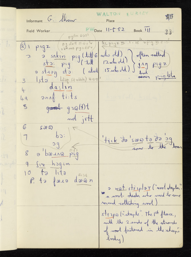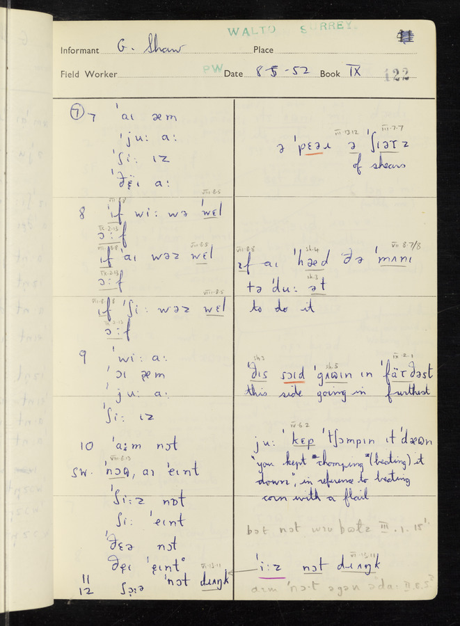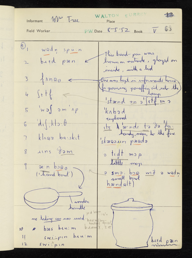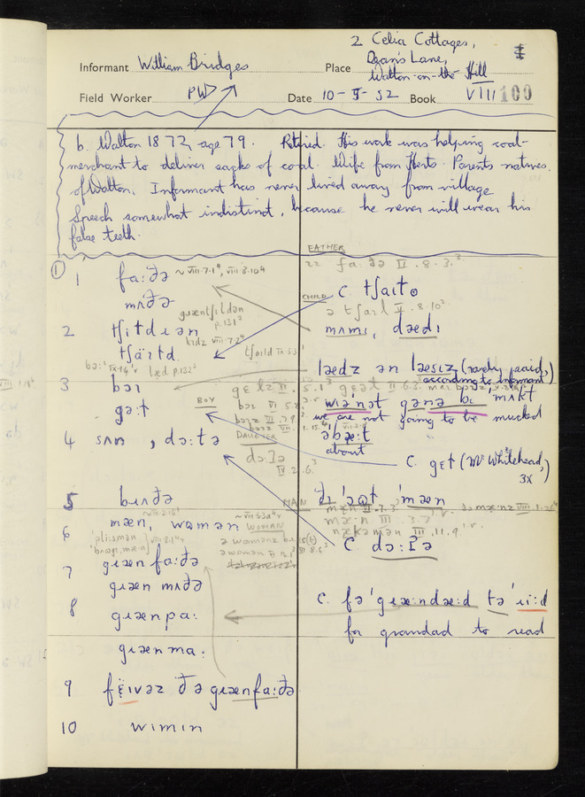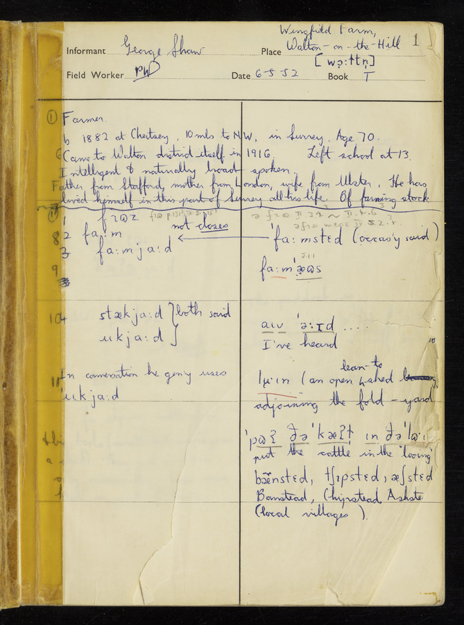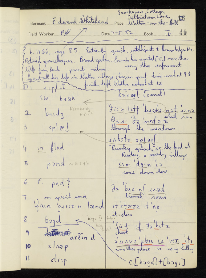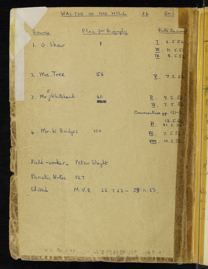 Interviews have been carried out by fieldworker Peter Wright. There are four informants for this response book - George Shaw, Mrs Tree, Edward Whitehead and William Bridges. Their responses can be found in the following books: George Shaw - I, III, IX Mrs Tree - V Edward Whitehead - II, IV William Bridges - VI, VII, VIII
