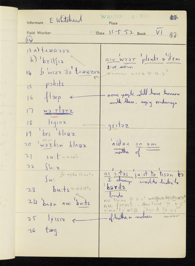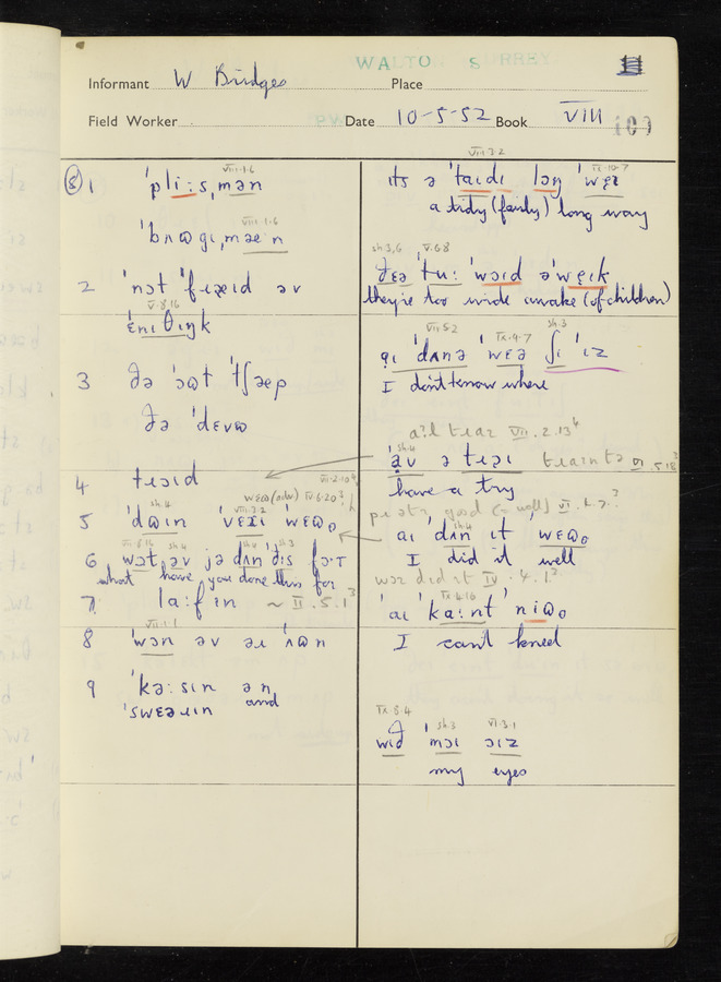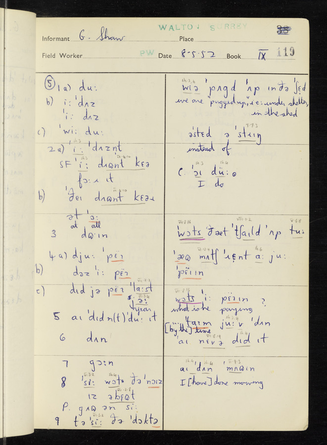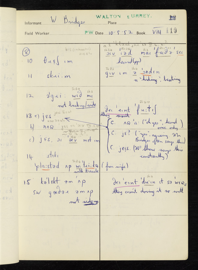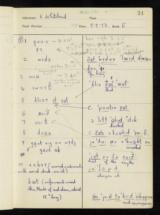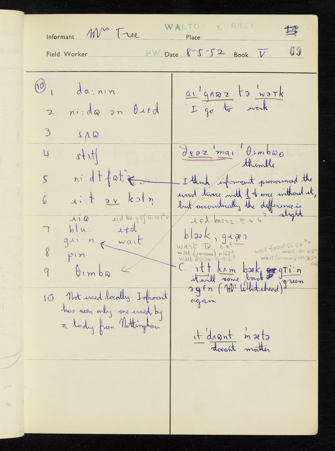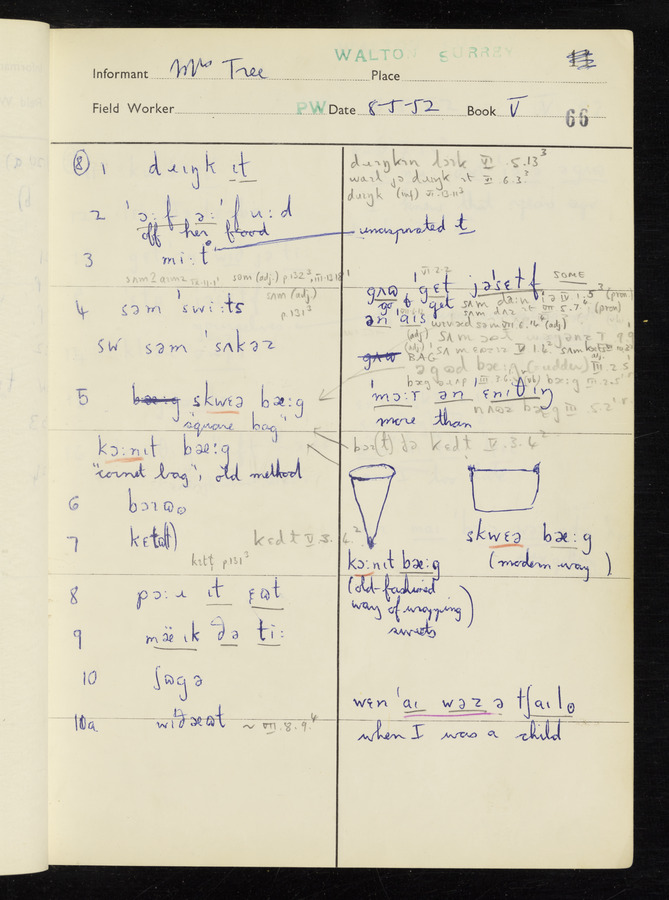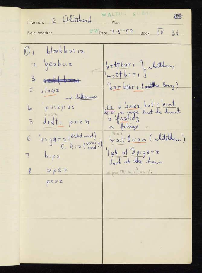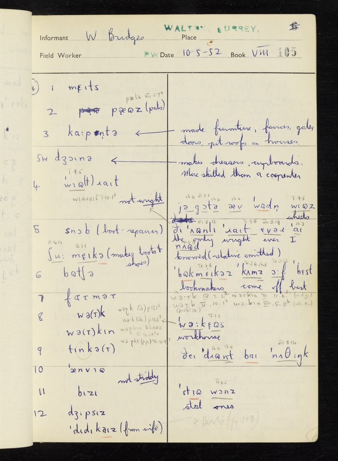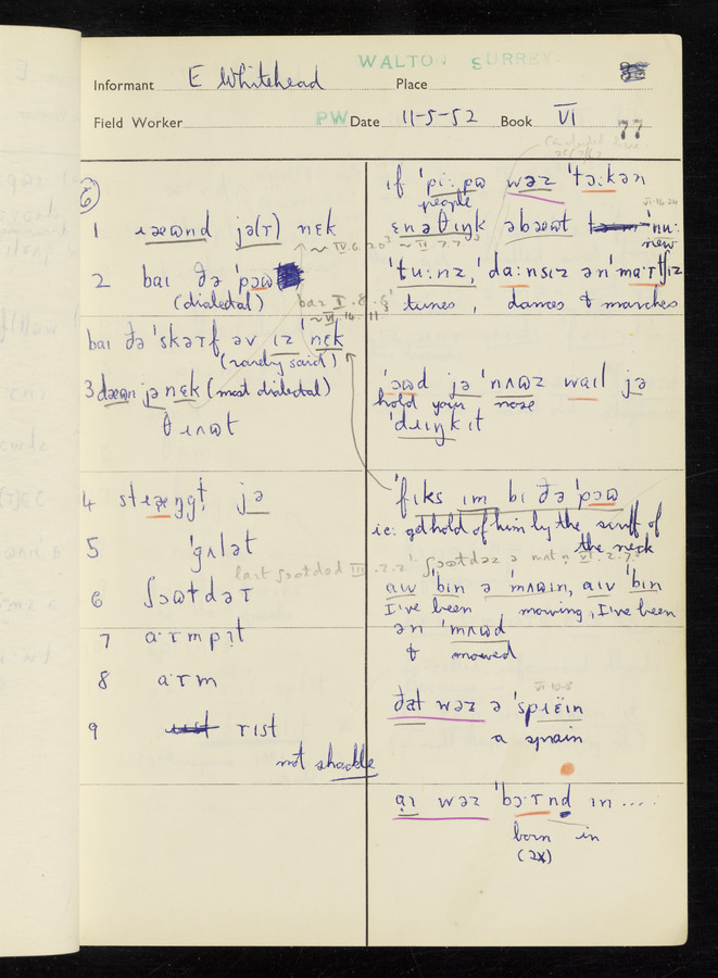 Interviews have been carried out by fieldworker Peter Wright. There are four informants for this response book - George Shaw, Mrs Tree, Edward Whitehead and William Bridges. Their responses can be found in the following books: George Shaw - I, III, IX Mrs Tree - V Edward Whitehead - II, IV William Bridges - VI, VII, VIII