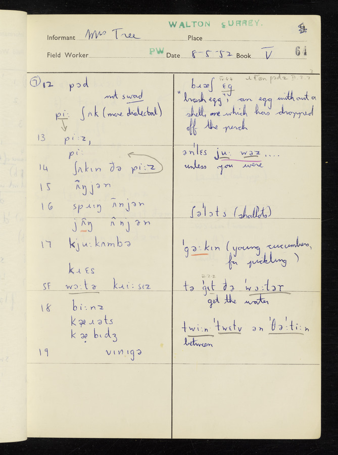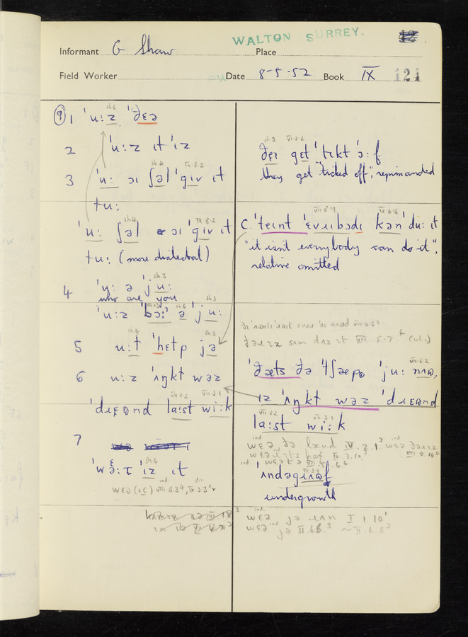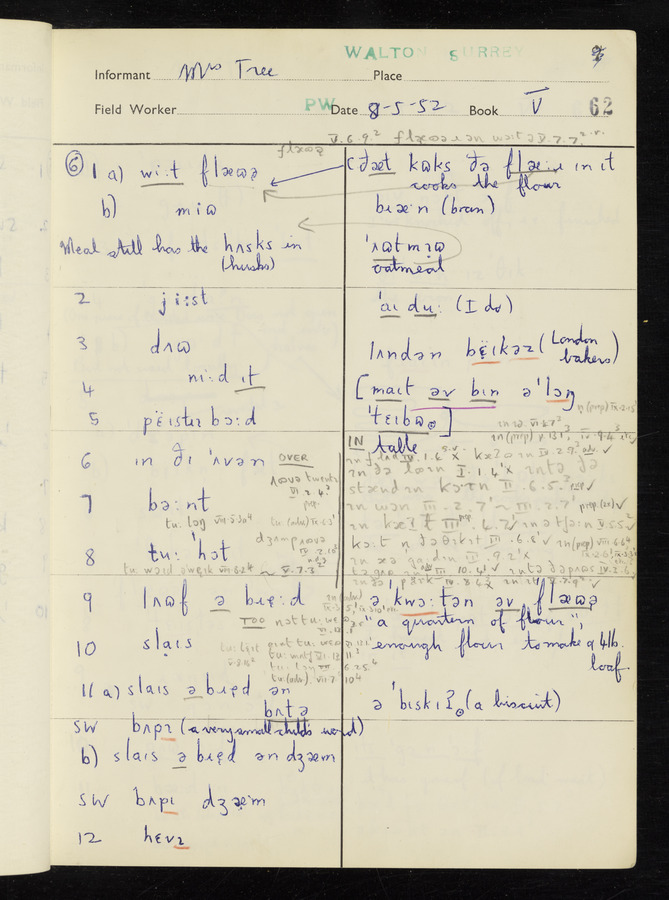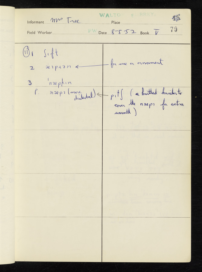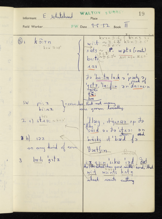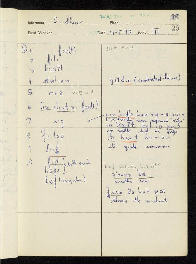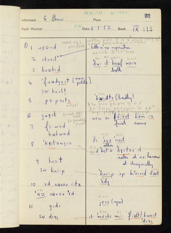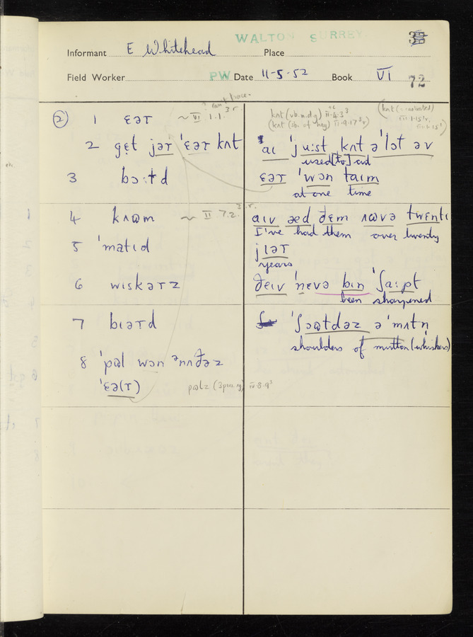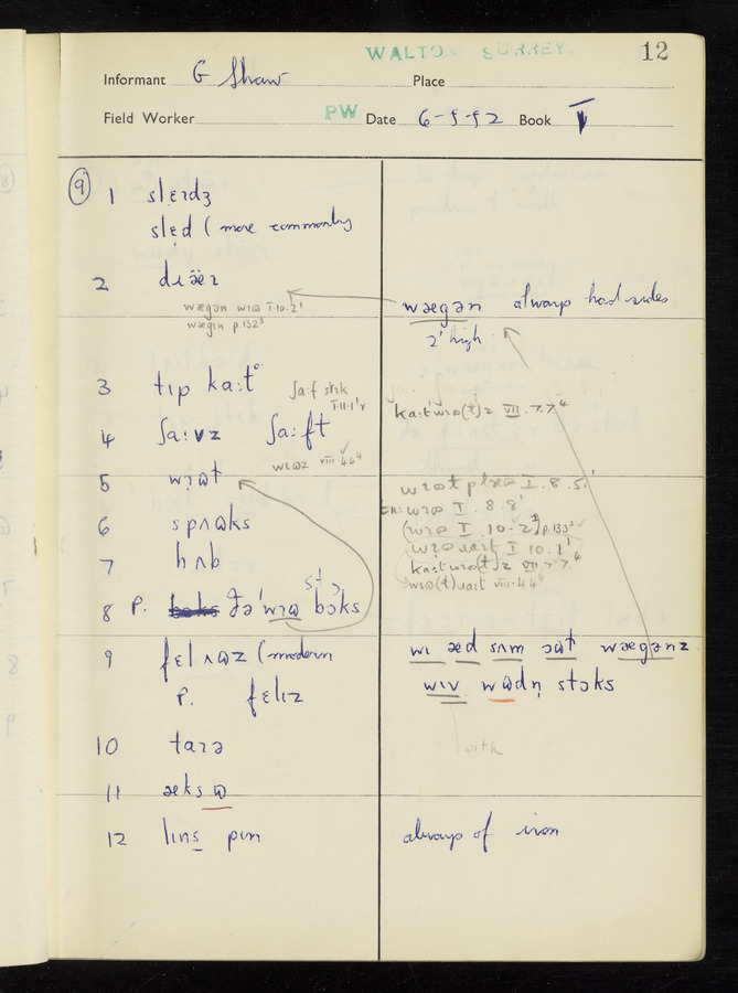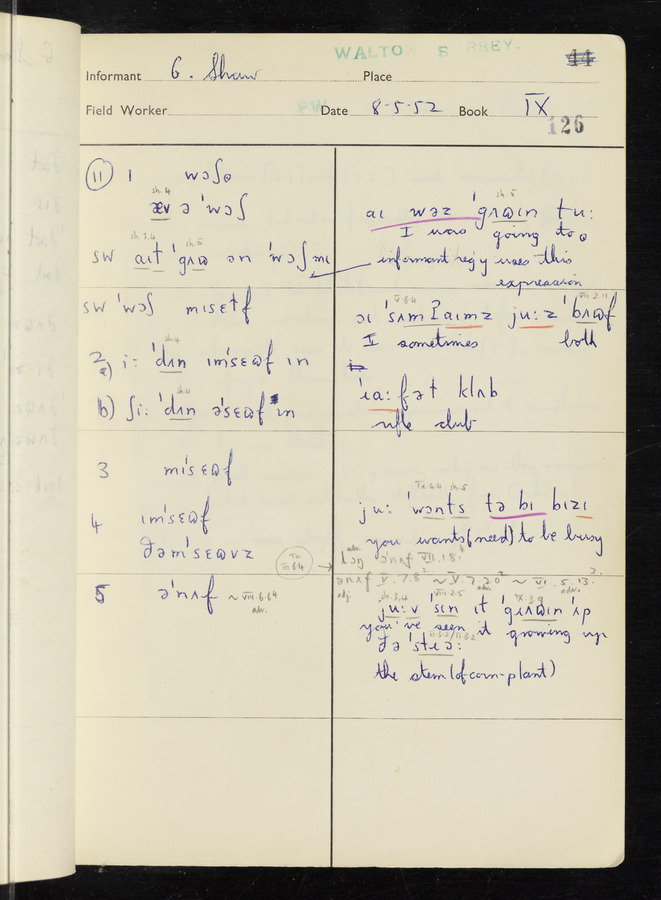 Interviews have been carried out by fieldworker Peter Wright. There are four informants for this response book - George Shaw, Mrs Tree, Edward Whitehead and William Bridges. Their responses can be found in the following books: George Shaw - I, III, IX Mrs Tree - V Edward Whitehead - II, IV William Bridges - VI, VII, VIII