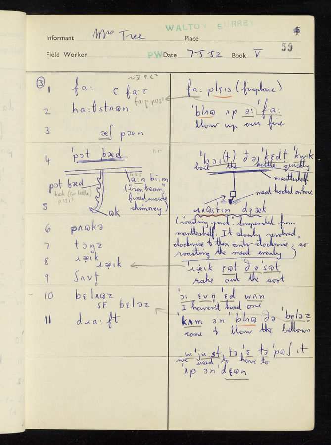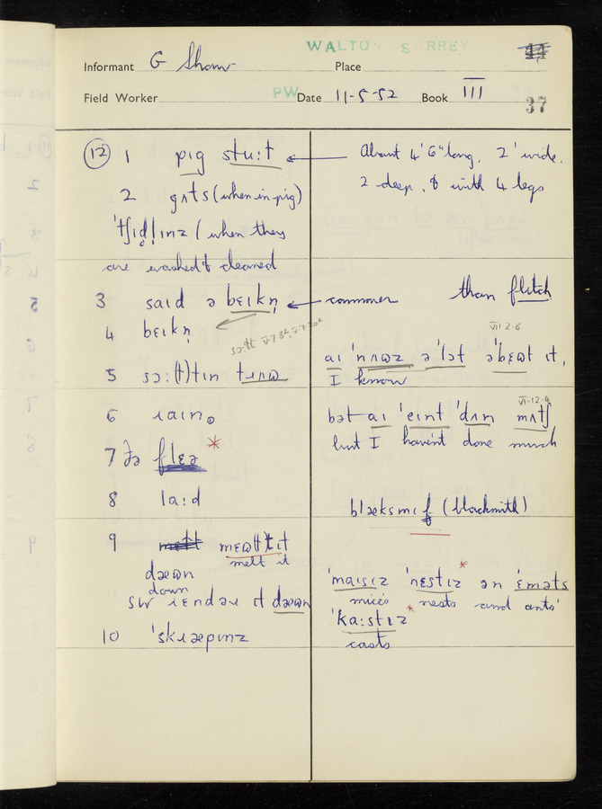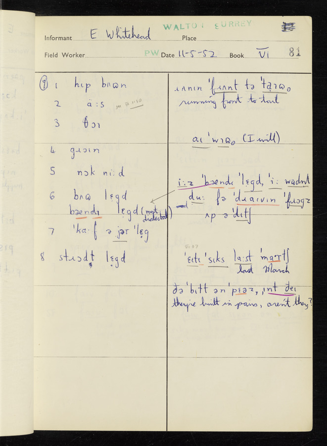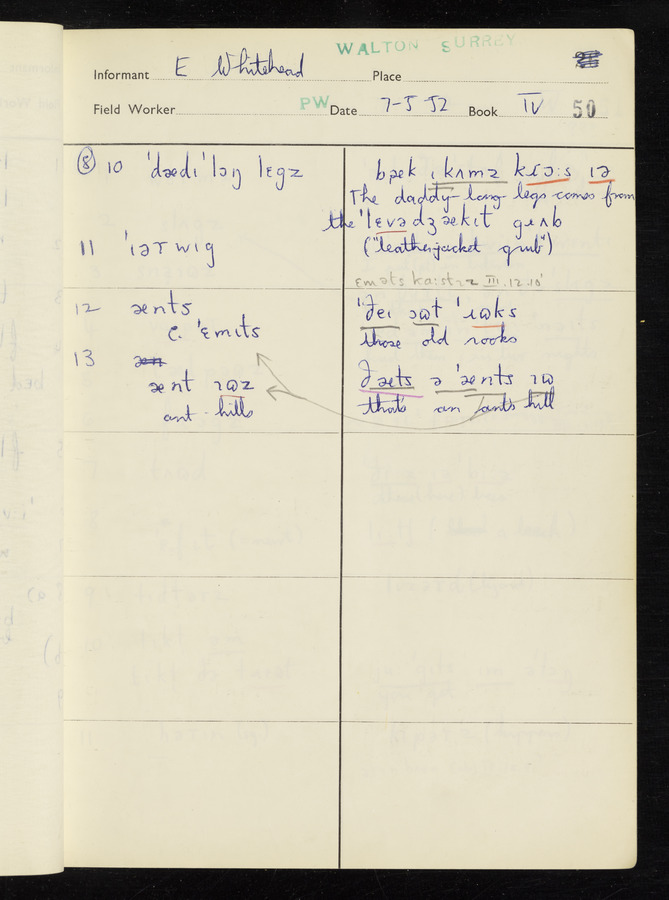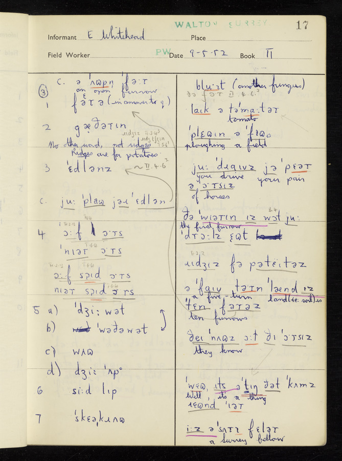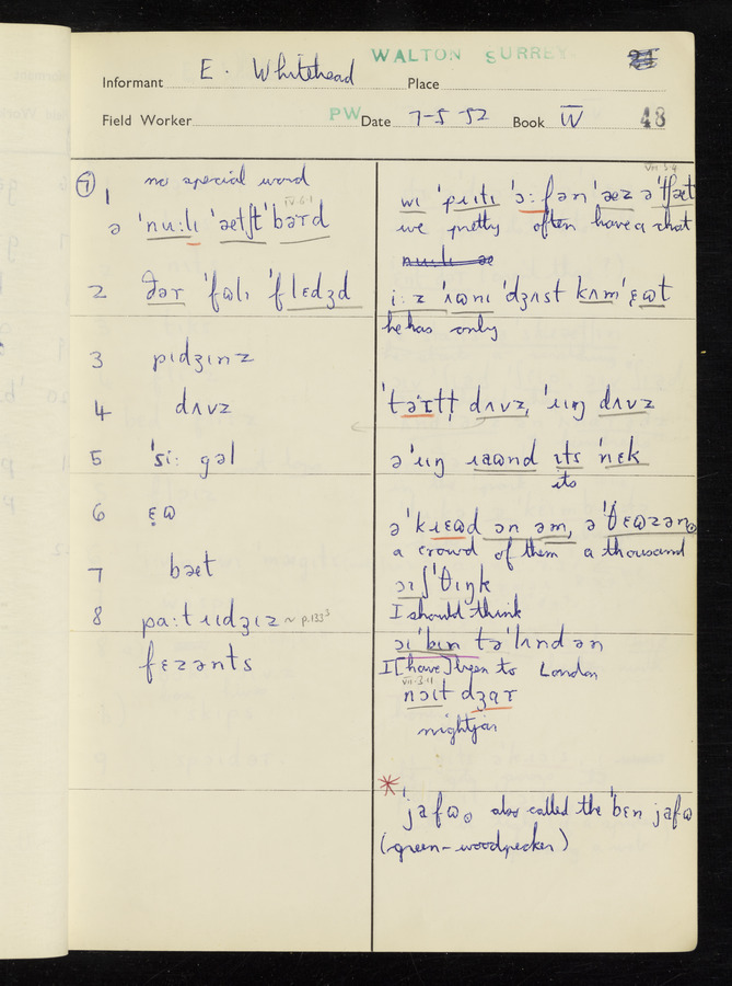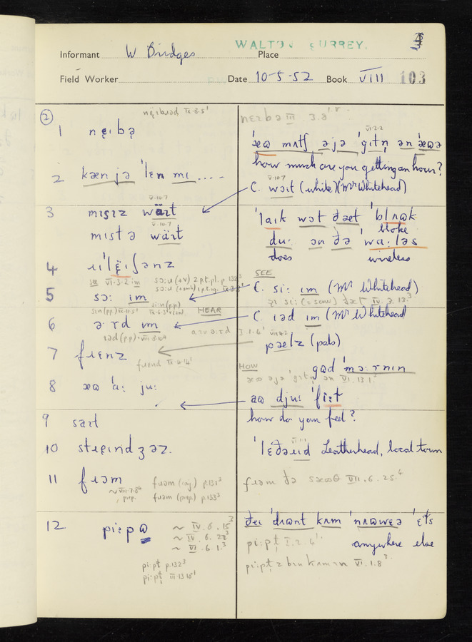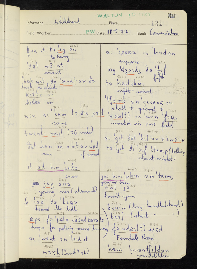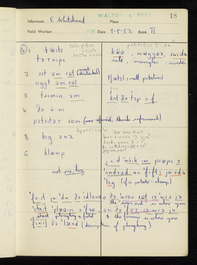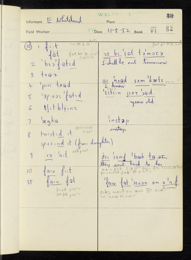Interviews have been carried out by fieldworker Peter Wright. There are four informants for this response book - George Shaw, Mrs Tree, Edward Whitehead and William Bridges. Their responses can be found in the following books: George Shaw - I, III, IX Mrs Tree - V Edward Whitehead - II, IV William Bridges - VI, VII, VIII