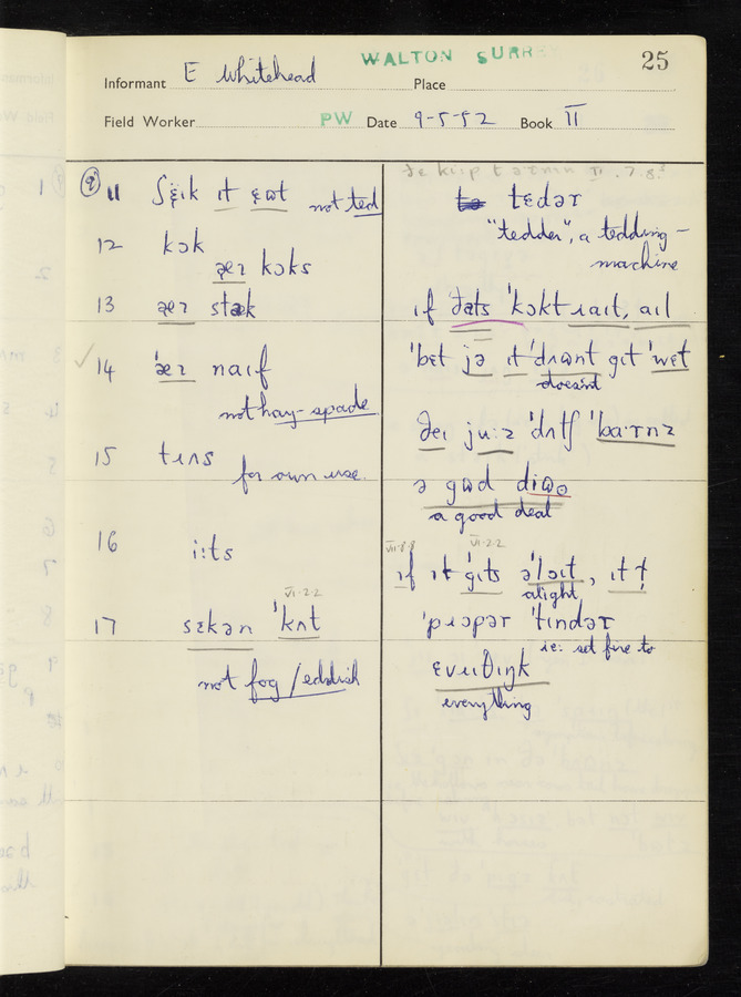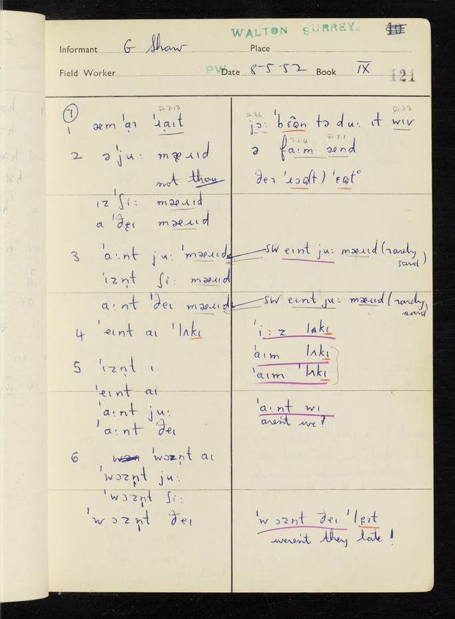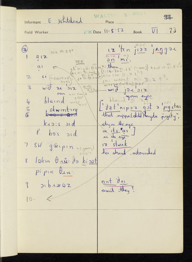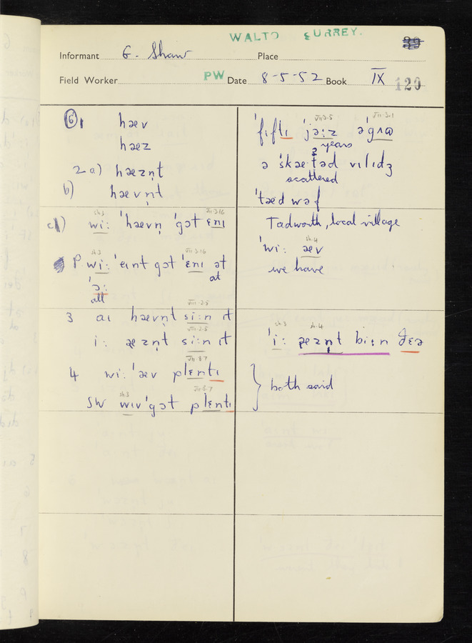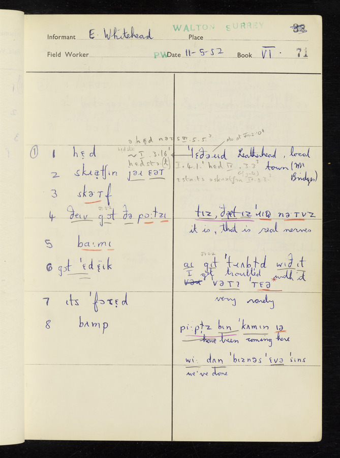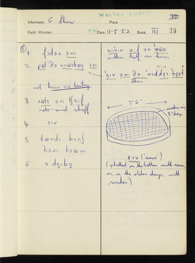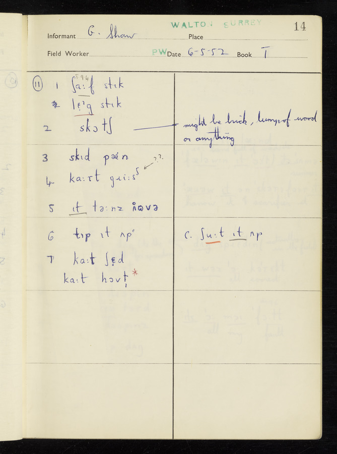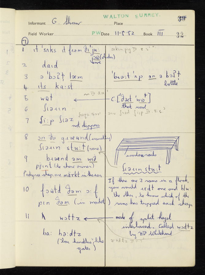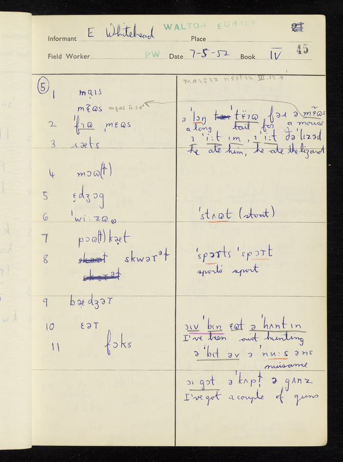 Interviews have been carried out by fieldworker Peter Wright. There are four informants for this response book - George Shaw, Mrs Tree, Edward Whitehead and William Bridges. Their responses can be found in the following books: George Shaw - I, III, IX Mrs Tree - V Edward Whitehead - II, IV William Bridges - VI, VII, VIII