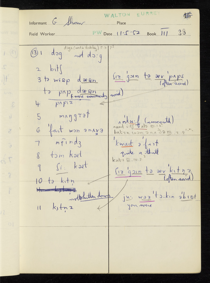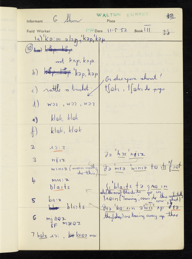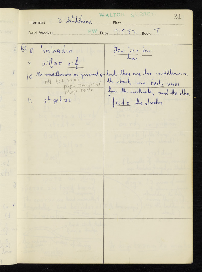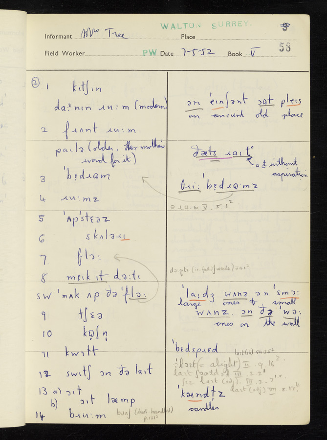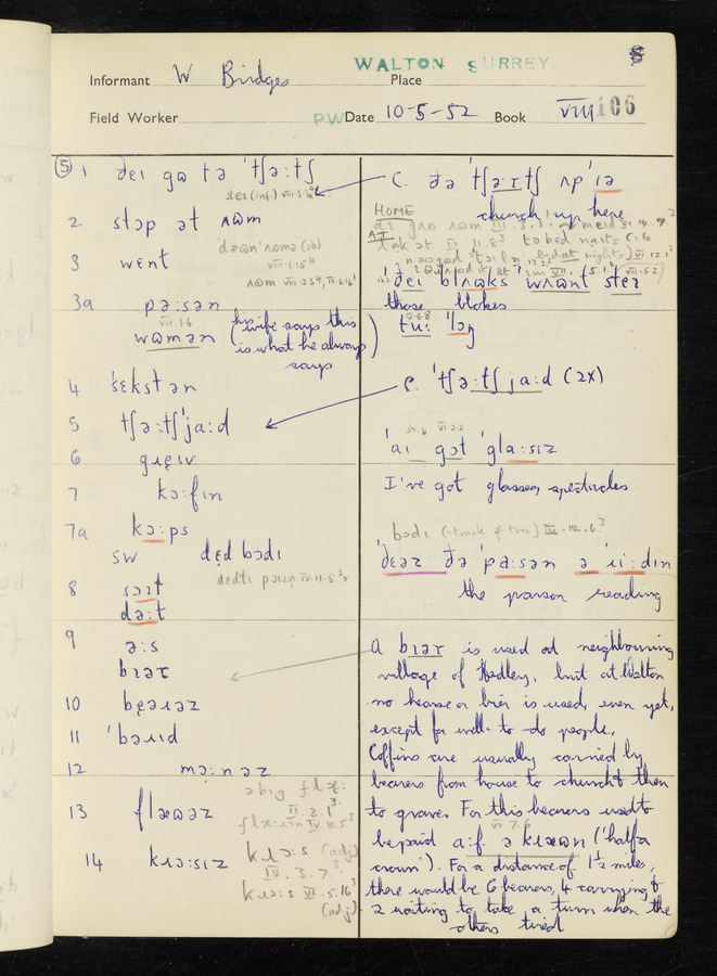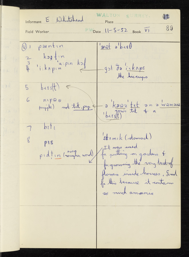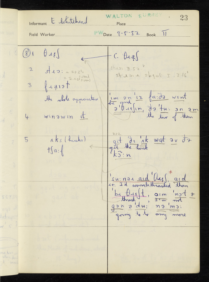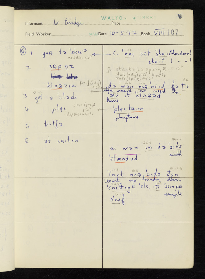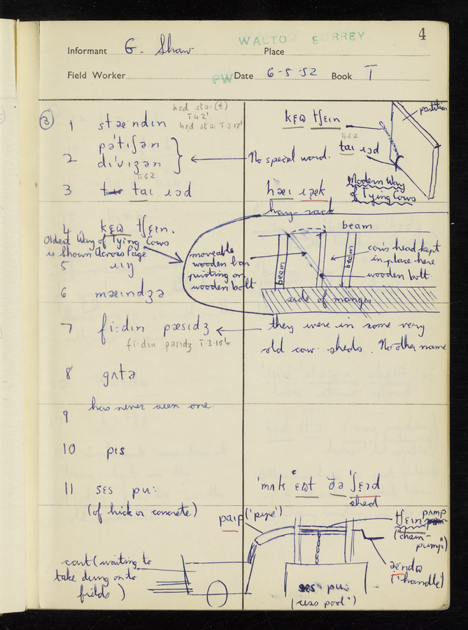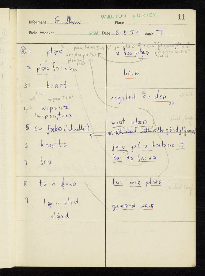 Interviews have been carried out by fieldworker Peter Wright. There are four informants for this response book - George Shaw, Mrs Tree, Edward Whitehead and William Bridges. Their responses can be found in the following books: George Shaw - I, III, IX Mrs Tree - V Edward Whitehead - II, IV William Bridges - VI, VII, VIII
