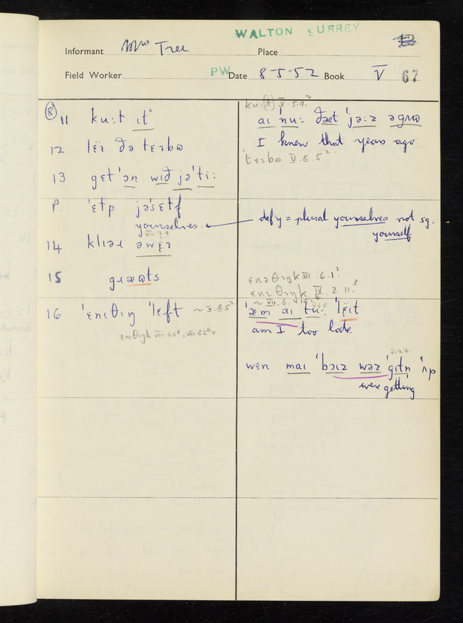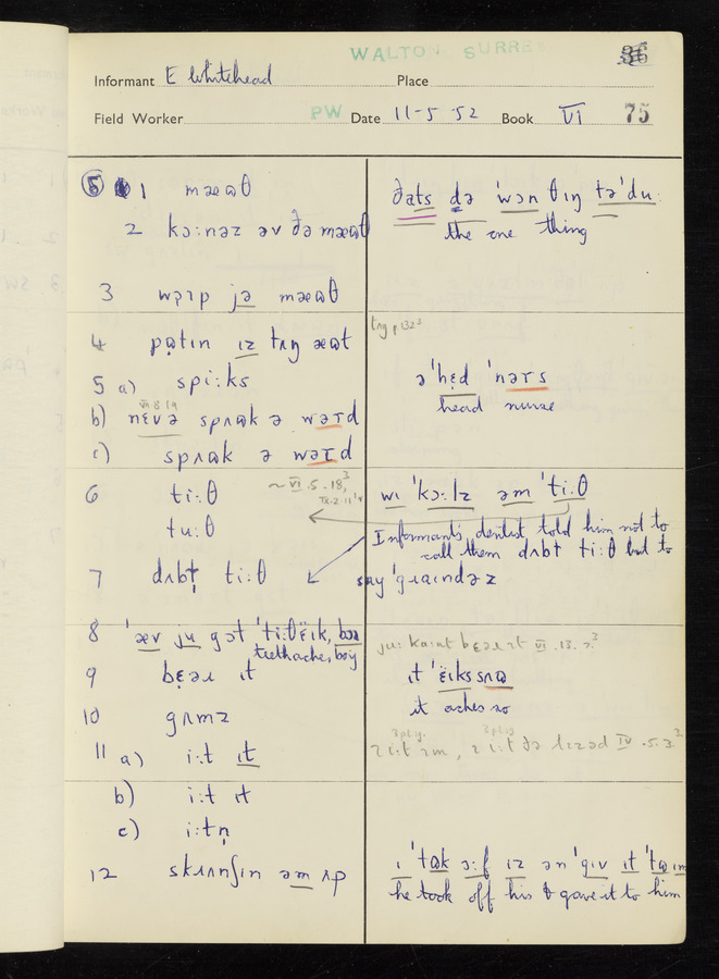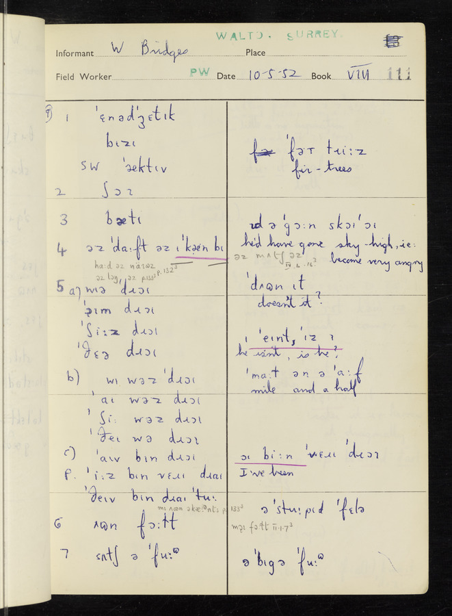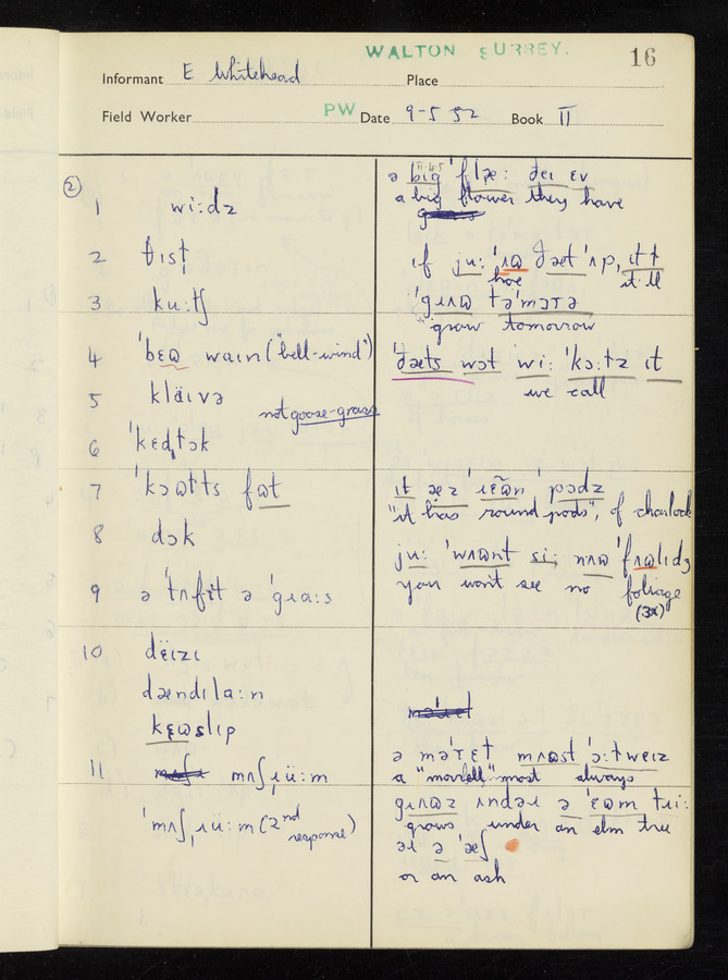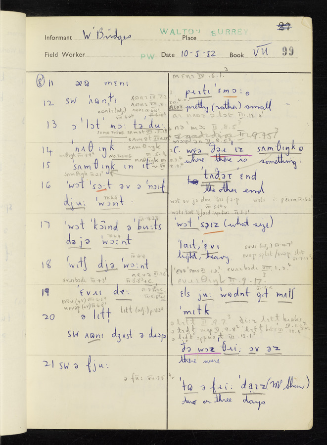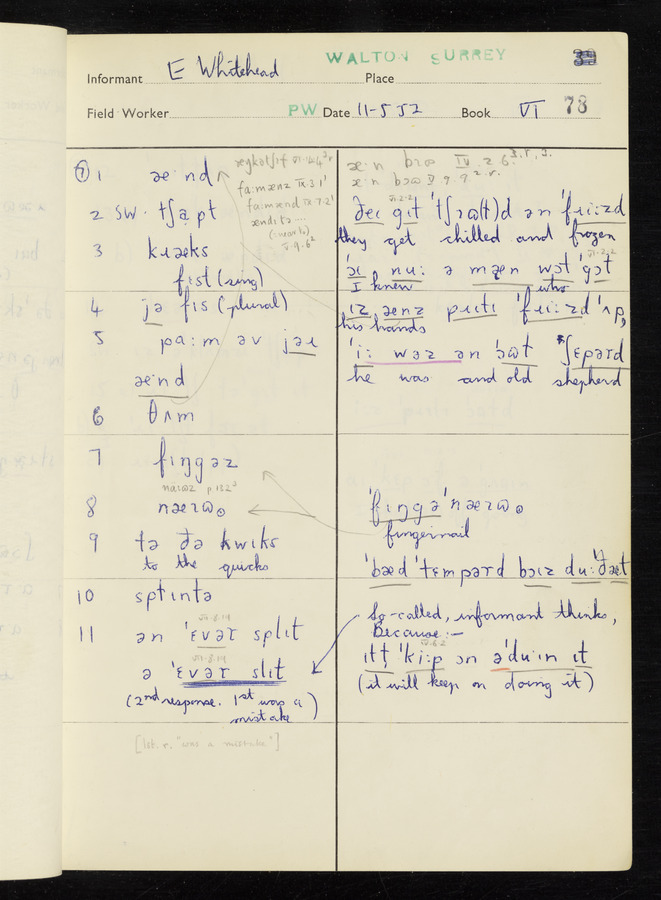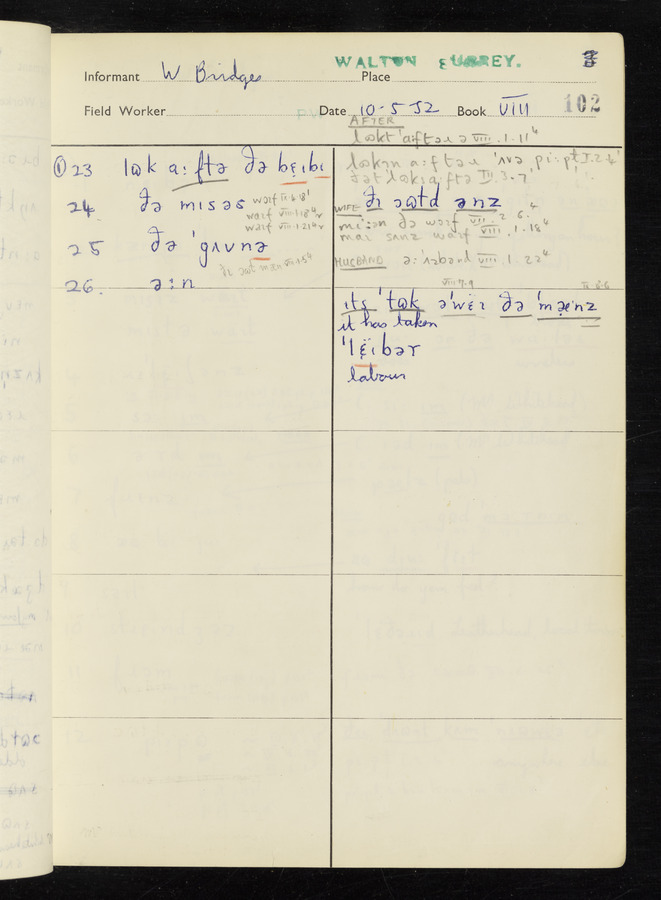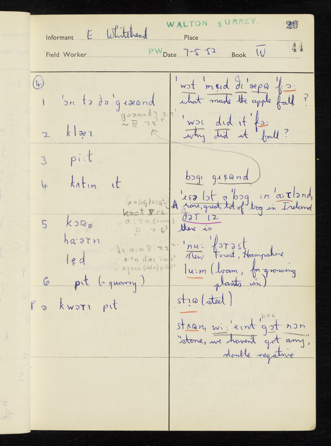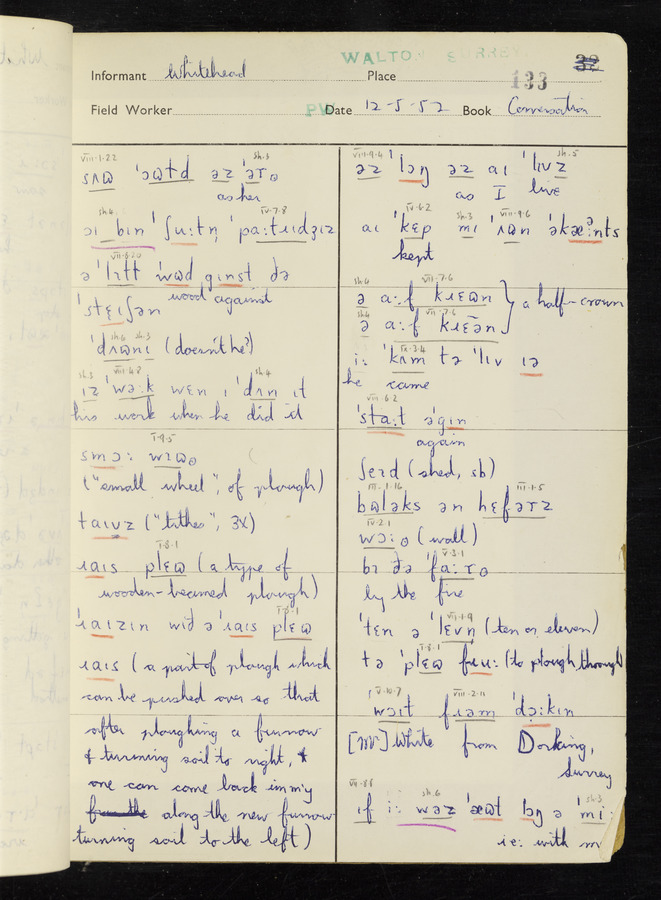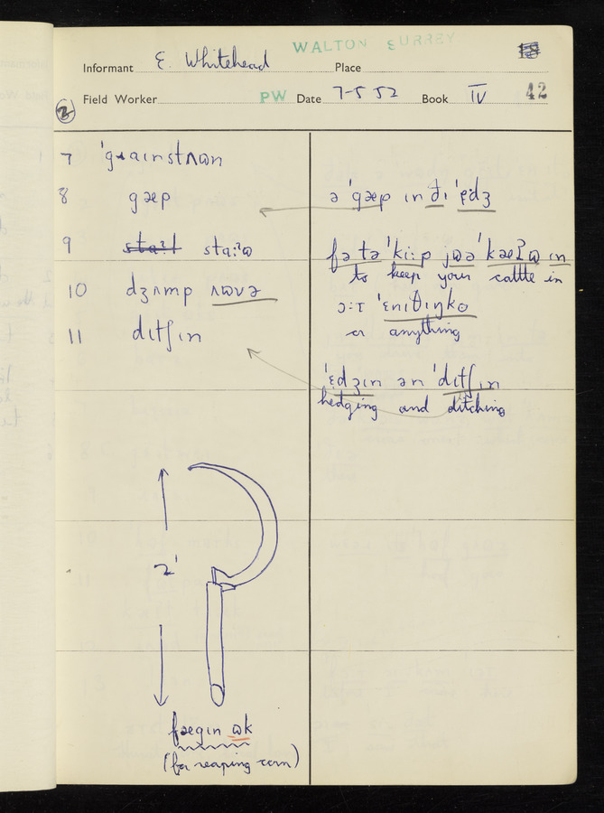 Interviews have been carried out by fieldworker Peter Wright. There are four informants for this response book - George Shaw, Mrs Tree, Edward Whitehead and William Bridges. Their responses can be found in the following books: George Shaw - I, III, IX Mrs Tree - V Edward Whitehead - II, IV William Bridges - VI, VII, VIII