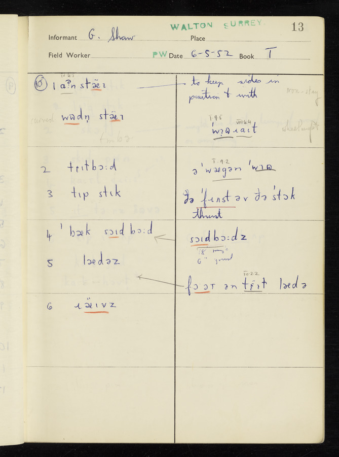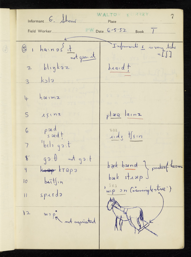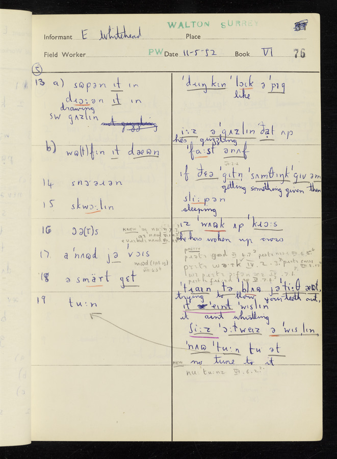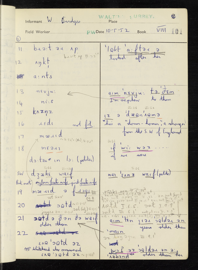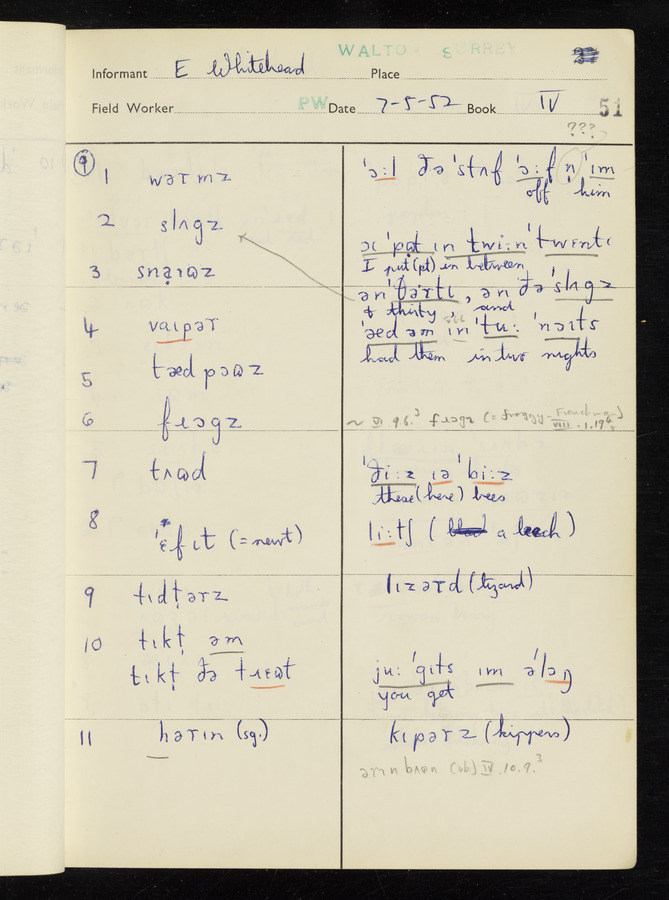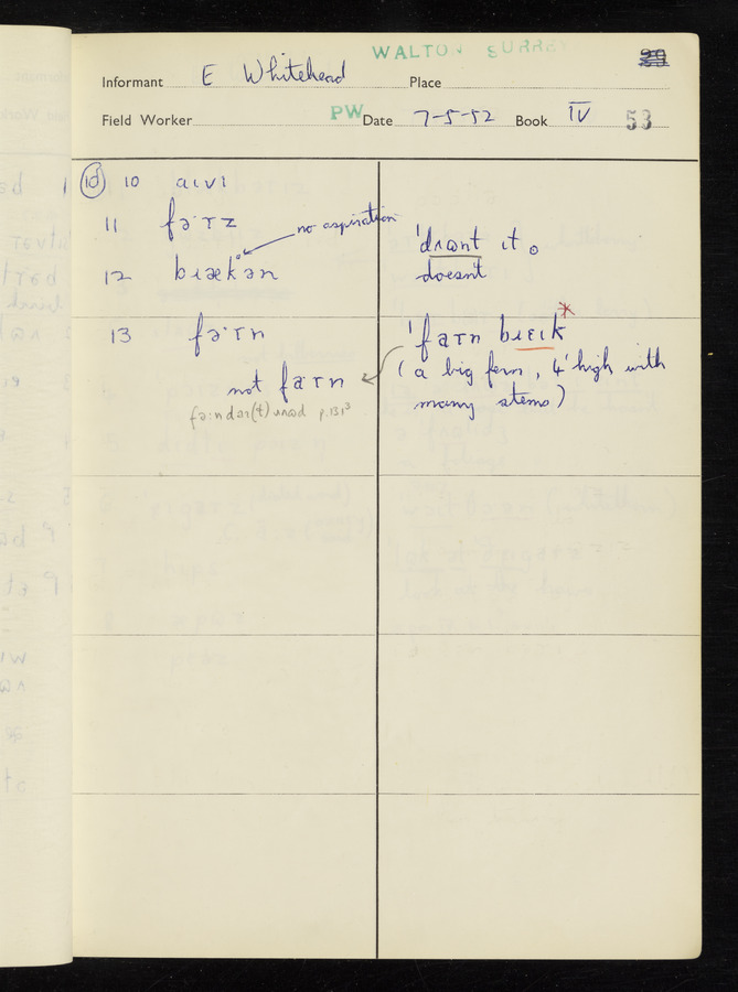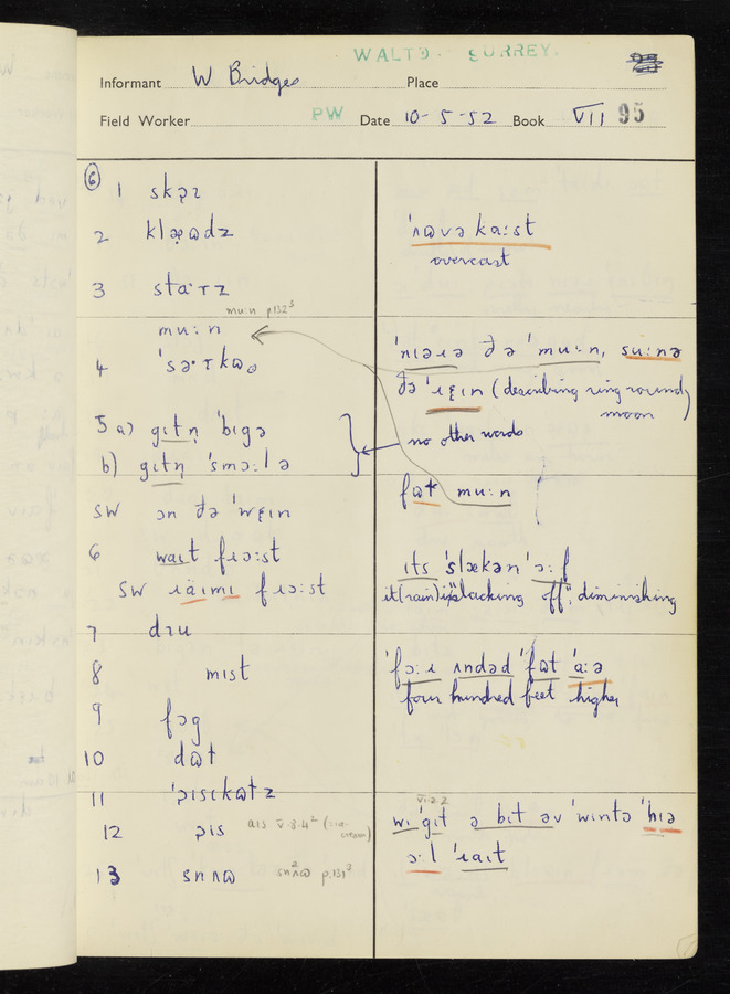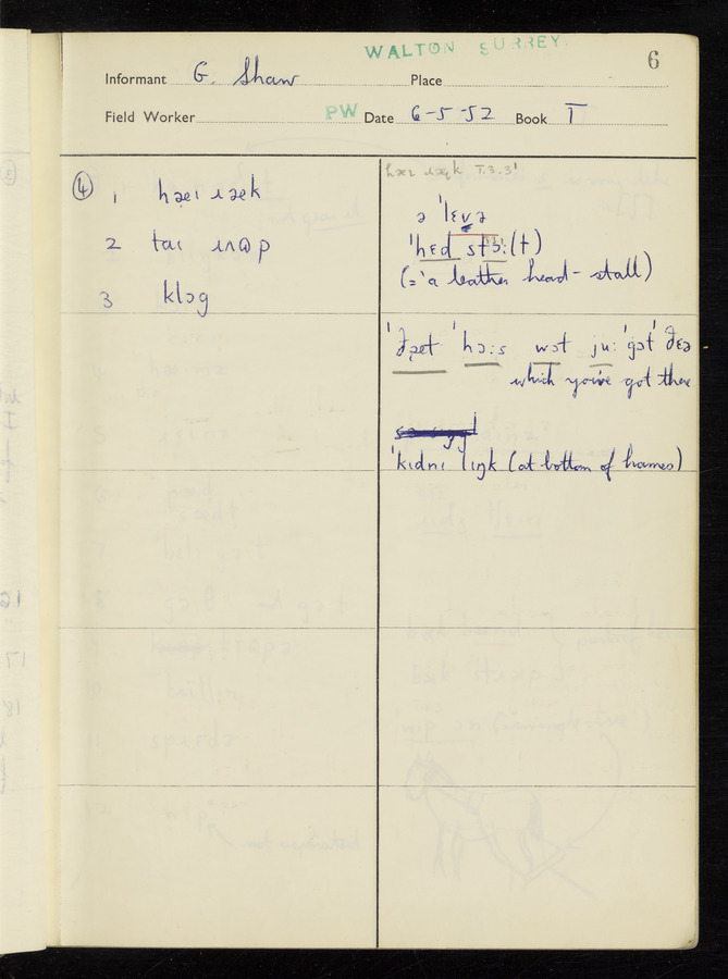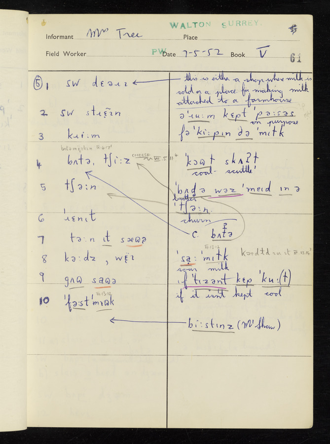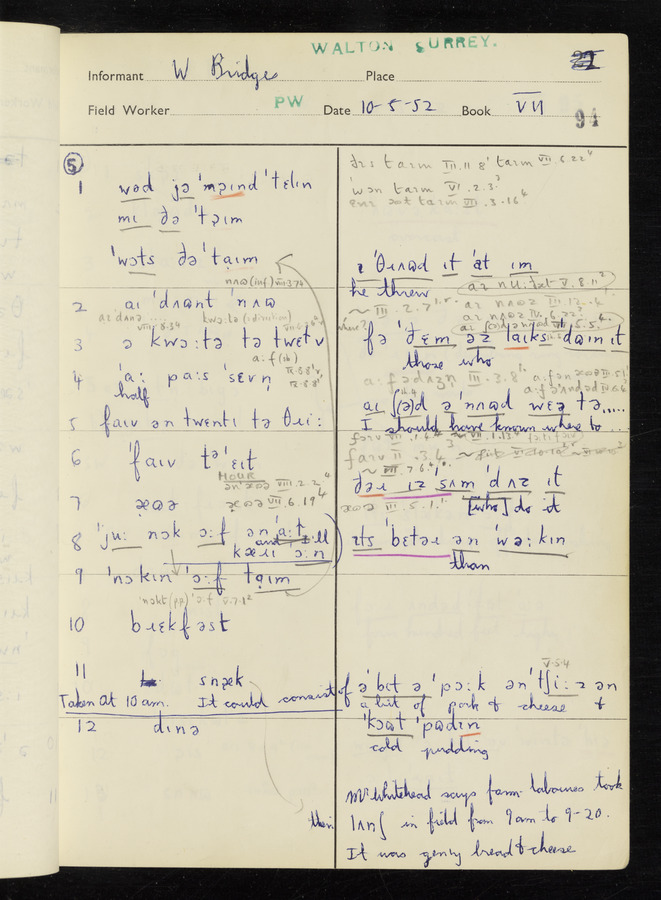 Interviews have been carried out by fieldworker Peter Wright. There are four informants for this response book - George Shaw, Mrs Tree, Edward Whitehead and William Bridges. Their responses can be found in the following books: George Shaw - I, III, IX Mrs Tree - V Edward Whitehead - II, IV William Bridges - VI, VII, VIII
