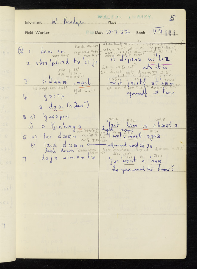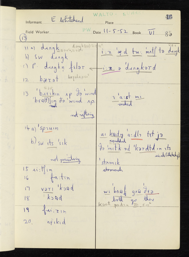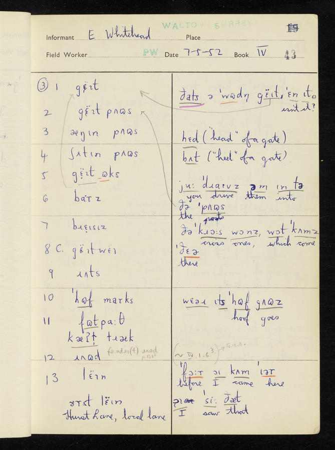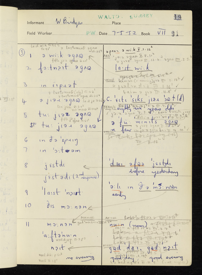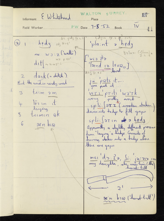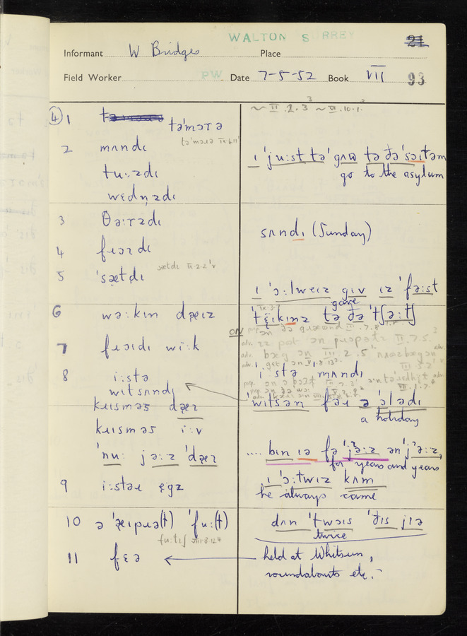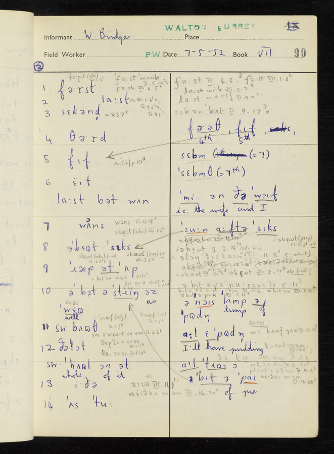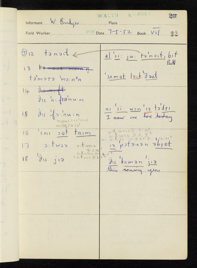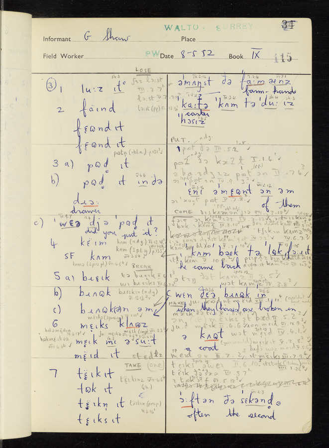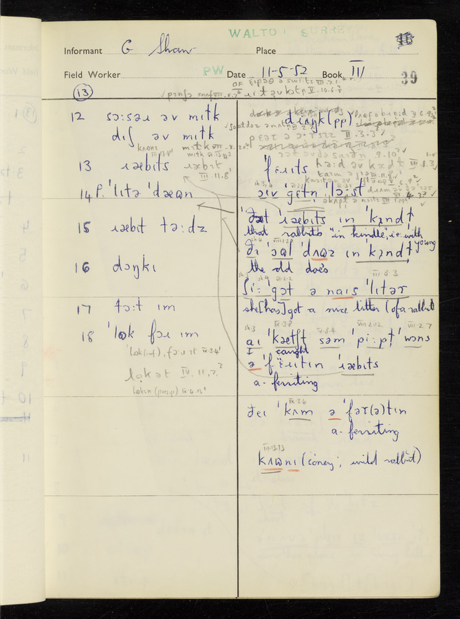 Interviews have been carried out by fieldworker Peter Wright. There are four informants for this response book - George Shaw, Mrs Tree, Edward Whitehead and William Bridges. Their responses can be found in the following books: George Shaw - I, III, IX Mrs Tree - V Edward Whitehead - II, IV William Bridges - VI, VII, VIII