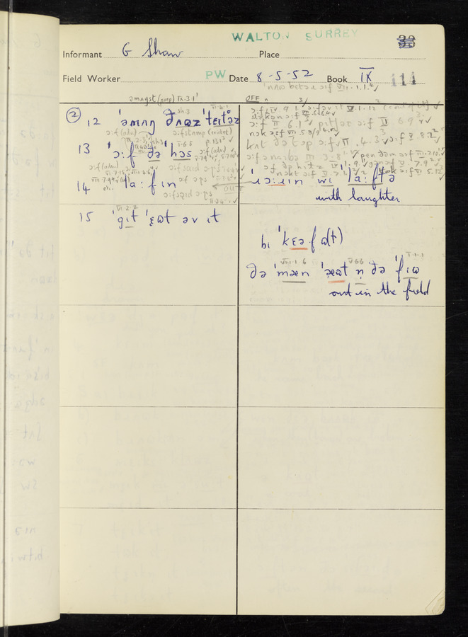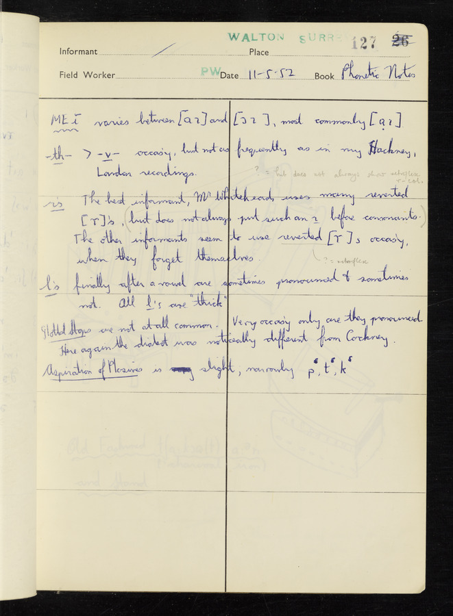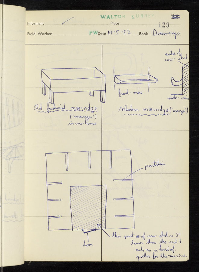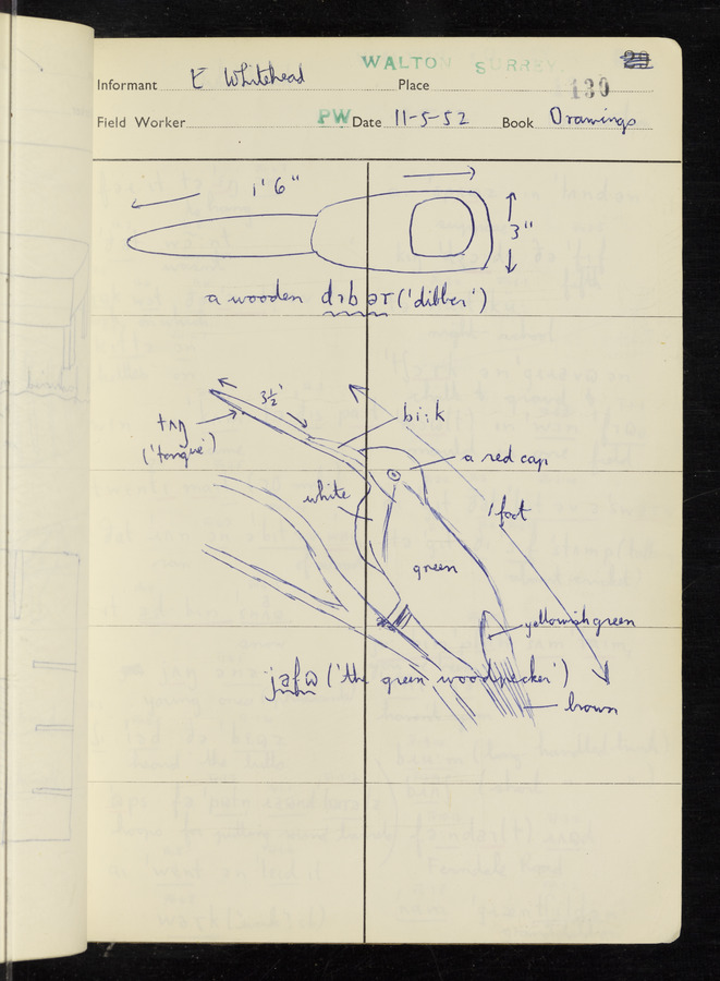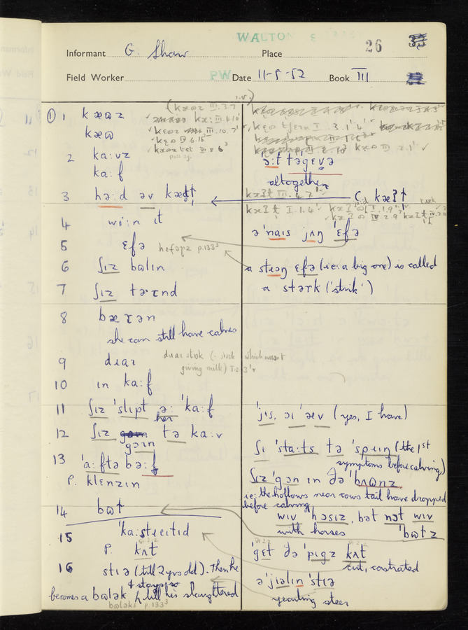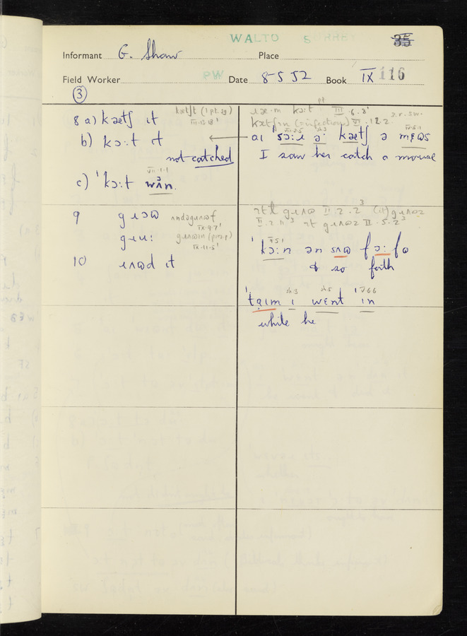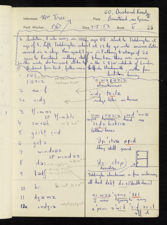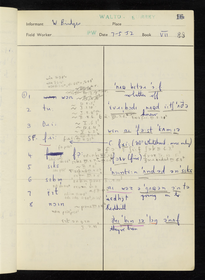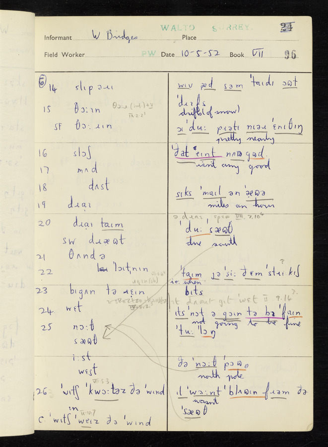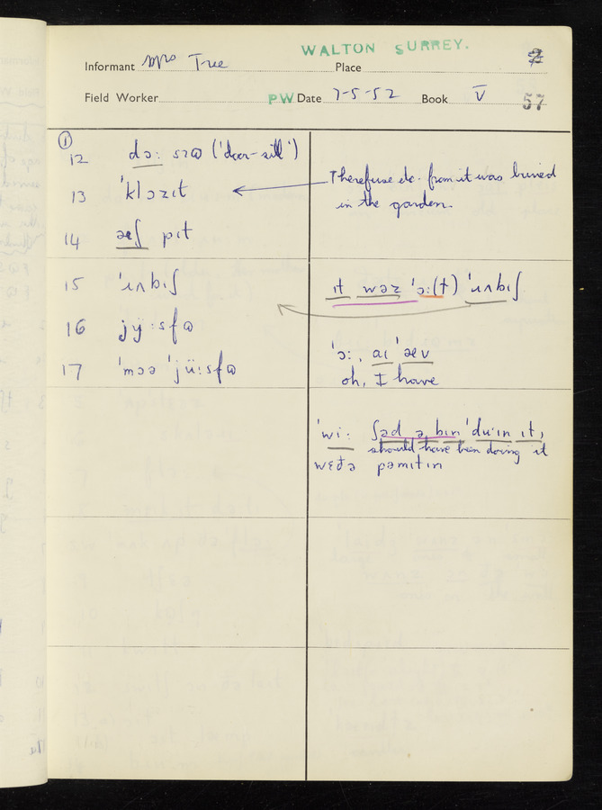 Interviews have been carried out by fieldworker Peter Wright. There are four informants for this response book - George Shaw, Mrs Tree, Edward Whitehead and William Bridges. Their responses can be found in the following books: George Shaw - I, III, IX Mrs Tree - V Edward Whitehead - II, IV William Bridges - VI, VII, VIII