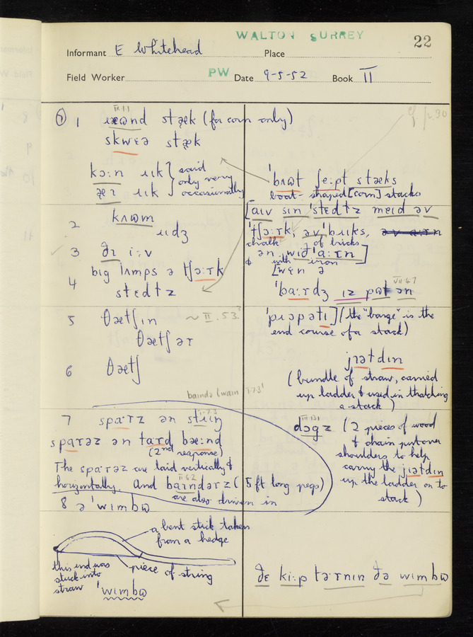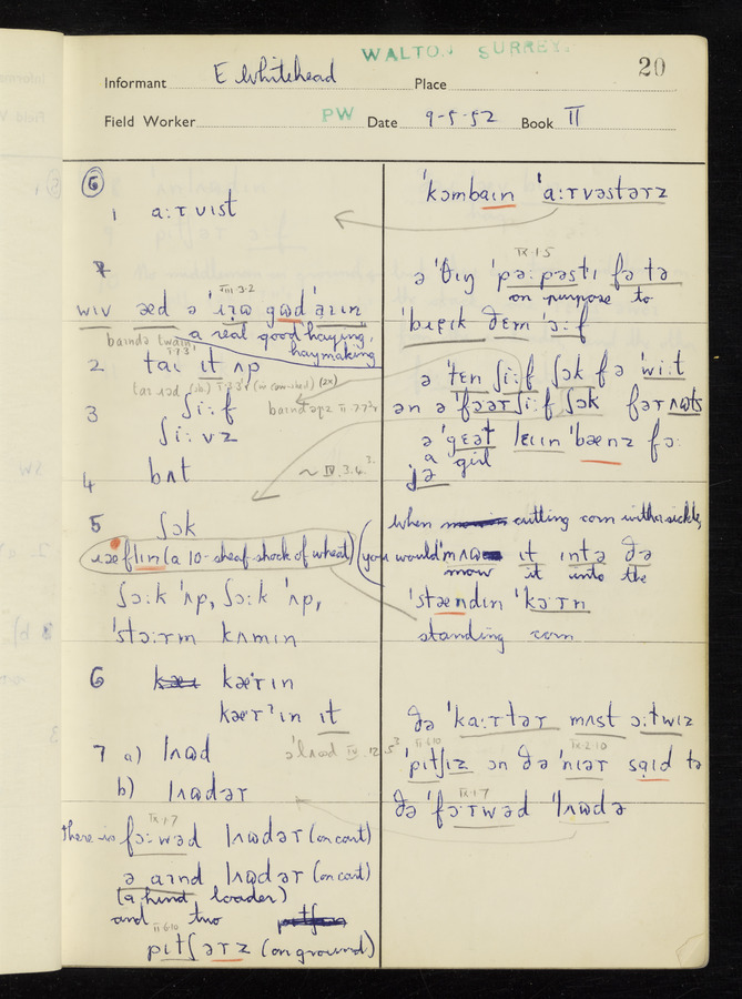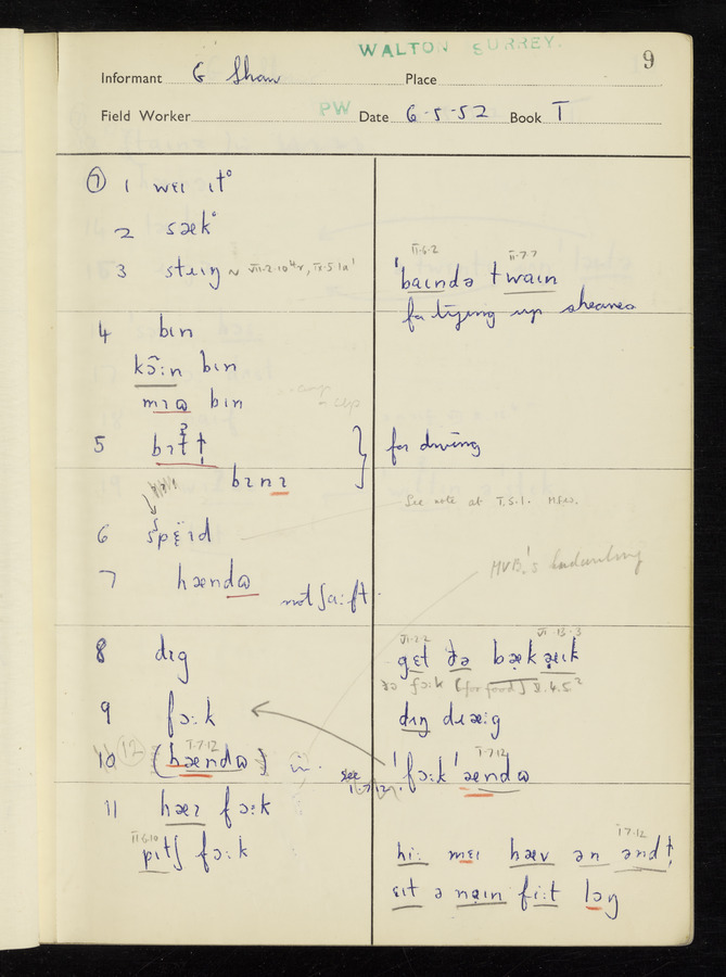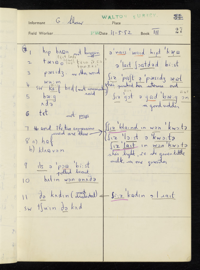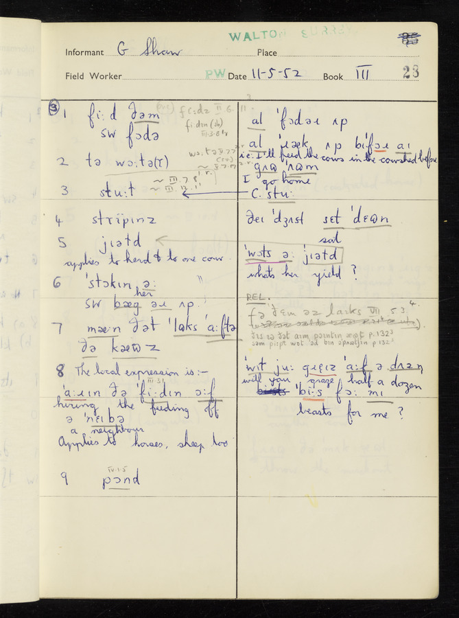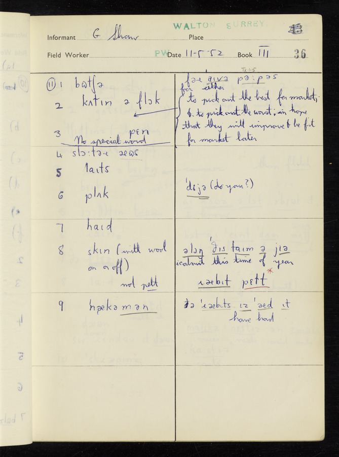 Response book recording the answers given by informants during the Survey of English Dialect. It includes 9 sections that cover a range of topics relating to work, domestic and social life. Answers are recorded in the International Phonetic Alphabet.