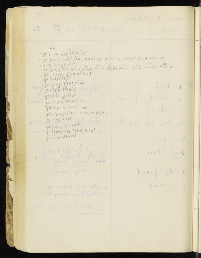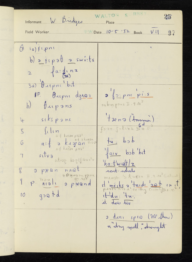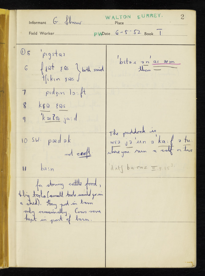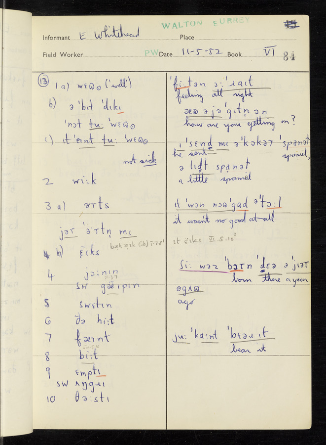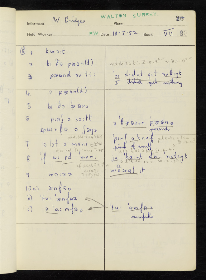 Response book recording the answers given by informants during the Survey of English Dialect. It includes 9 sections that cover a range of topics relating to work, domestic and social life. Answers are recorded in the International Phonetic Alphabet.