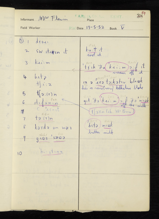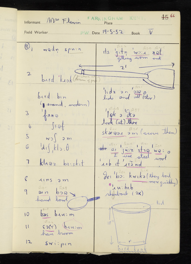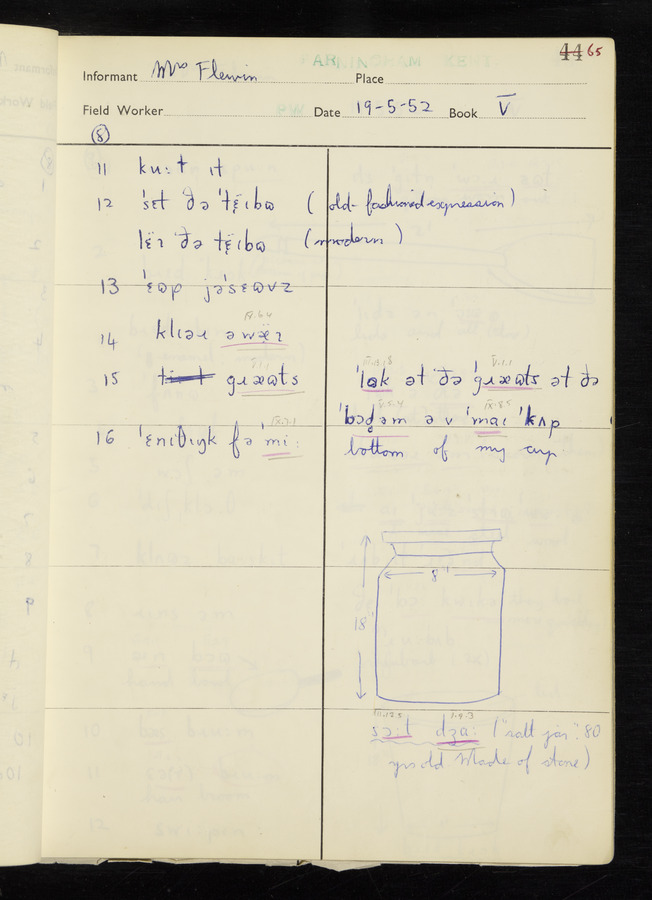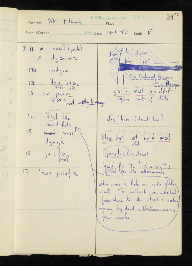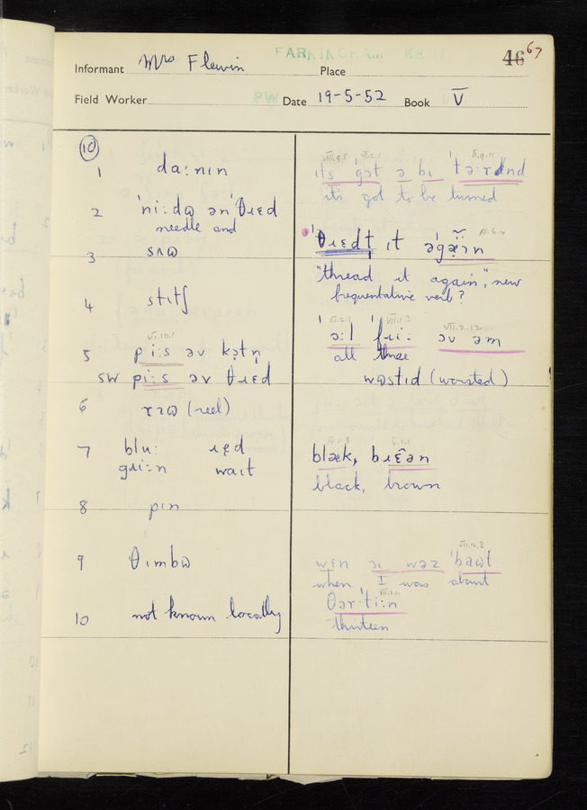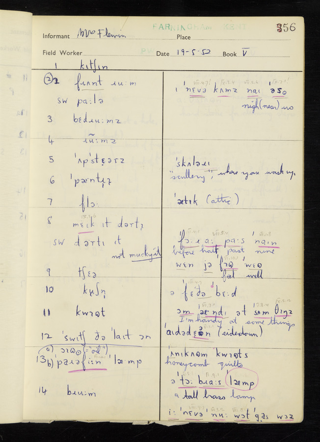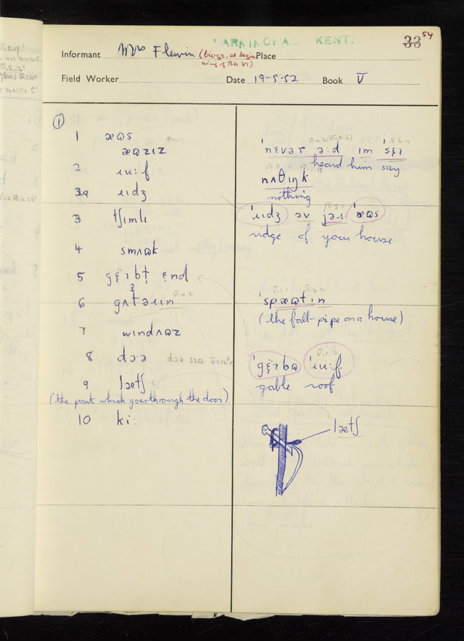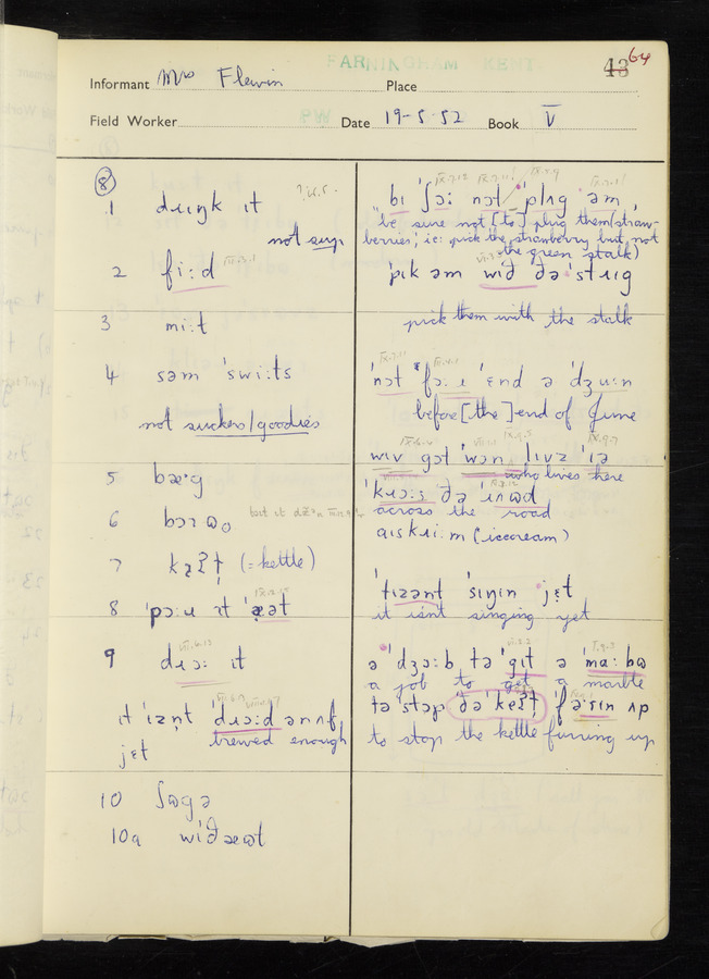 The answers of informant Mrs Flewin (her husband was also present and occasionally helped) recorded by fieldworker Peter Wright in the International Phonetic Alphabet.