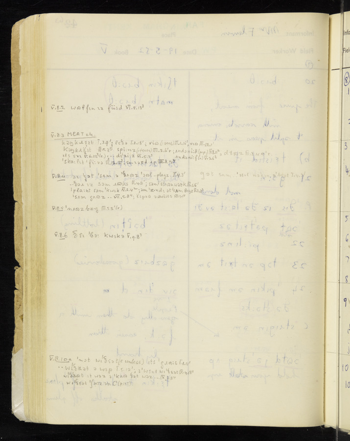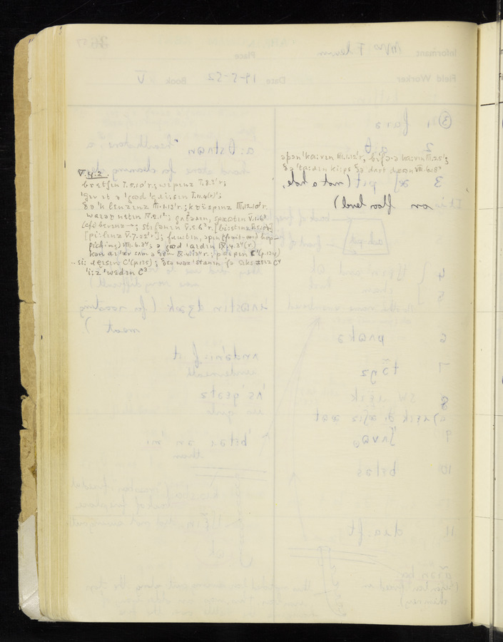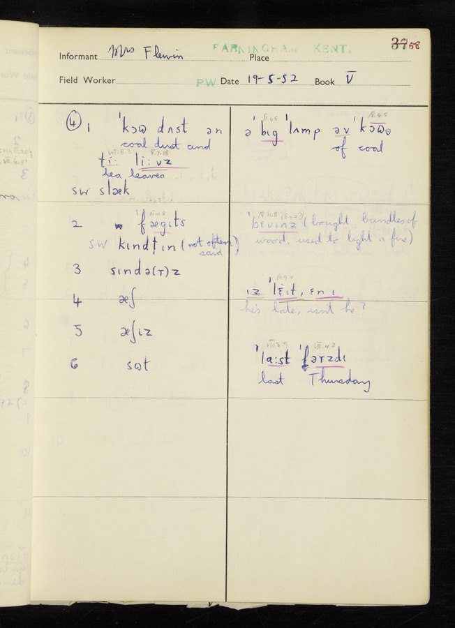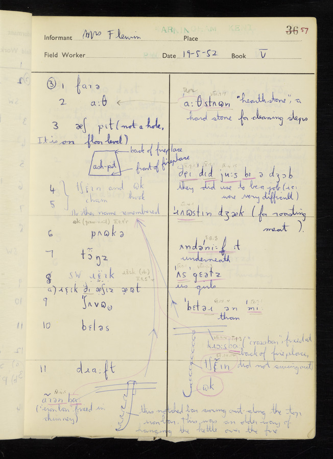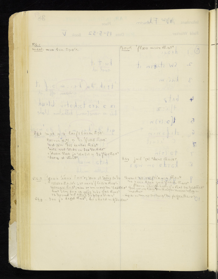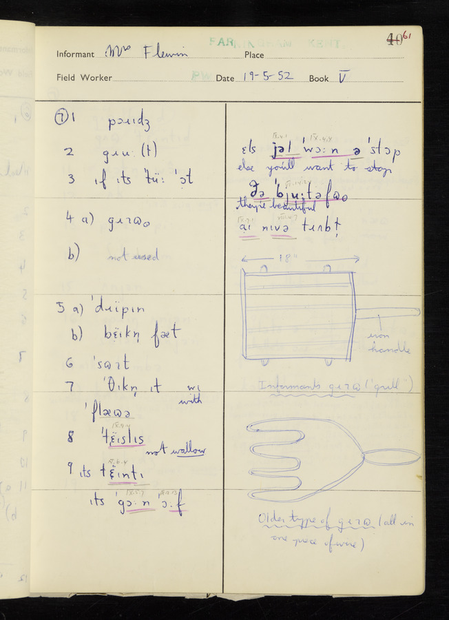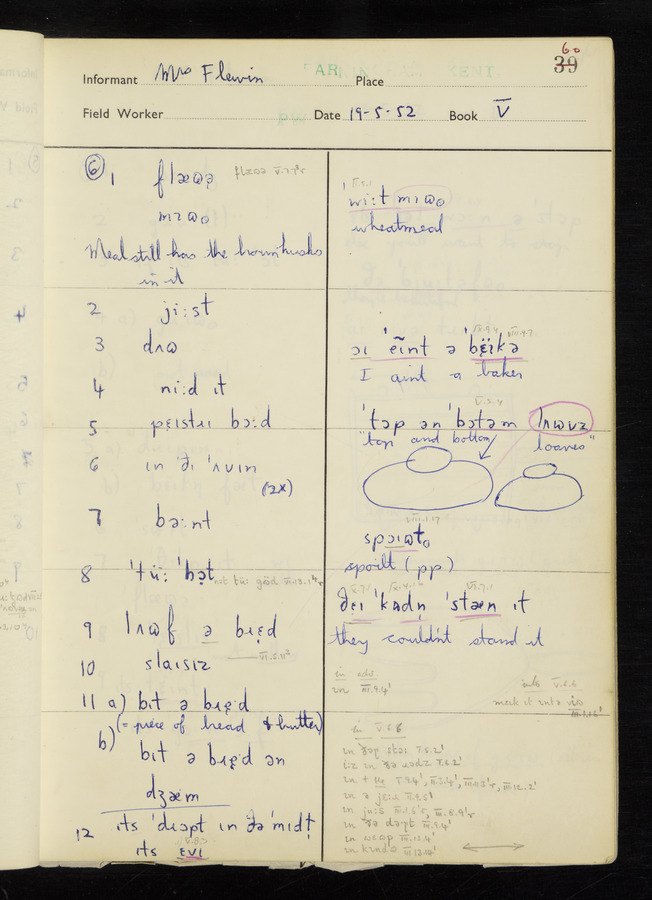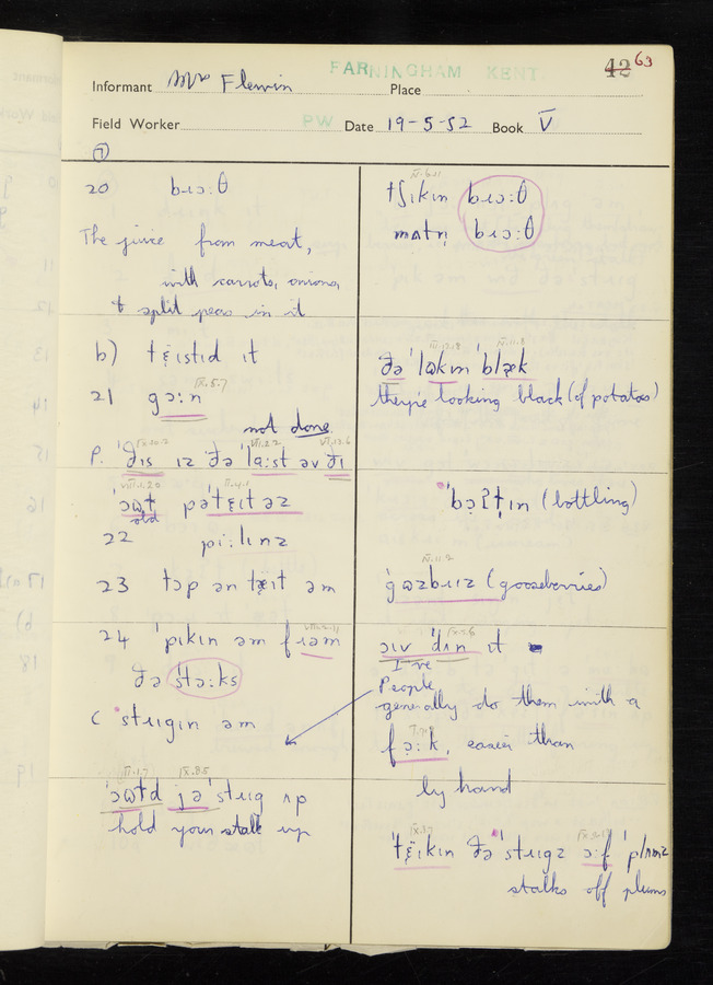 The answers of informant Mrs Flewin (her husband was also present and occasionally helped) recorded by fieldworker Peter Wright in the International Phonetic Alphabet.