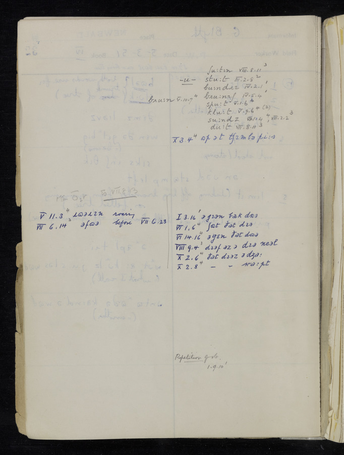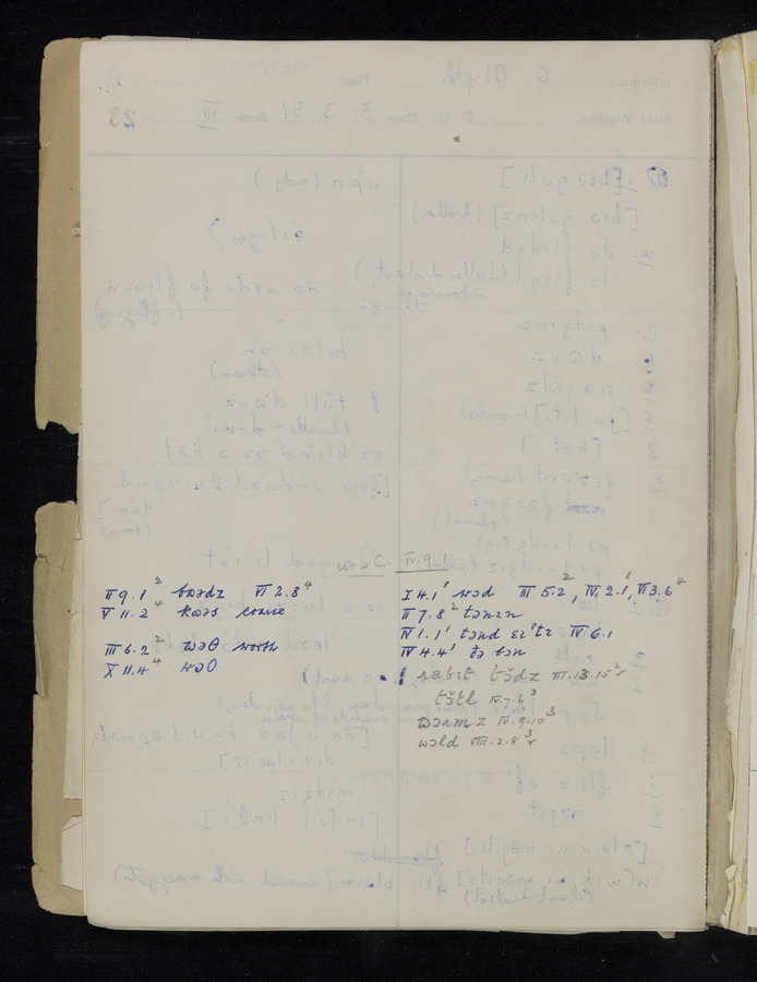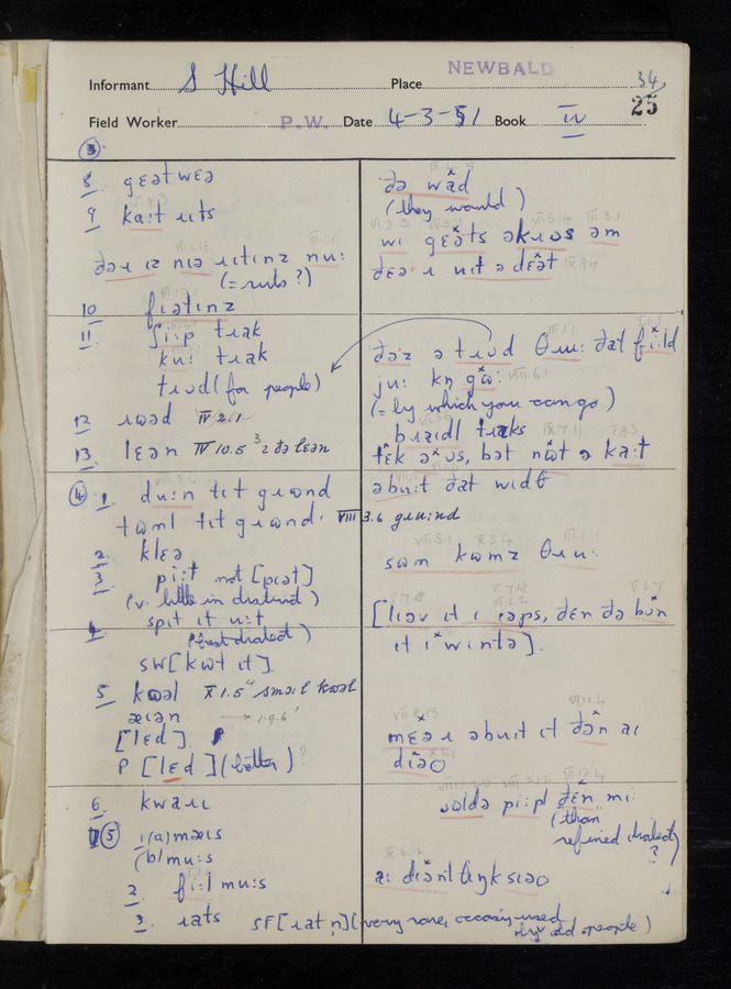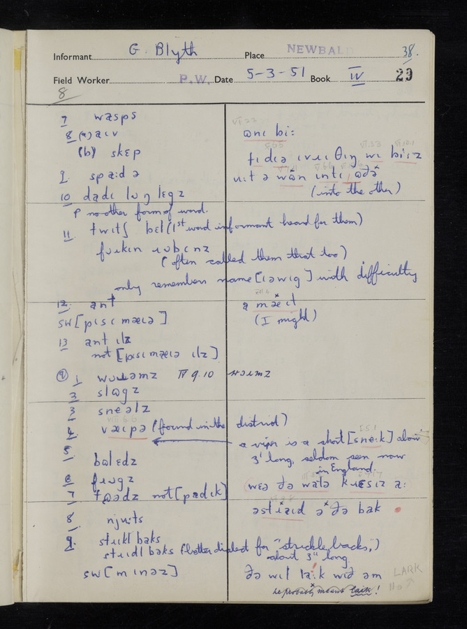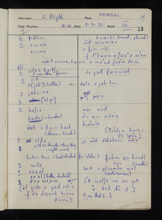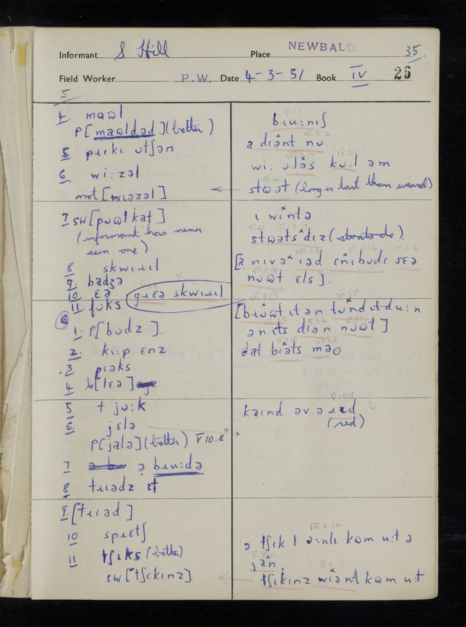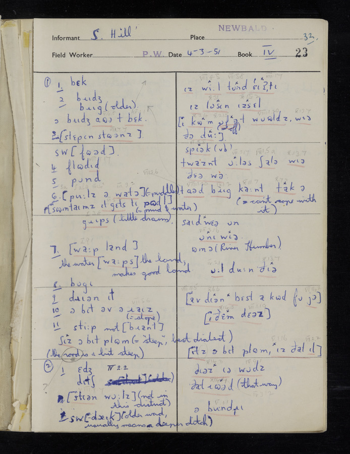 The answers of informant Samuel Hill and George Blyth recorded by fieldworker Peter Wright in the International Phonetic Alphabet.