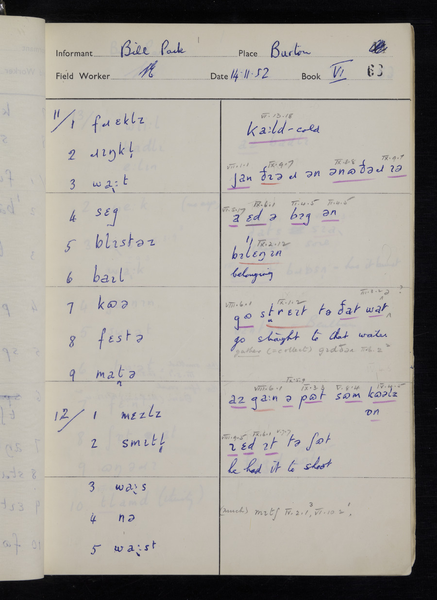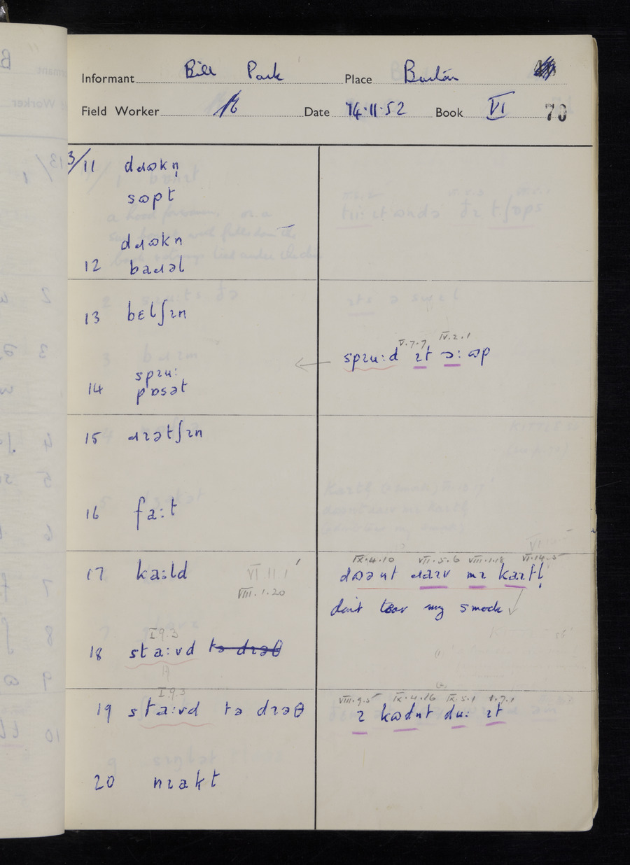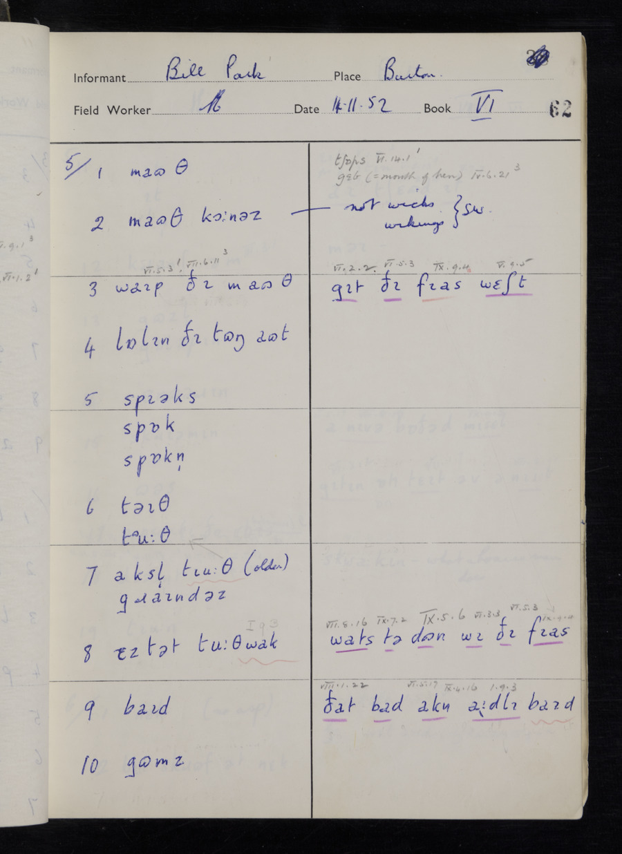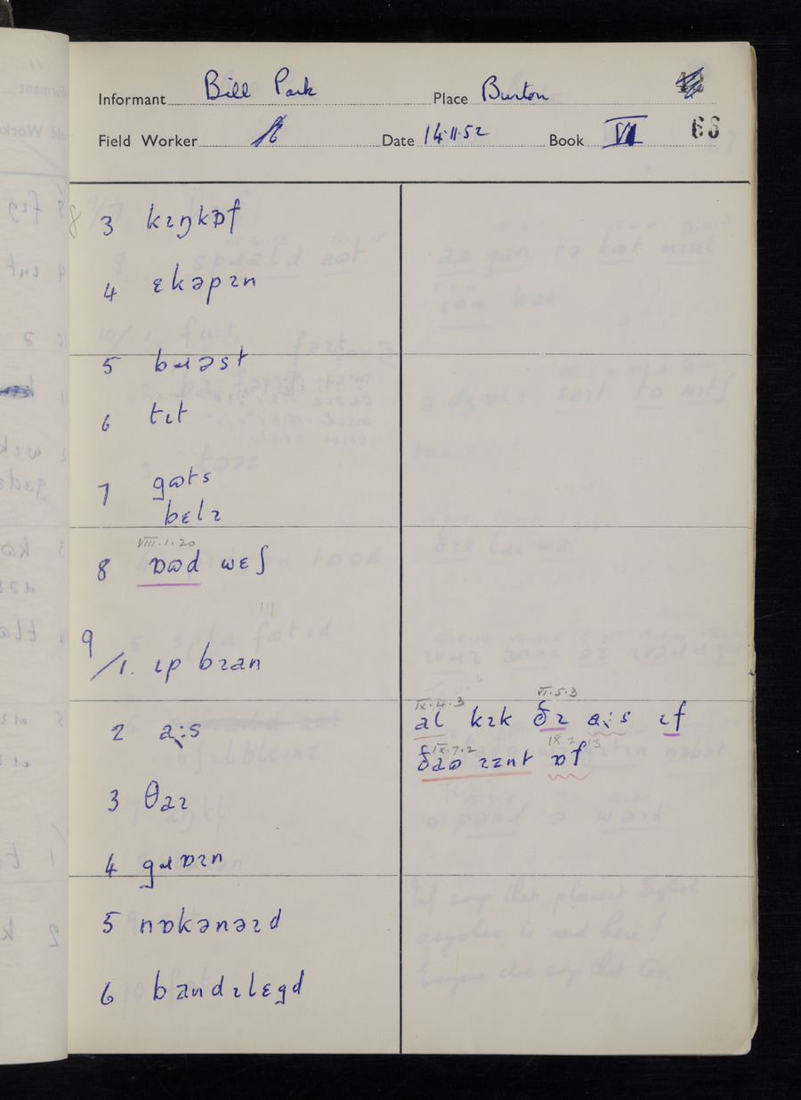 The answers of informant Bill Park recorded by fieldworker Stanley Ellis in the International Phonetic Alphabet.