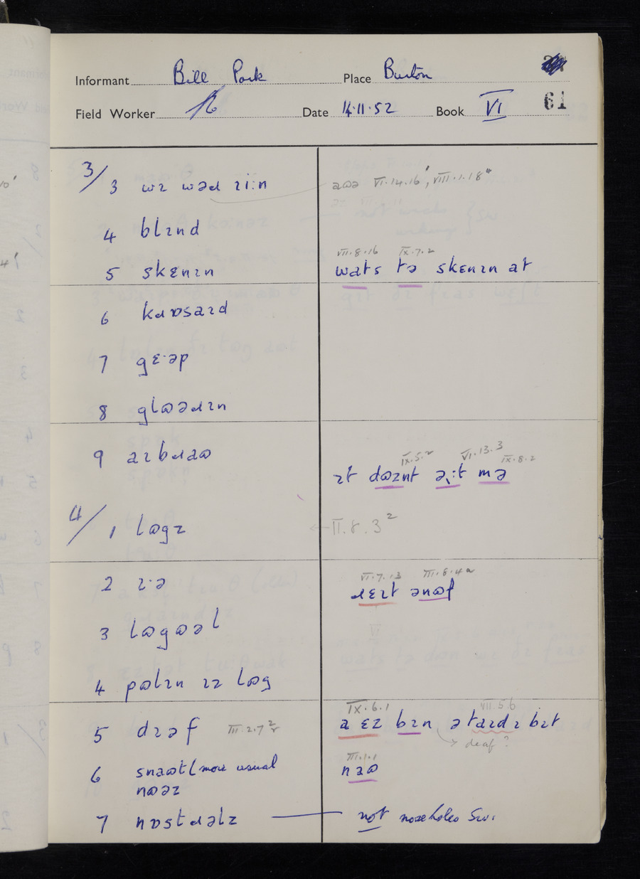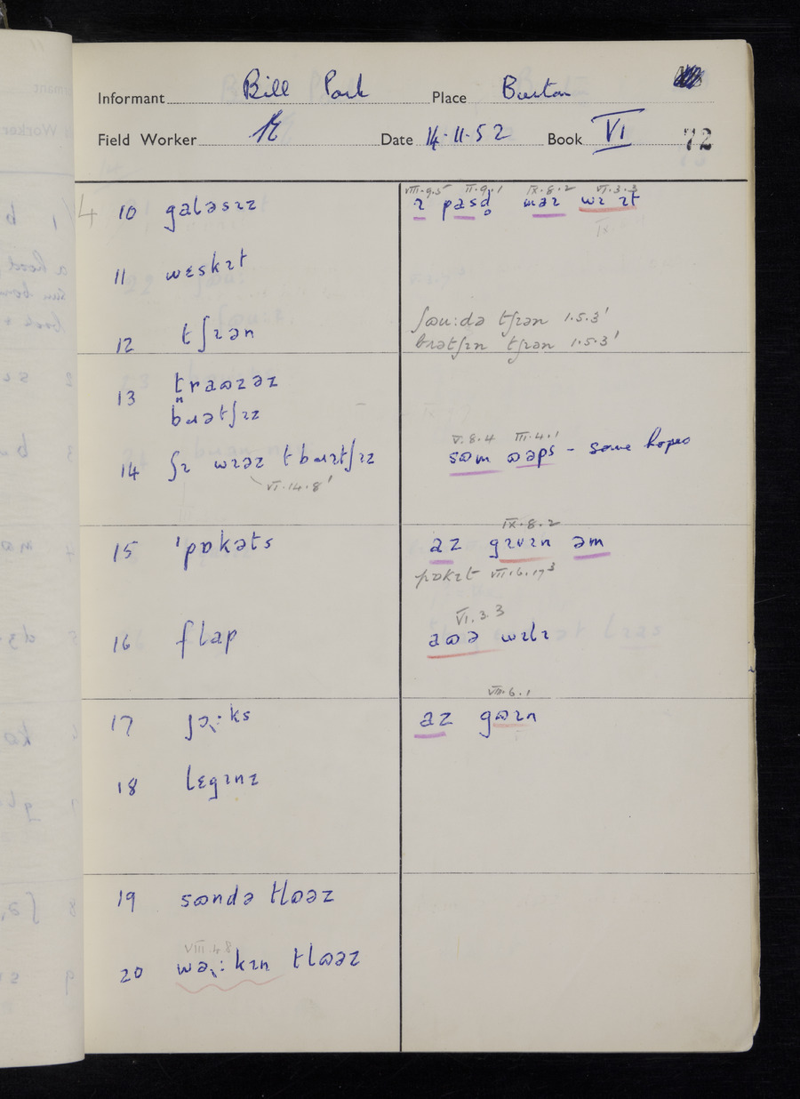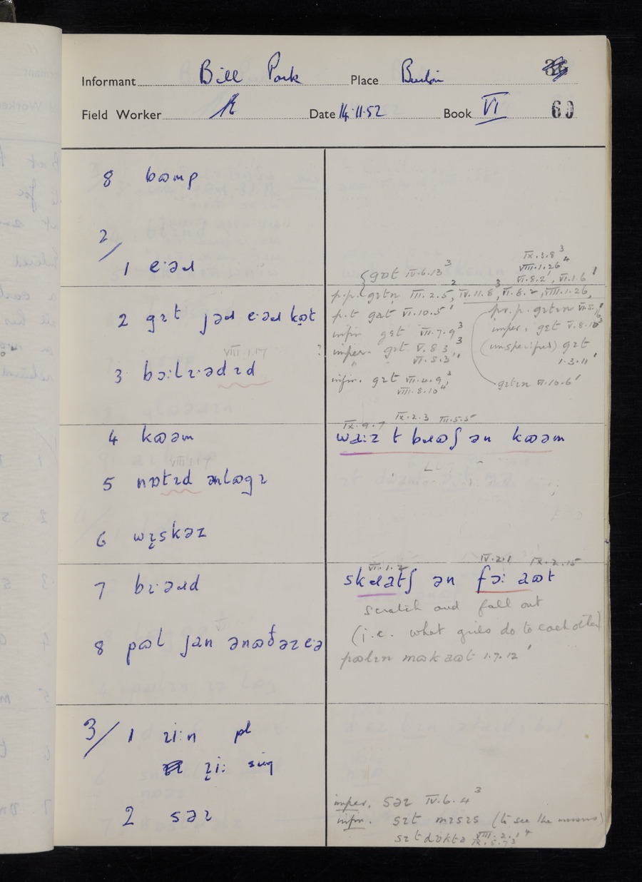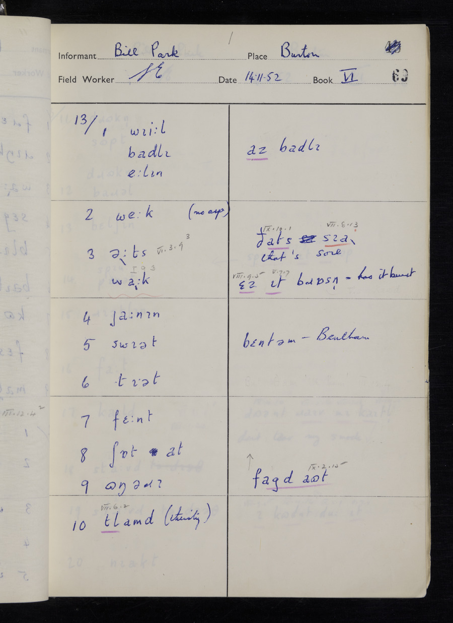 The answers of informant Bill Park recorded by fieldworker Stanley Ellis in the International Phonetic Alphabet.