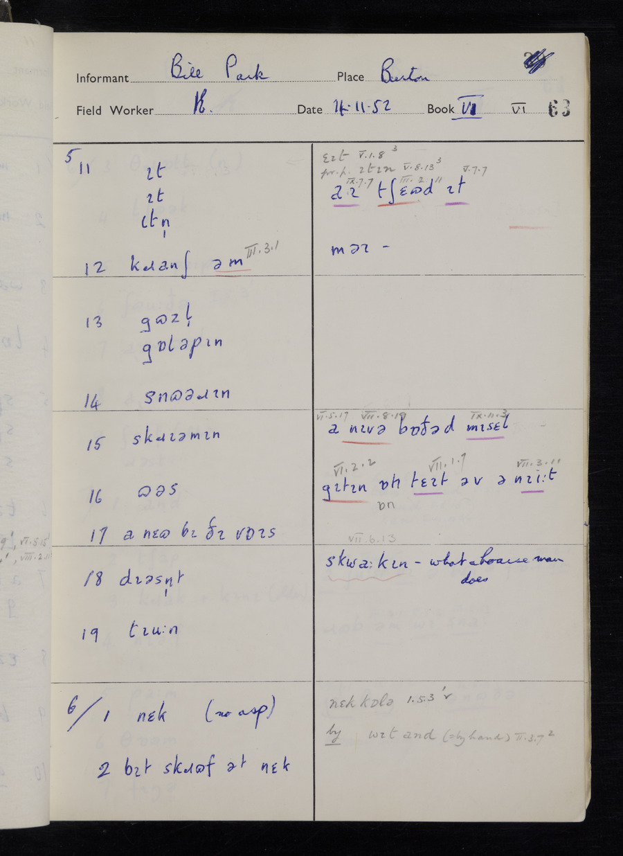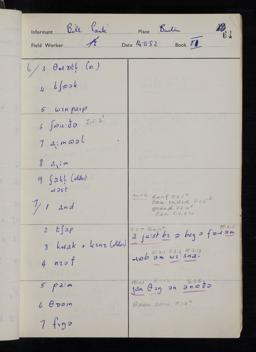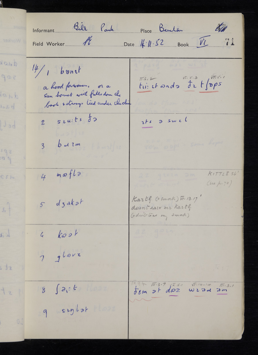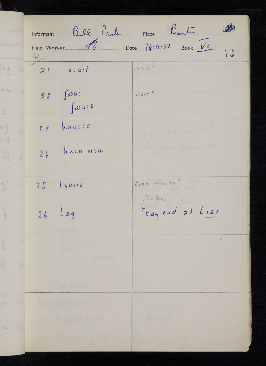 The answers of informant Bill Park recorded by fieldworker Stanley Ellis in the International Phonetic Alphabet.