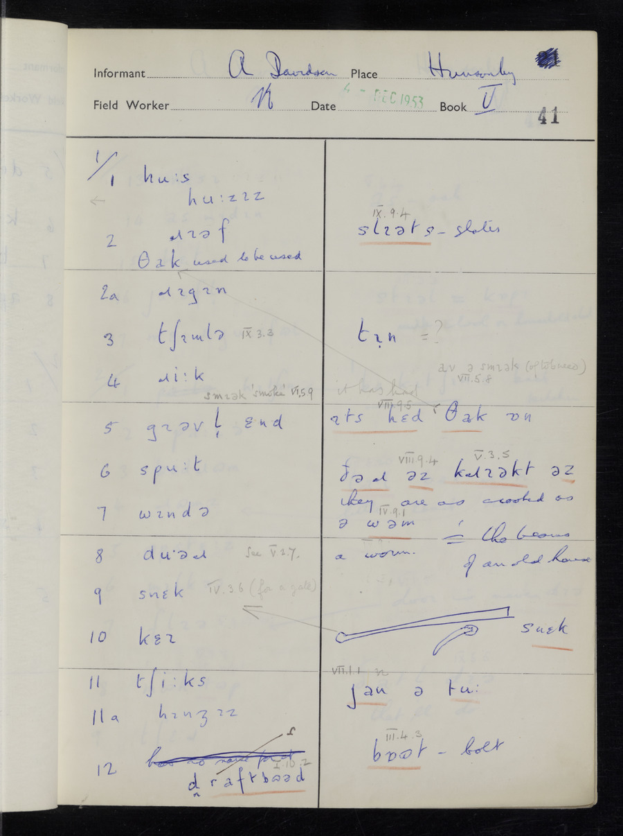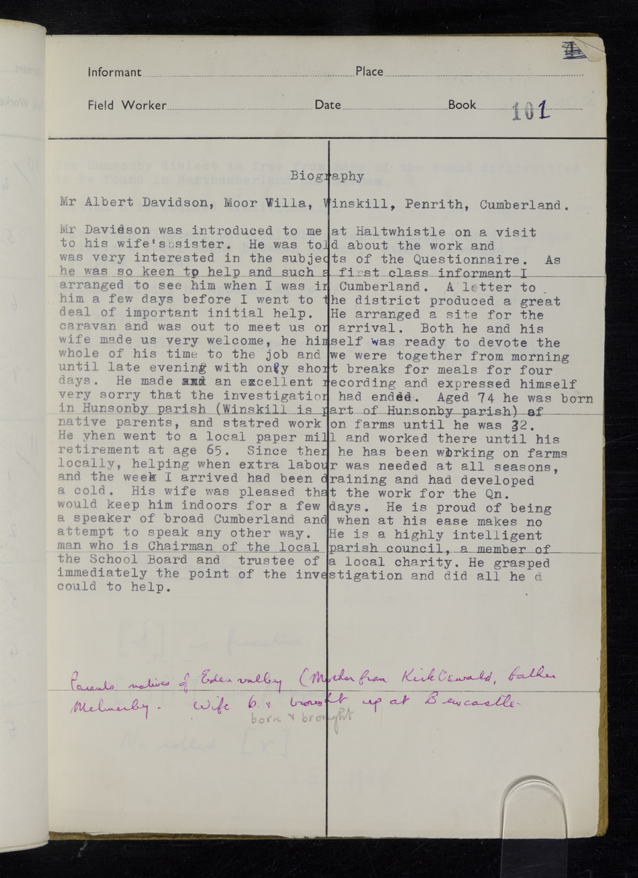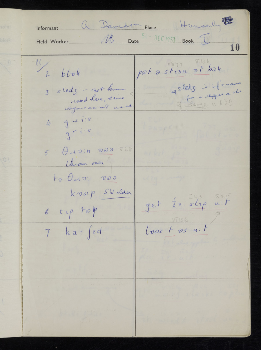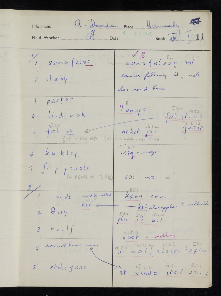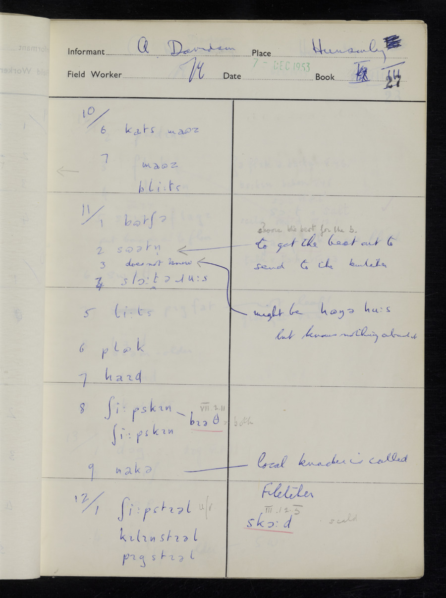 Interviews have been carried out by fieldworker Stanley Ellis. There is one informant for this response book - Albert Davidson His responses can be found in the books below.