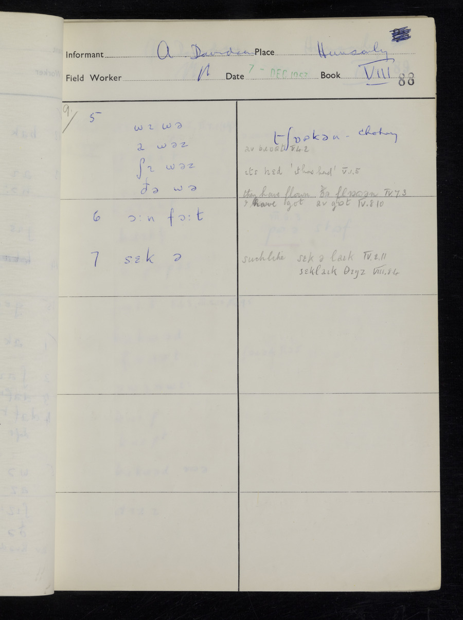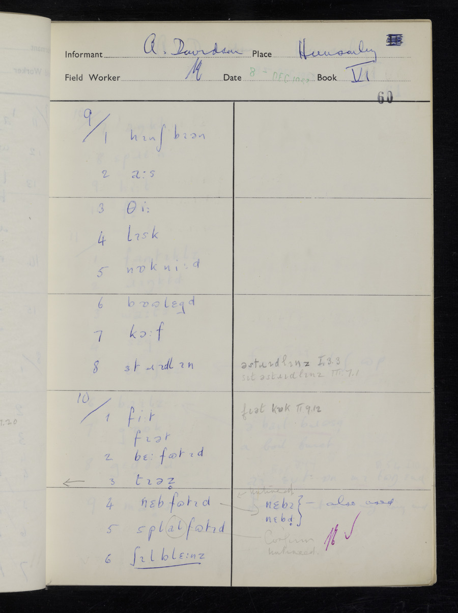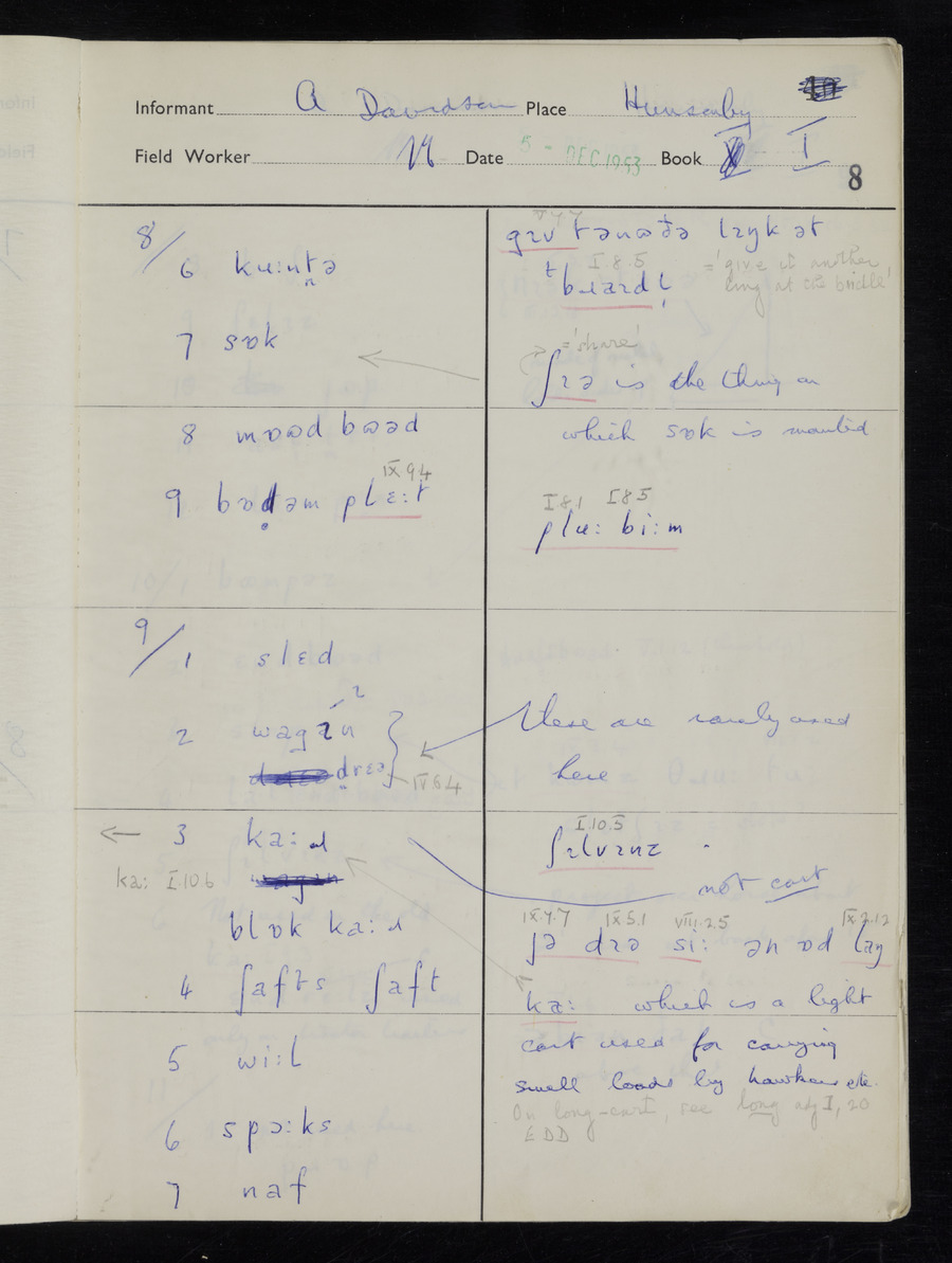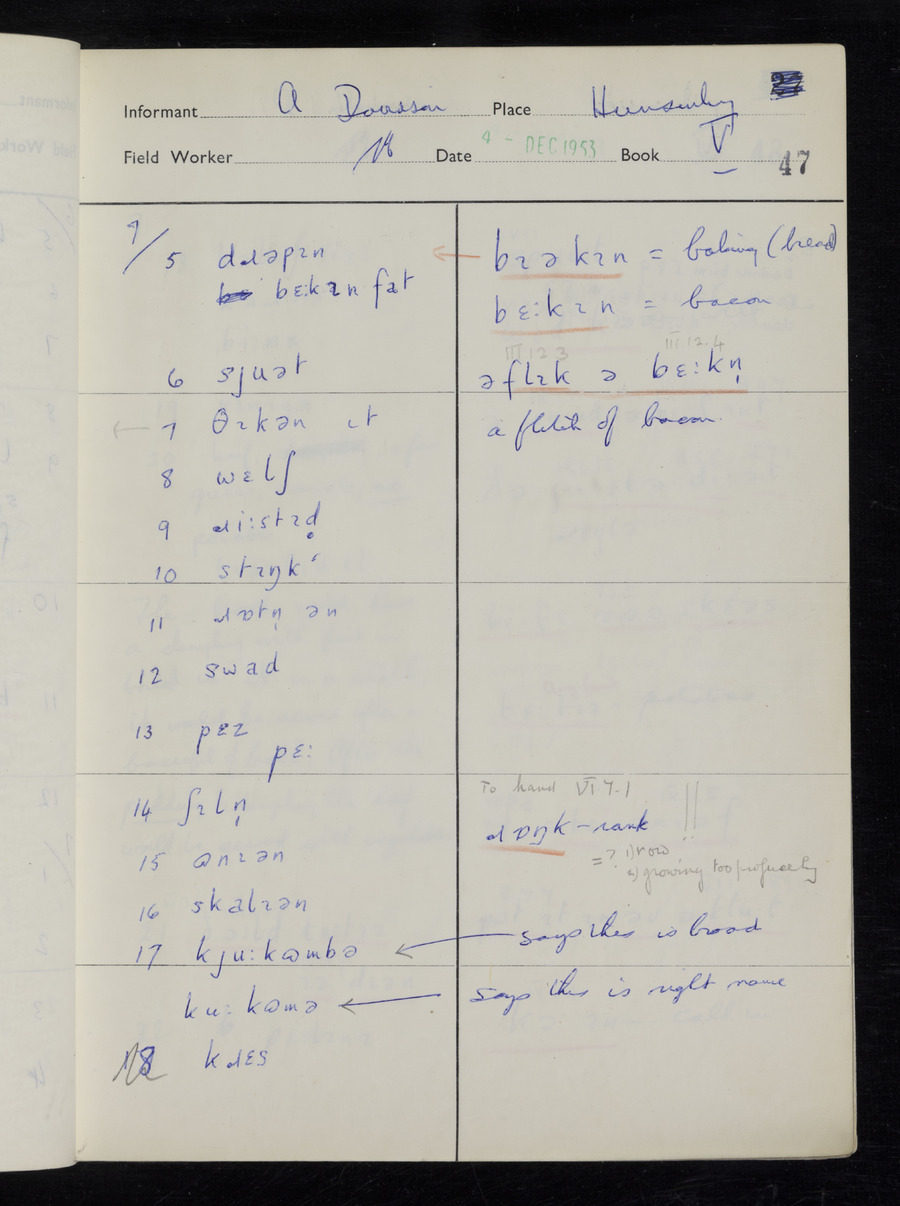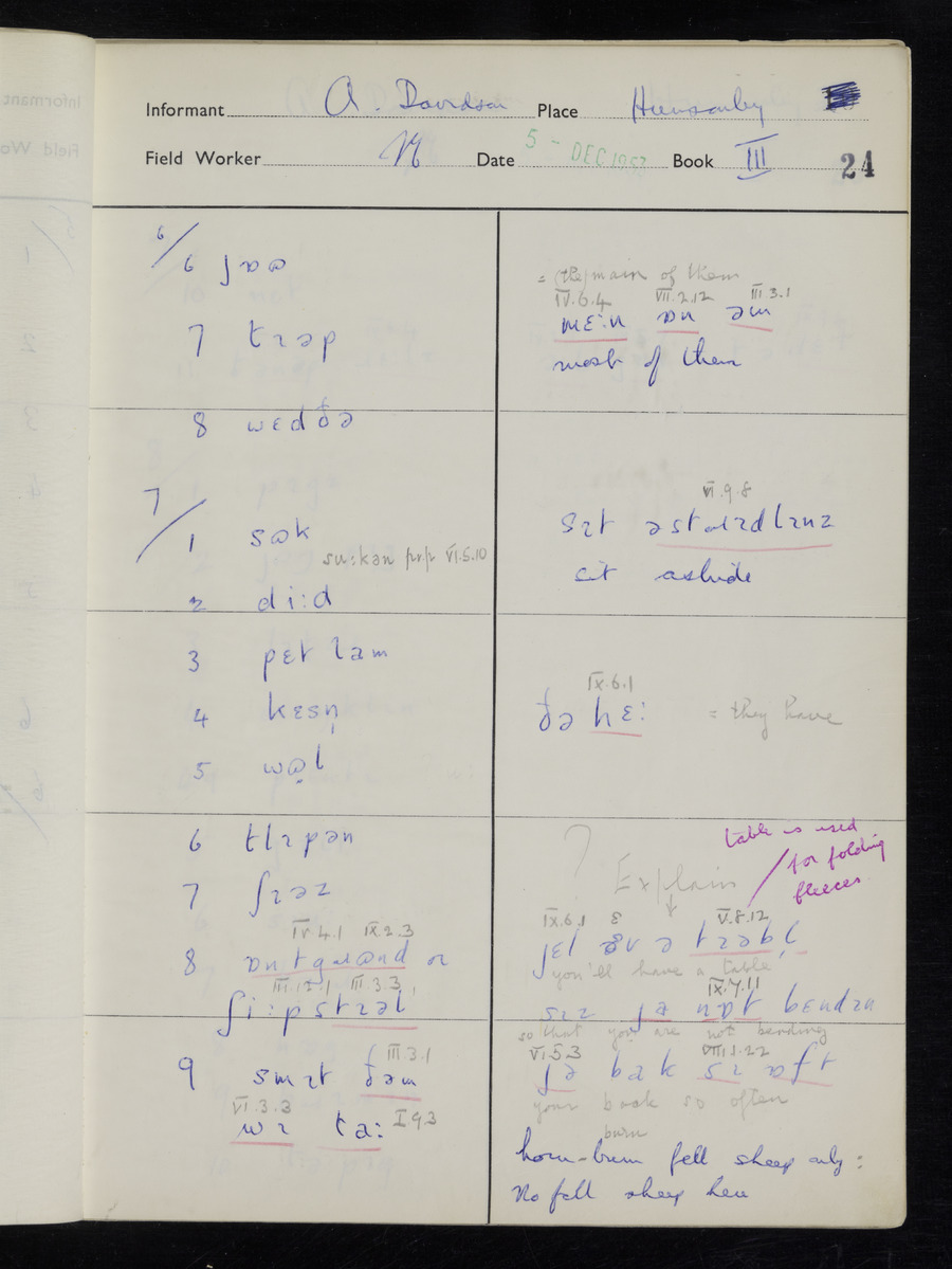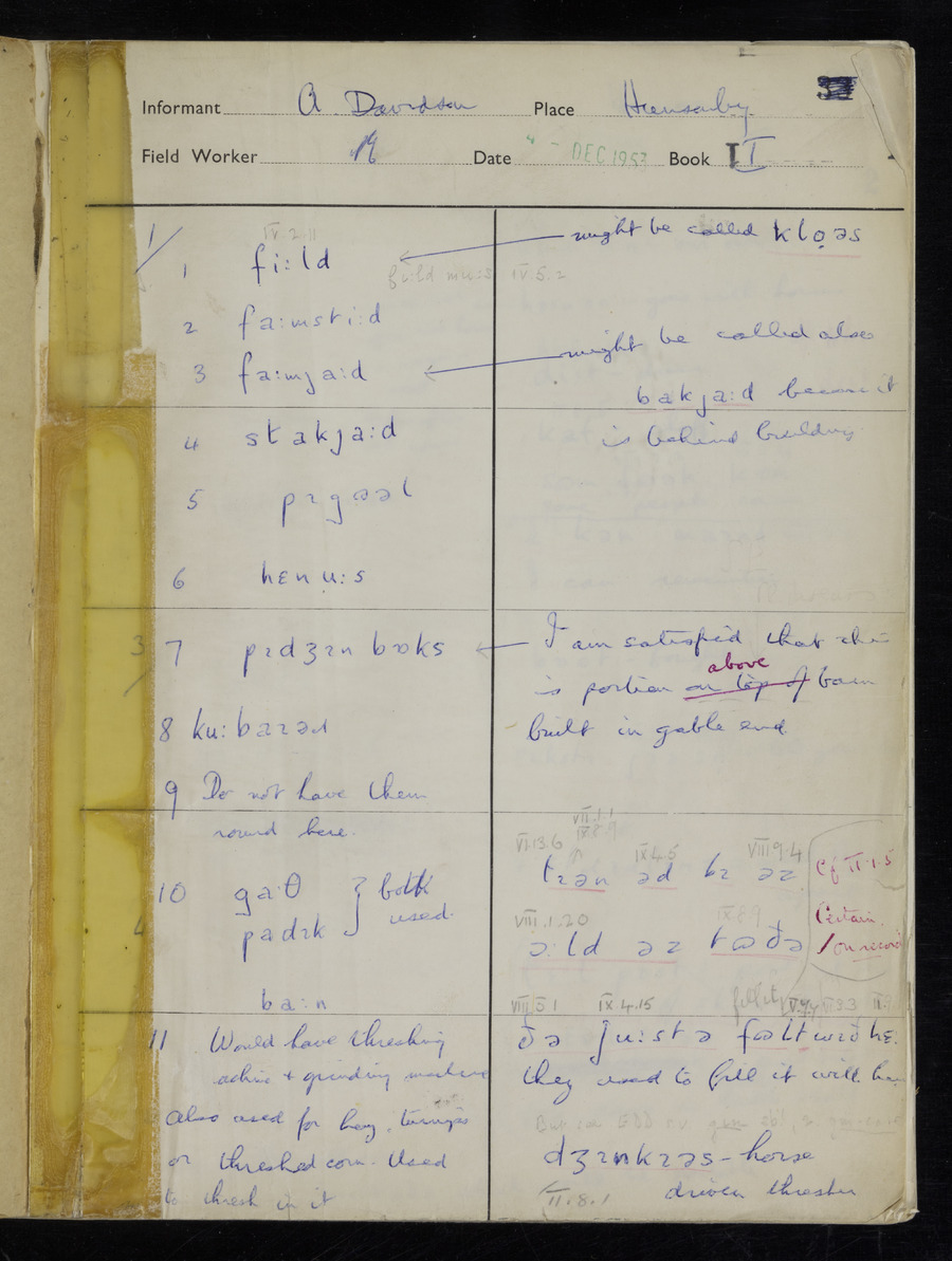 Response book recording the answers given by informants during the Survey of English Dialect. It includes 9 sections that cover a range of topics relating to work, domestic and social life. Answers are recorded in the International Phonetic Alphabet.