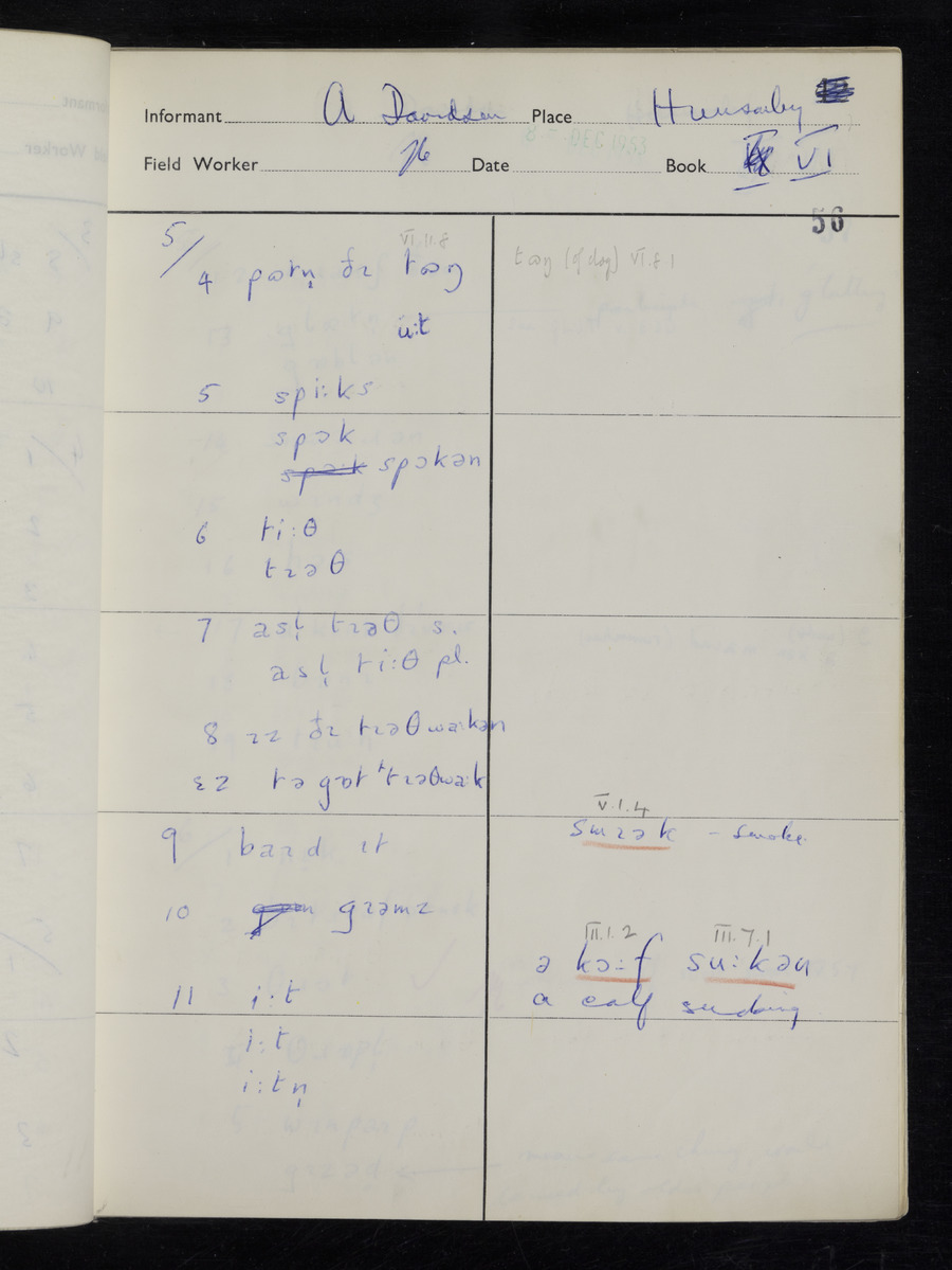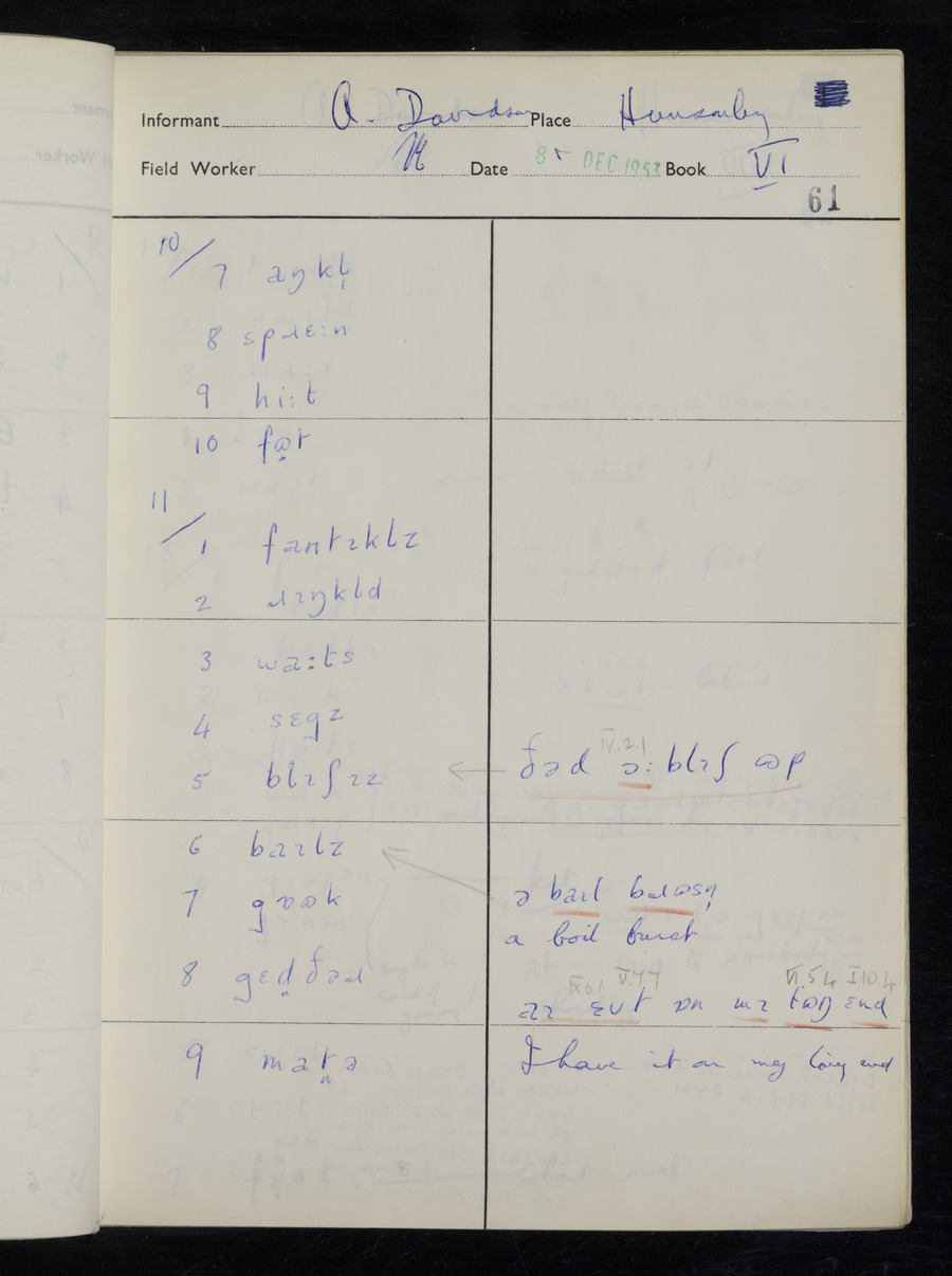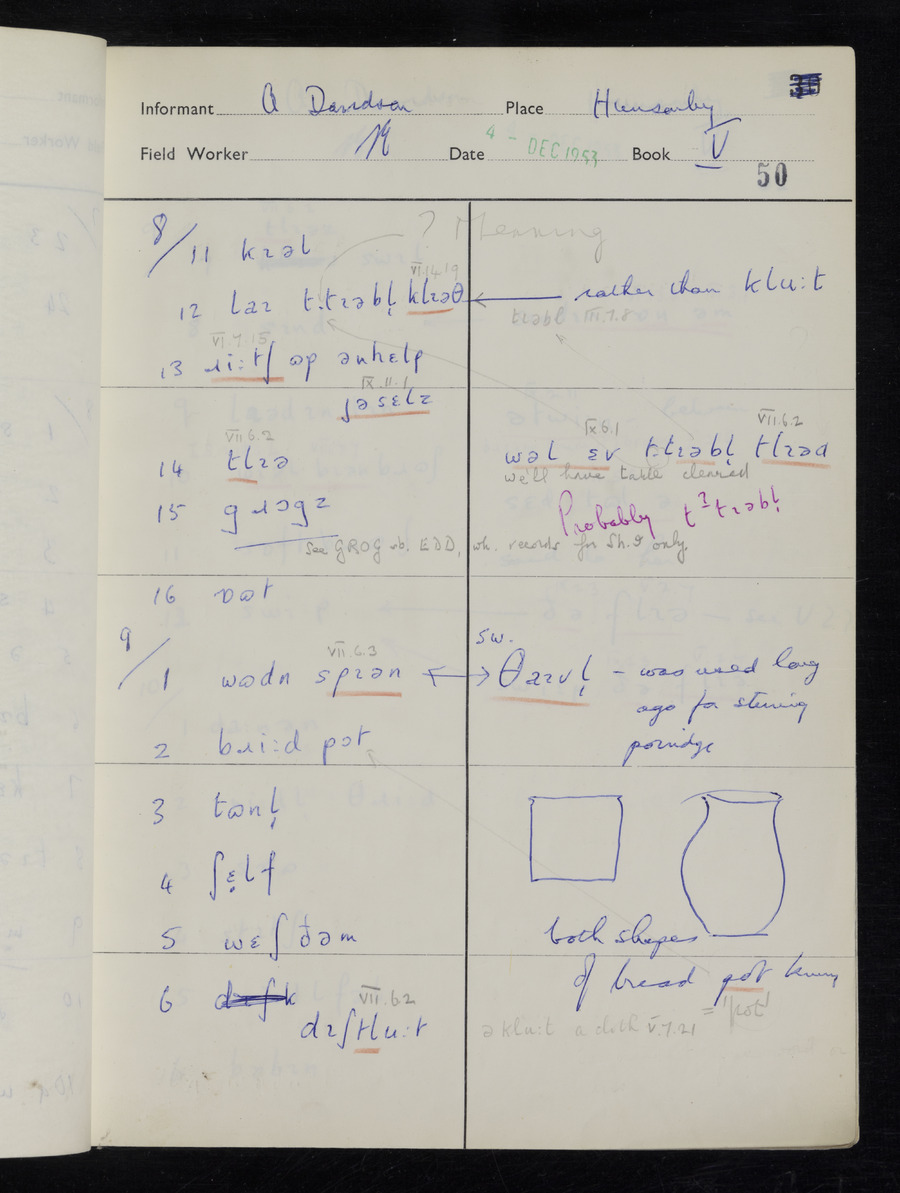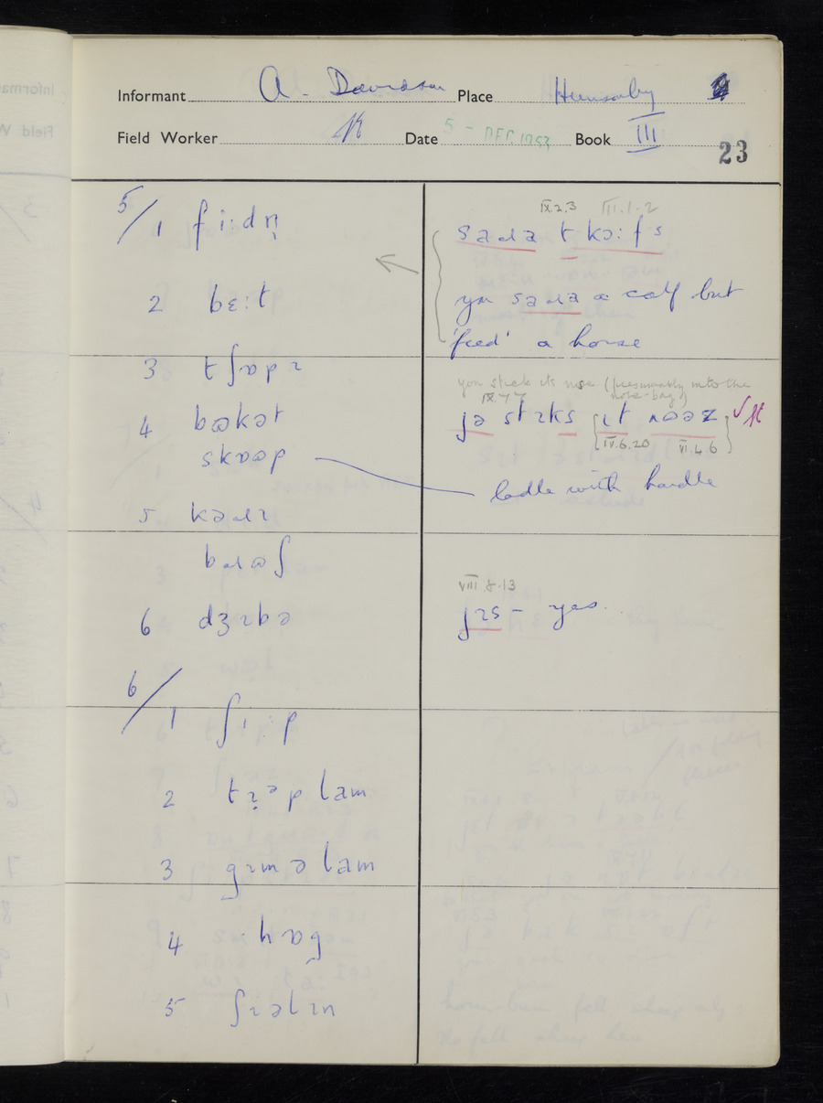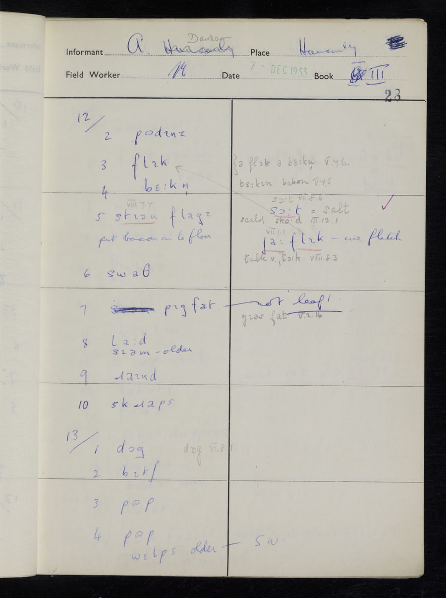 Response book recording the answers given by informants during the Survey of English Dialect. It includes 9 sections that cover a range of topics relating to work, domestic and social life. Answers are recorded in the International Phonetic Alphabet.