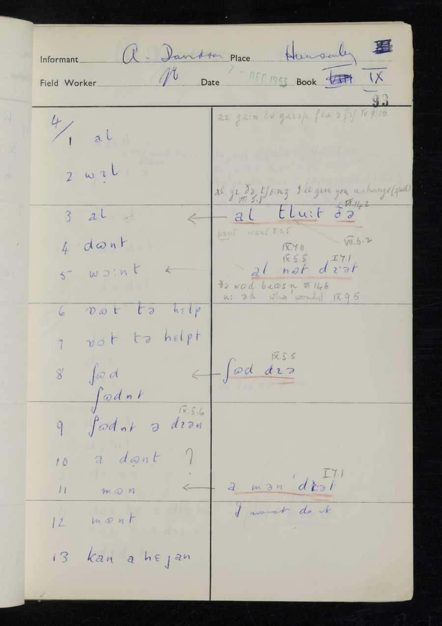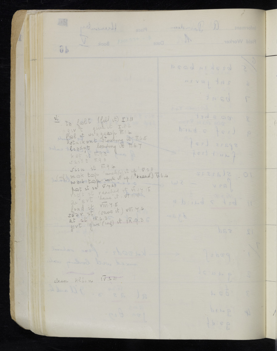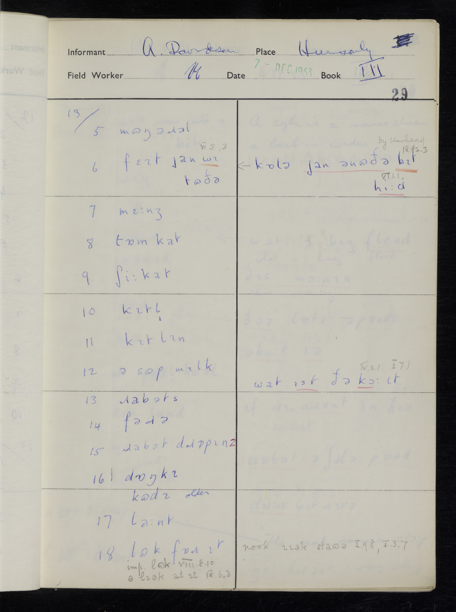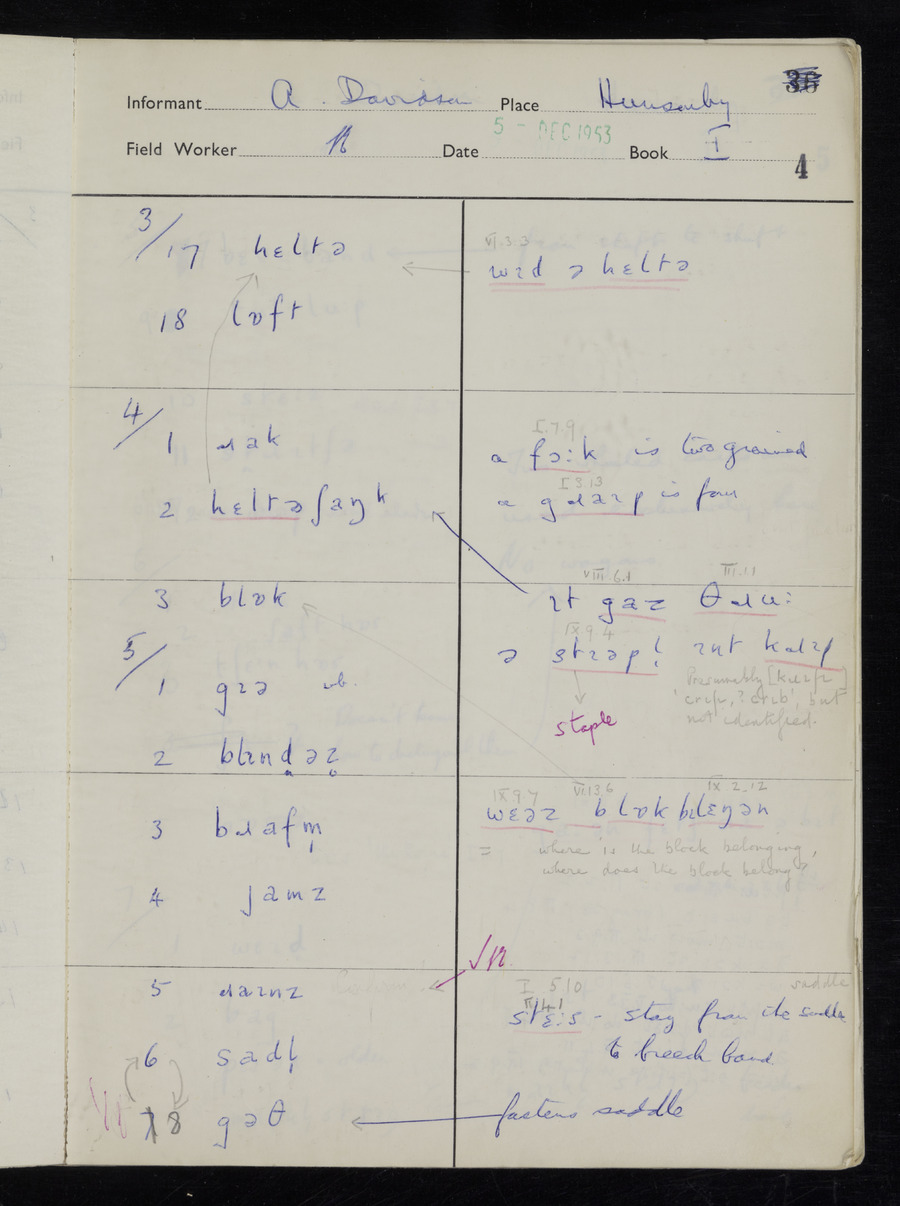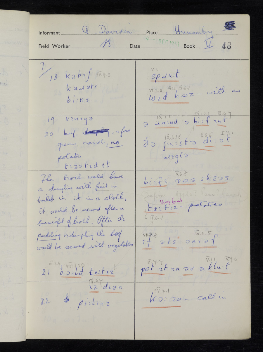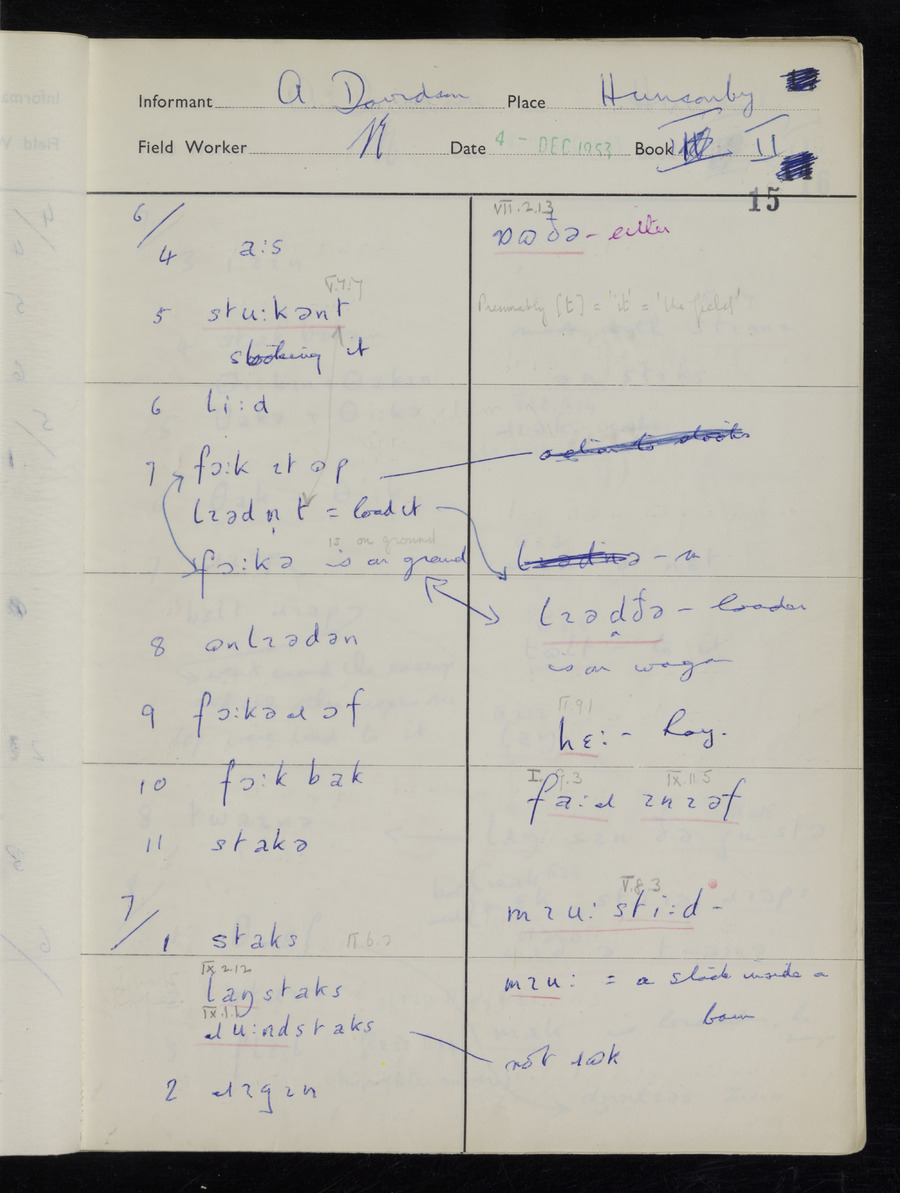 Response book recording the answers given by informants during the Survey of English Dialect. It includes 9 sections that cover a range of topics relating to work, domestic and social life. Answers are recorded in the International Phonetic Alphabet.