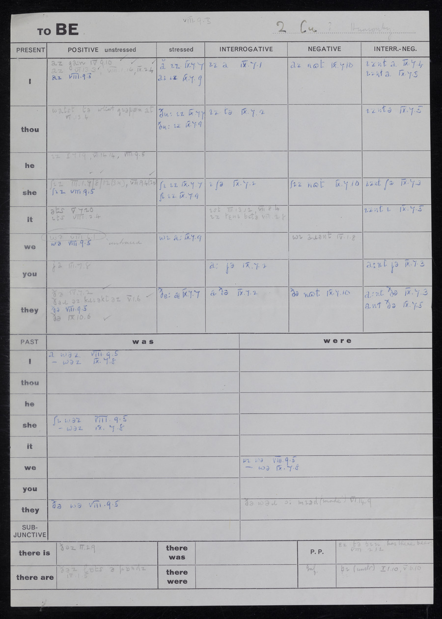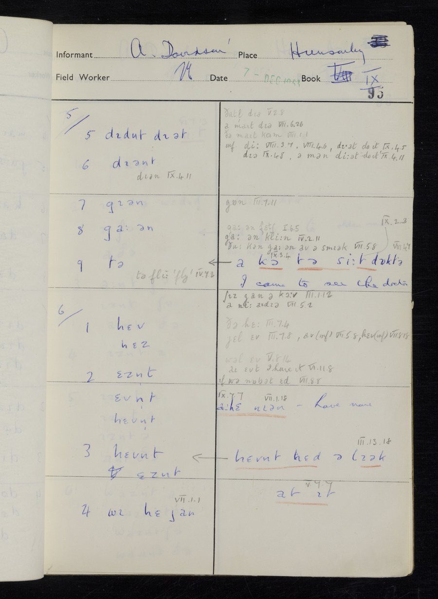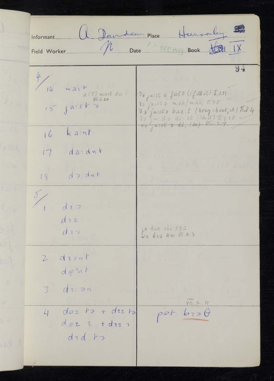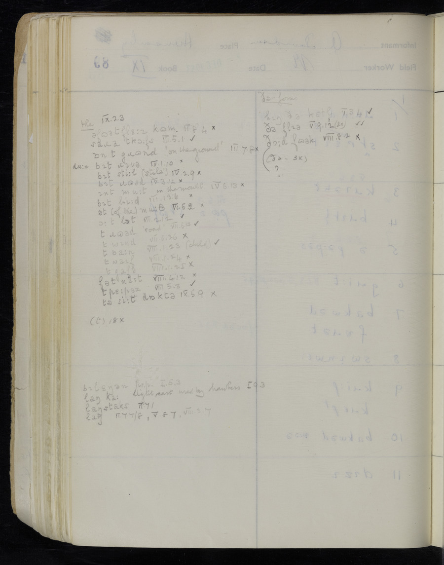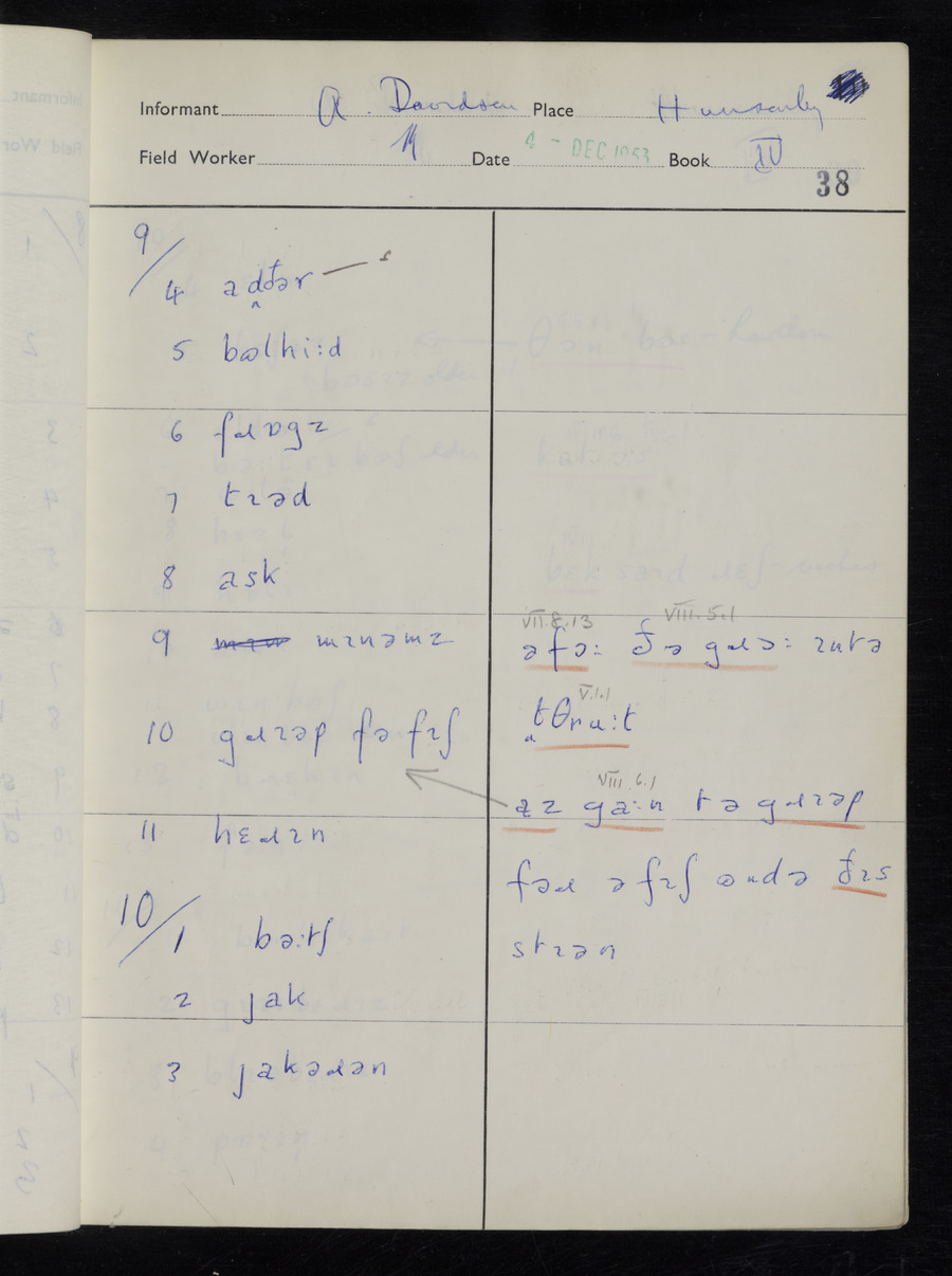 Response book recording the answers given by informants during the Survey of English Dialect. It includes 9 sections that cover a range of topics relating to work, domestic and social life. Answers are recorded in the International Phonetic Alphabet.