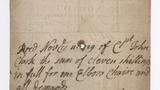 Pictorial 18th century engraved trade card of John Ball. Trader details inside ornate frame with smaller frame at top of card depicting chairs and crown with caption 'J. Ball Chair Maker'. Manuscript ink note on reverse 'Recd [Received] Nov 1729 of Cpt [Captain] John Clark the sum of eleven shillings in full for one elbow chaire and all demands' signed by John Ball.