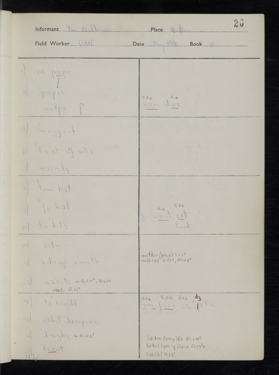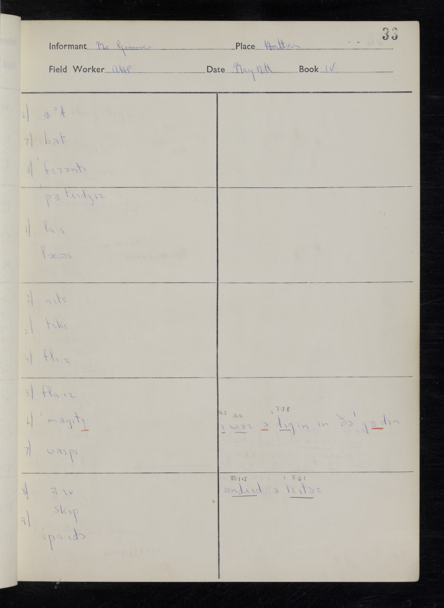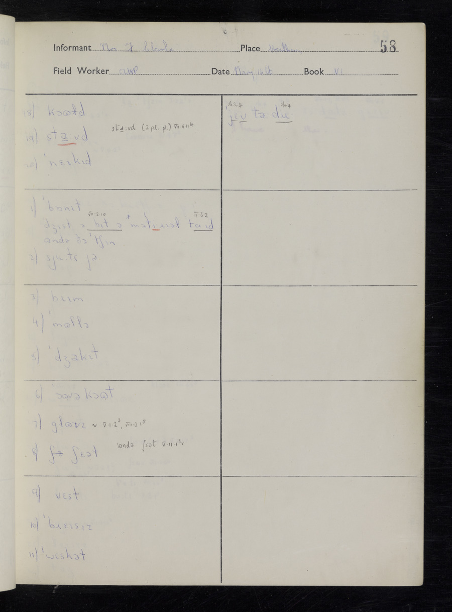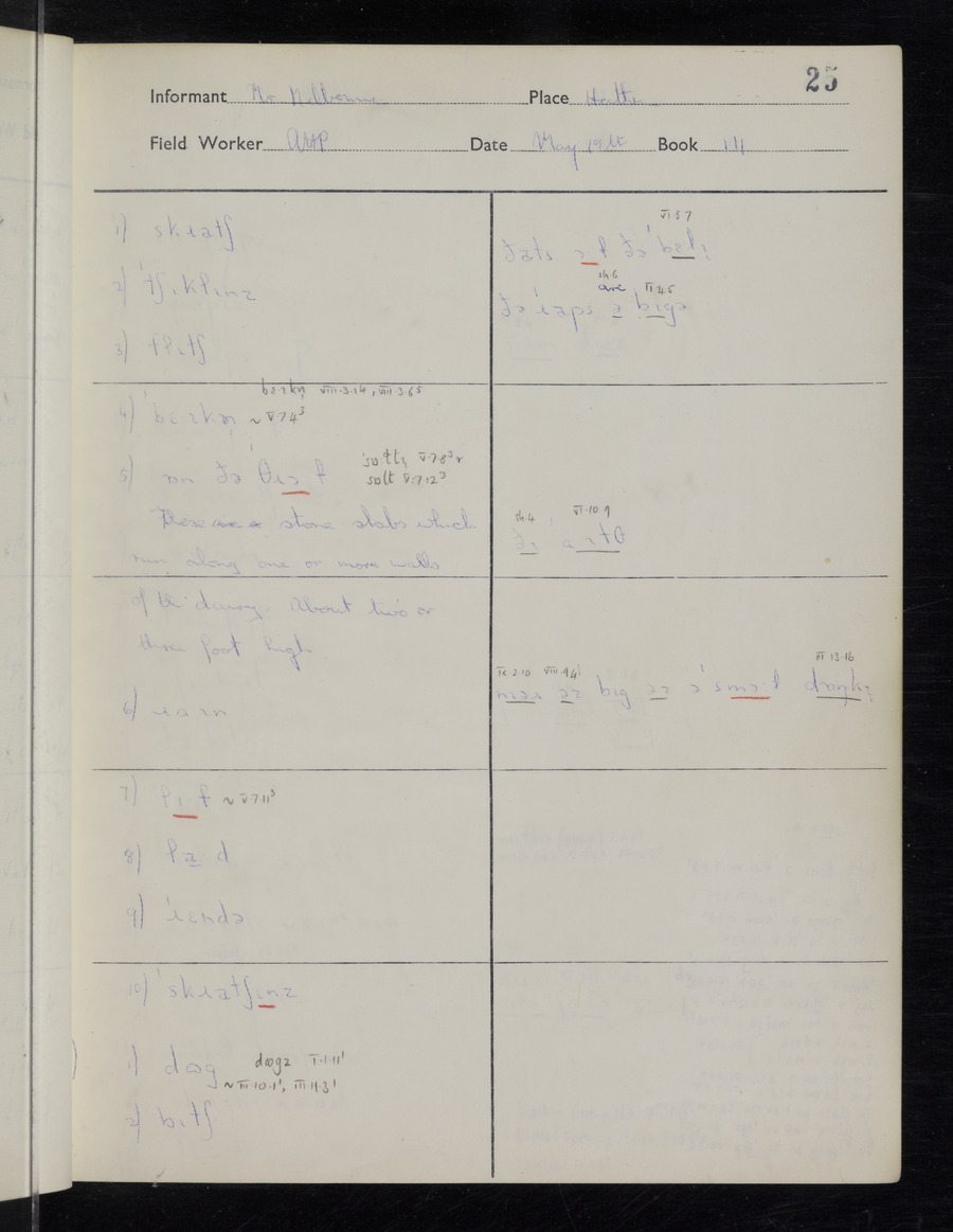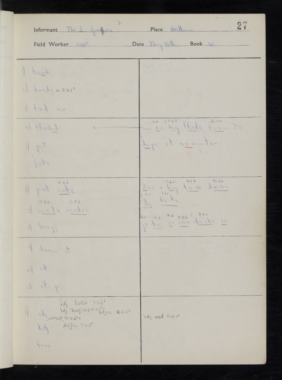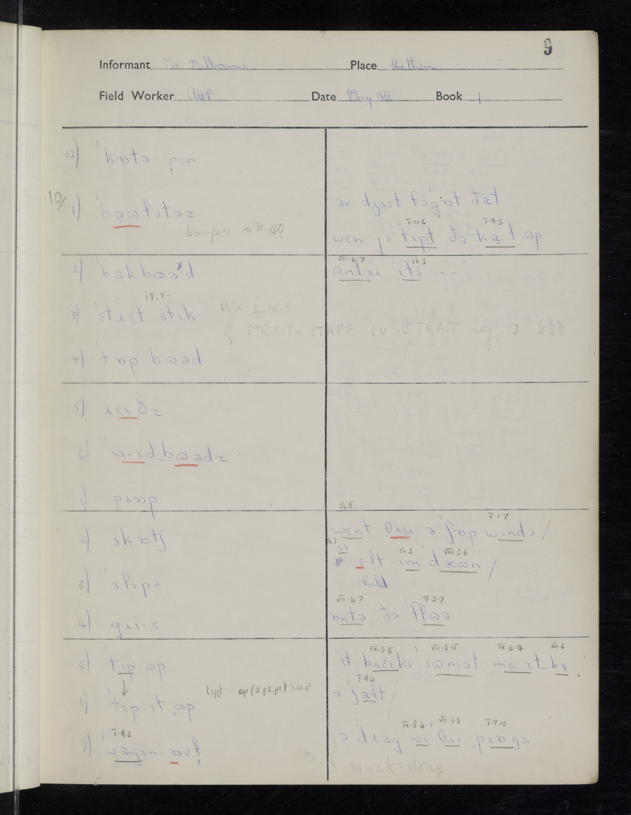 Response book recording the answers given by informants during the Survey of English Dialect. It includes 9 sections that cover a range of topics relating to work, domestic and social life. Answers are recorded in the International Phonetic Alphabet.