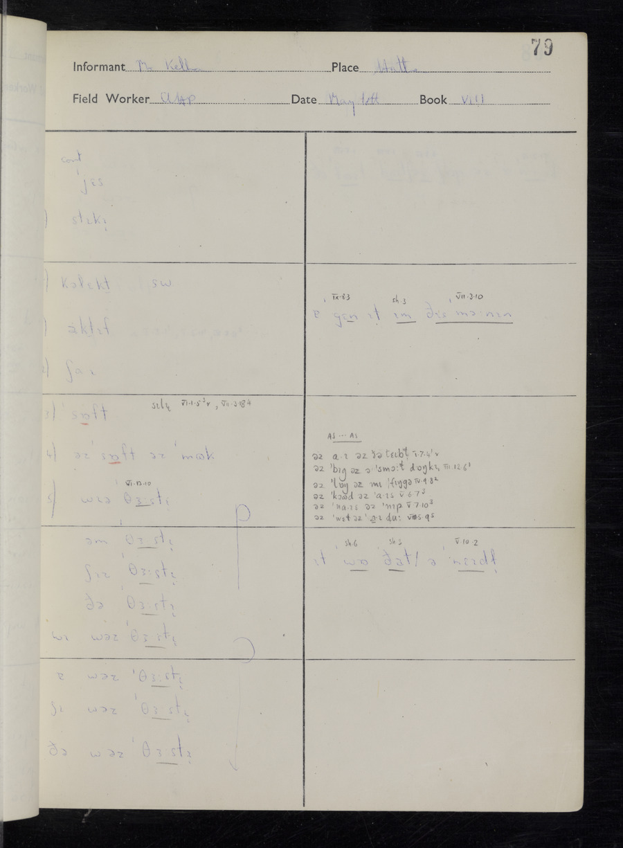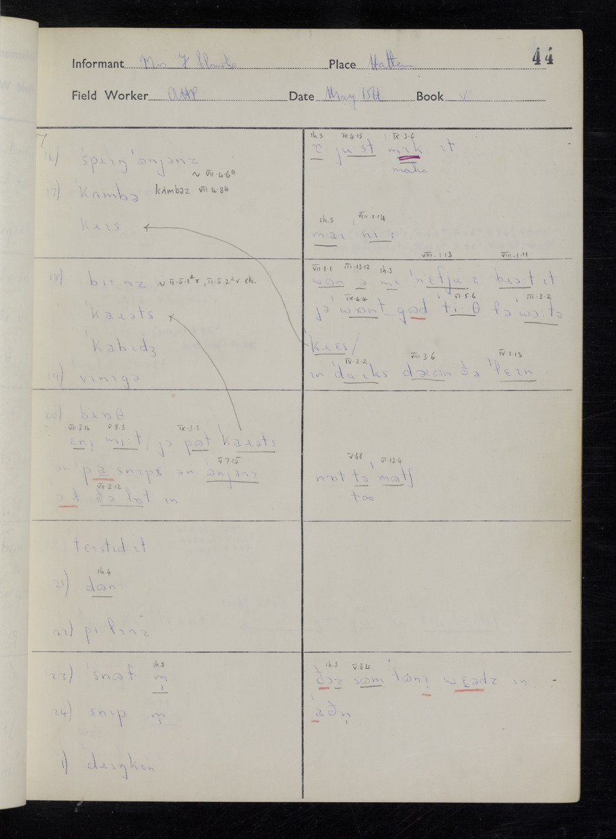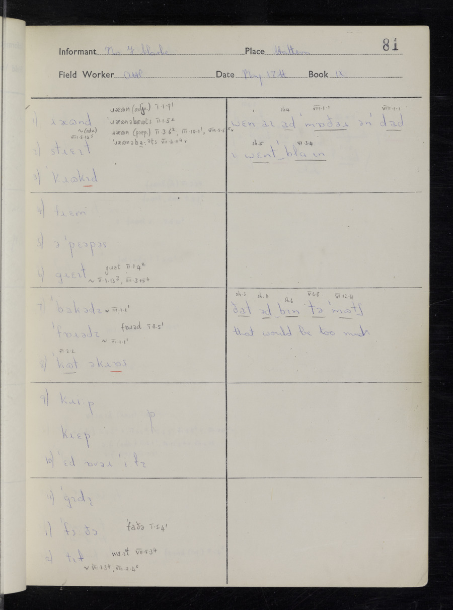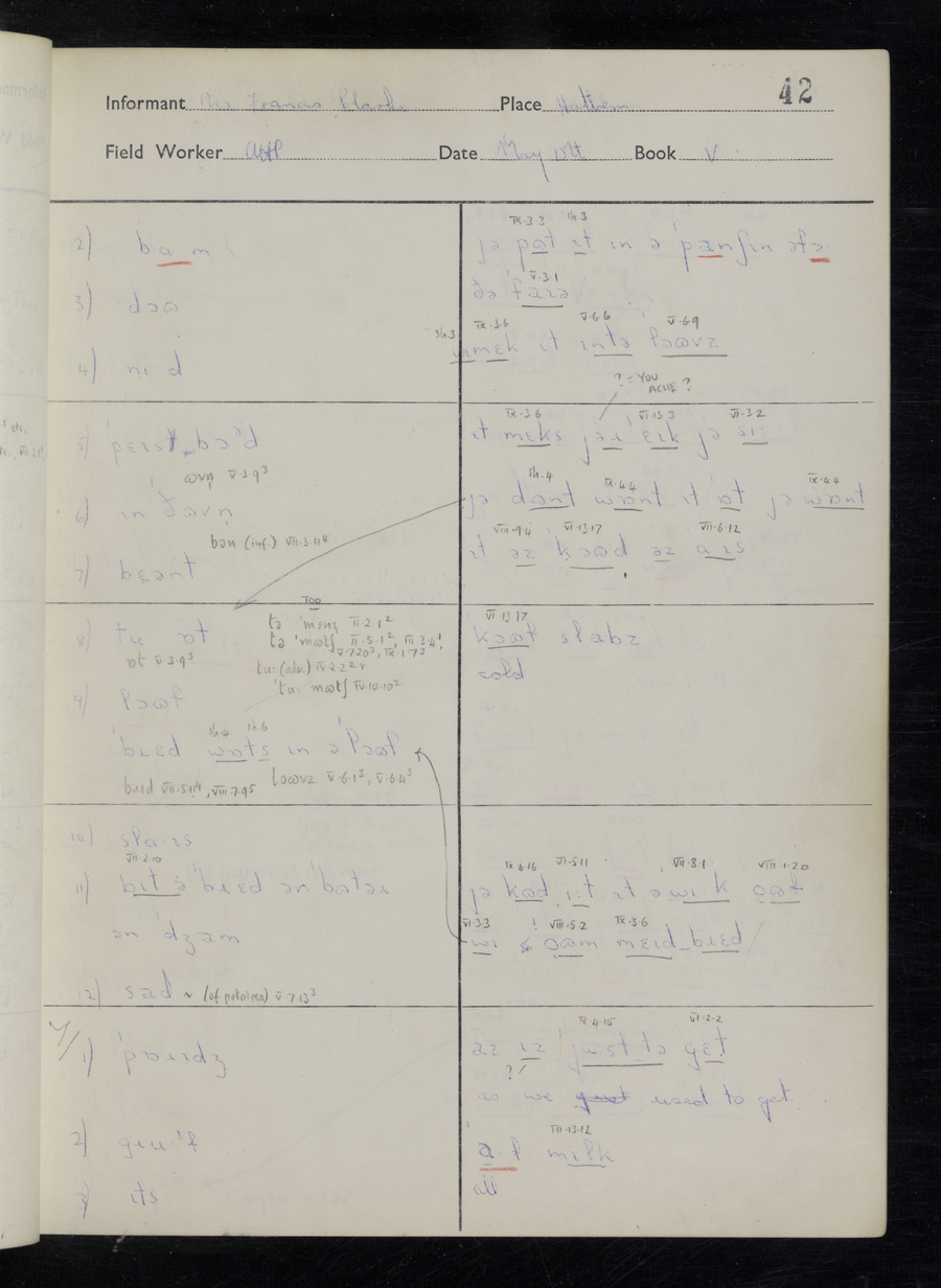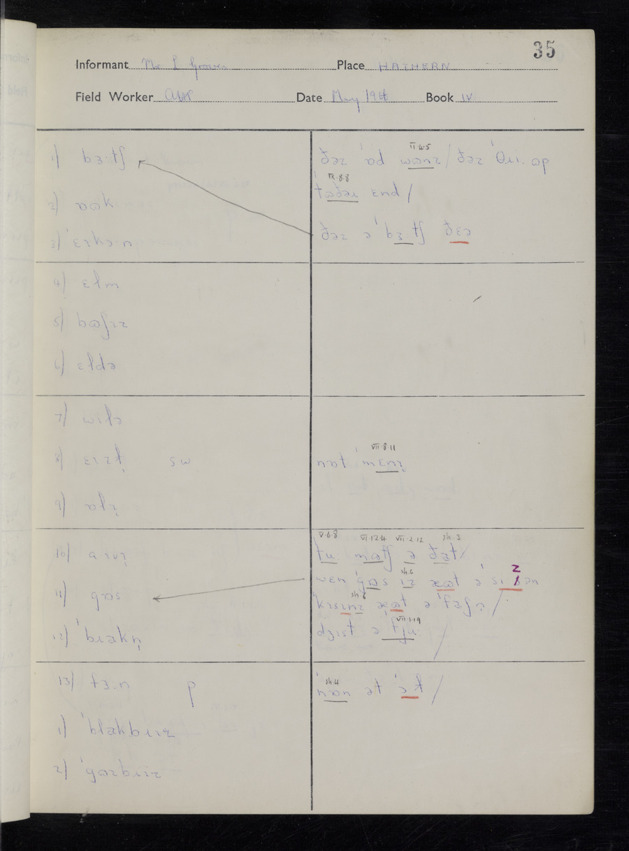 Response book recording the answers given by informants during the Survey of English Dialect. It includes 9 sections that cover a range of topics relating to work, domestic and social life. Answers are recorded in the International Phonetic Alphabet.