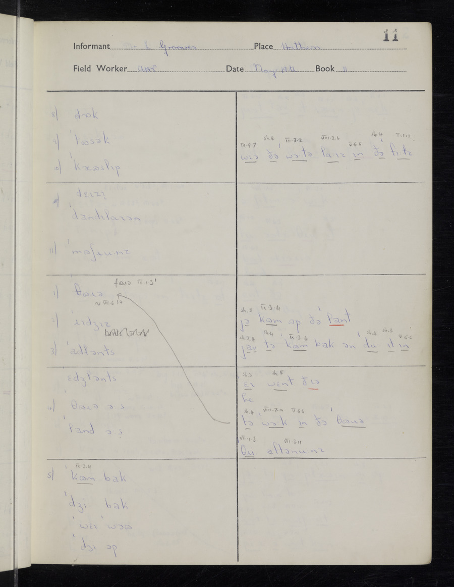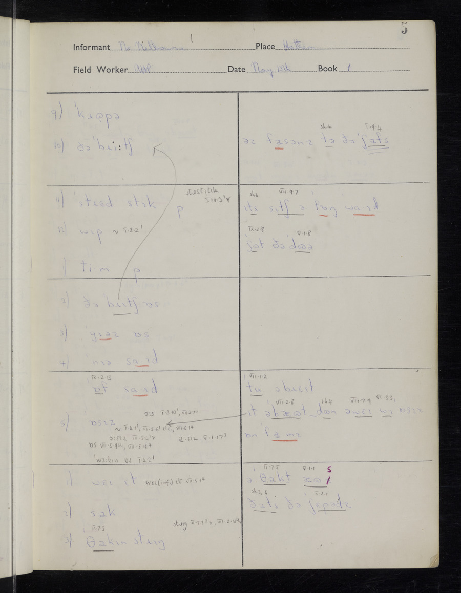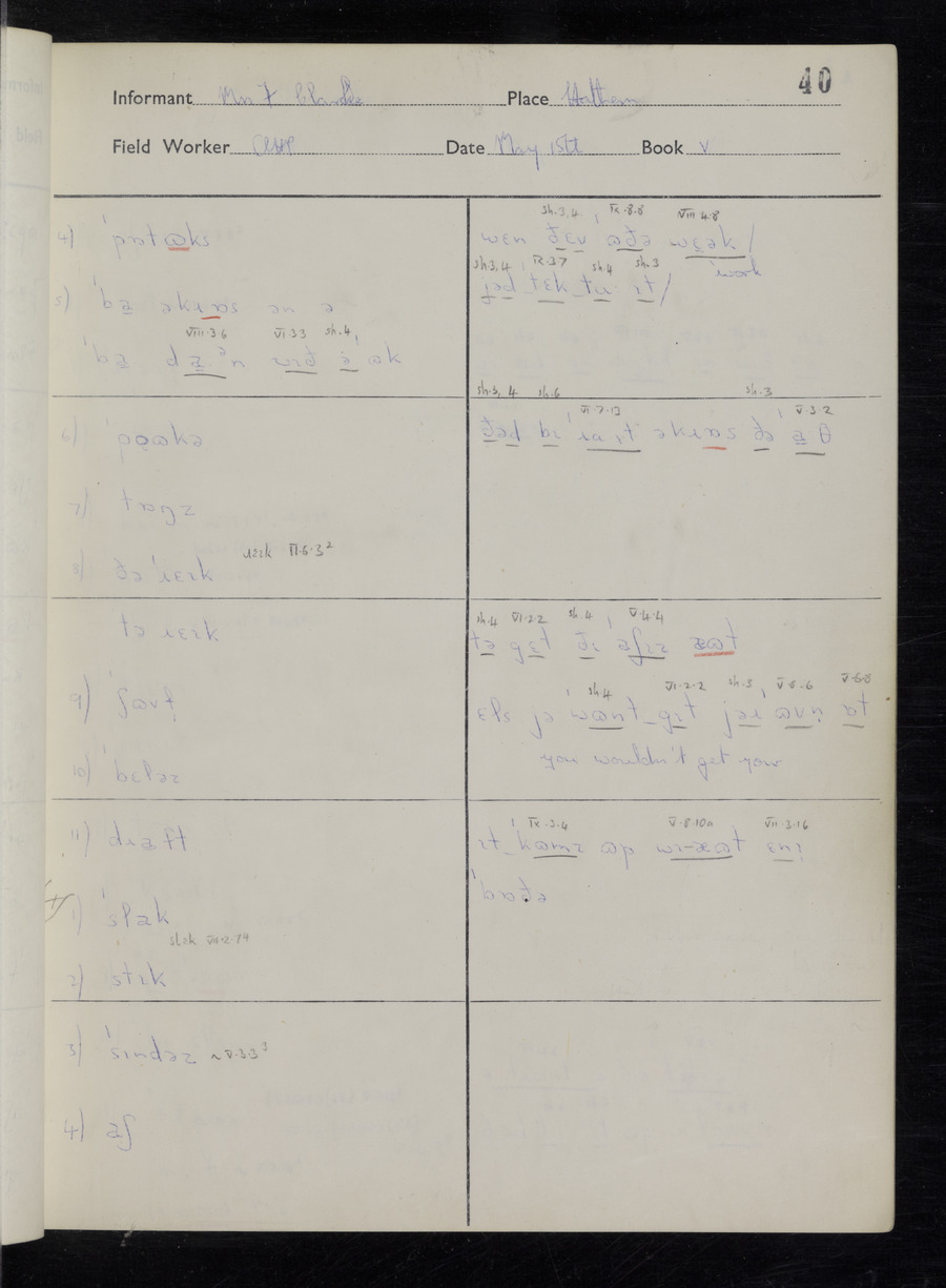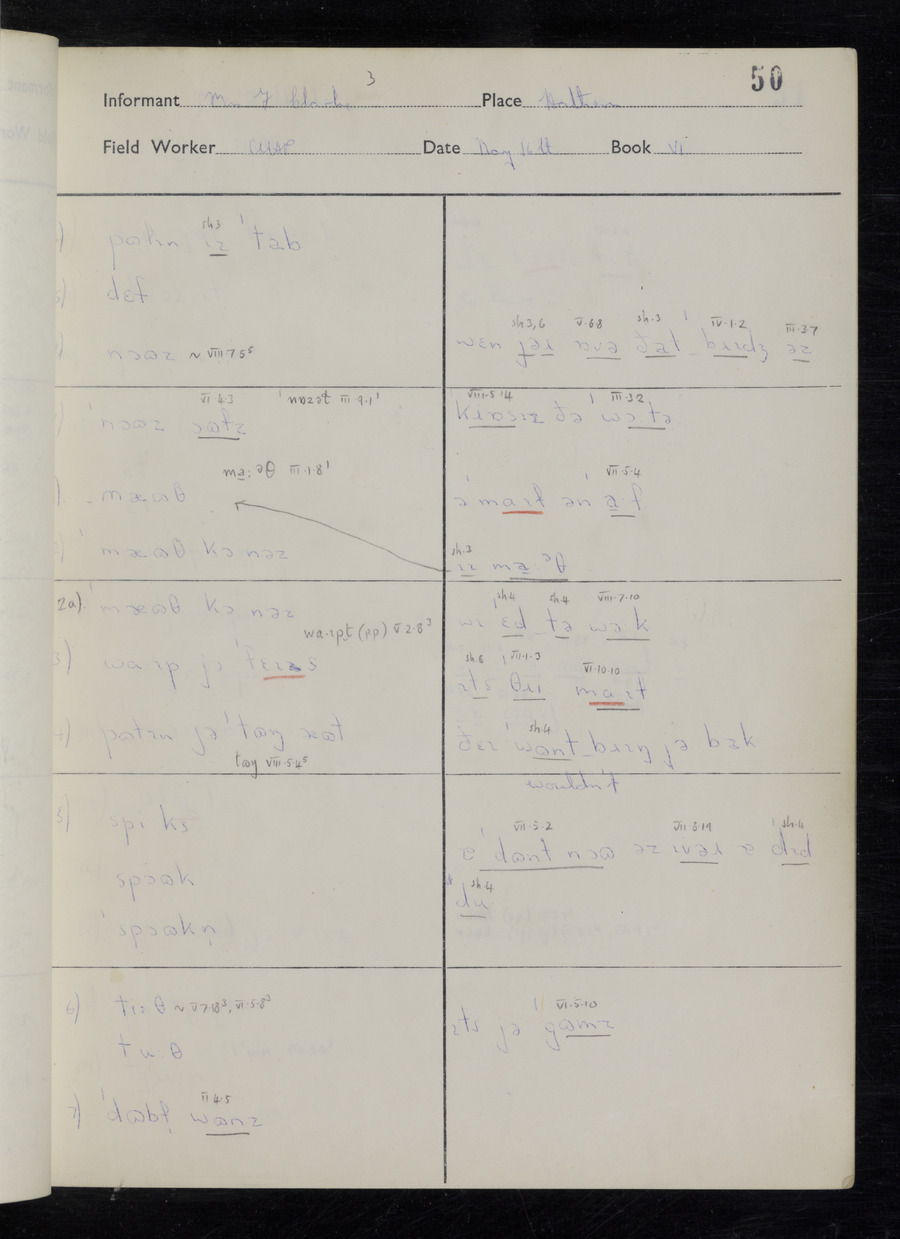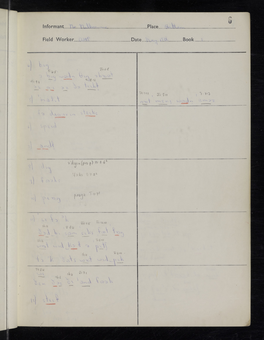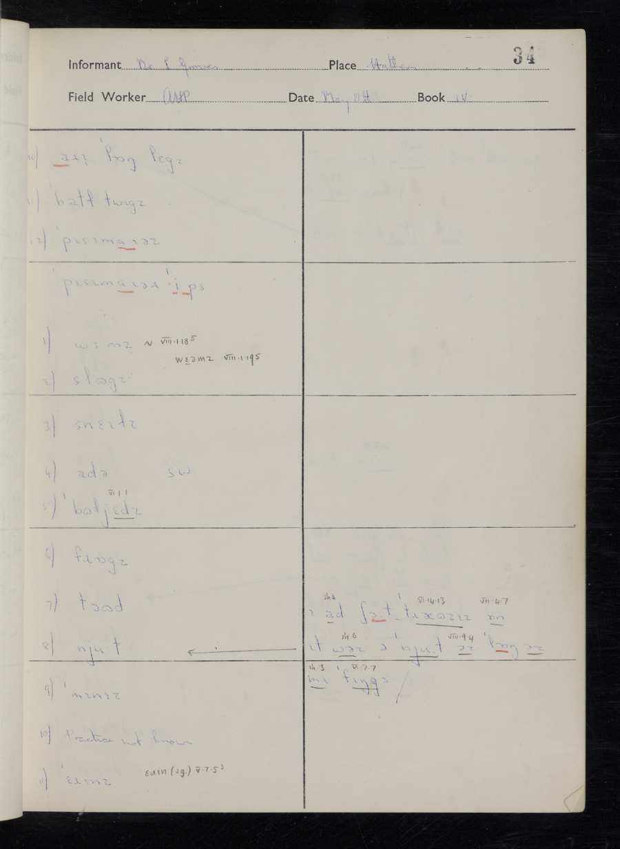Response book recording the answers given by informants during the Survey of English Dialect. It includes 9 sections that cover a range of topics relating to work, domestic and social life. Answers are recorded in the International Phonetic Alphabet.