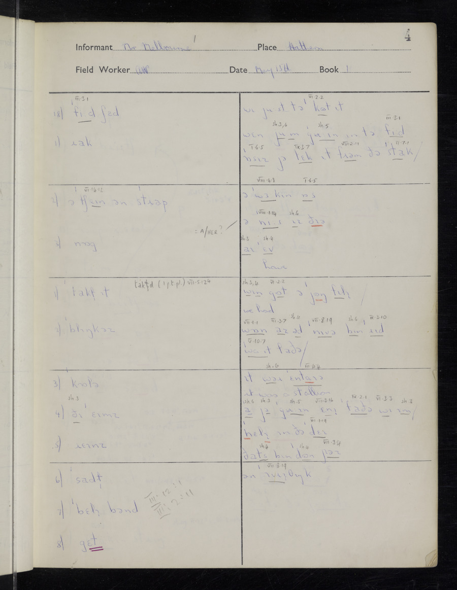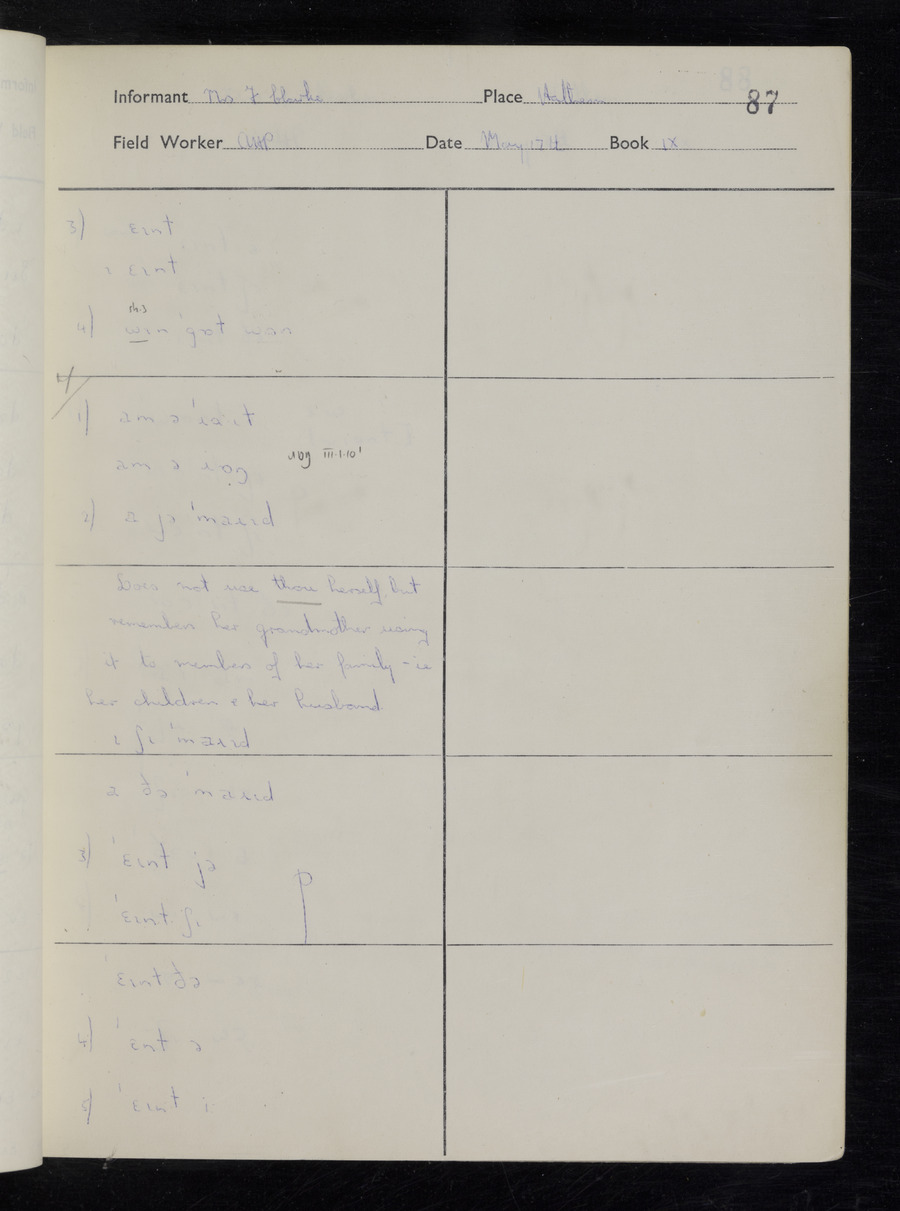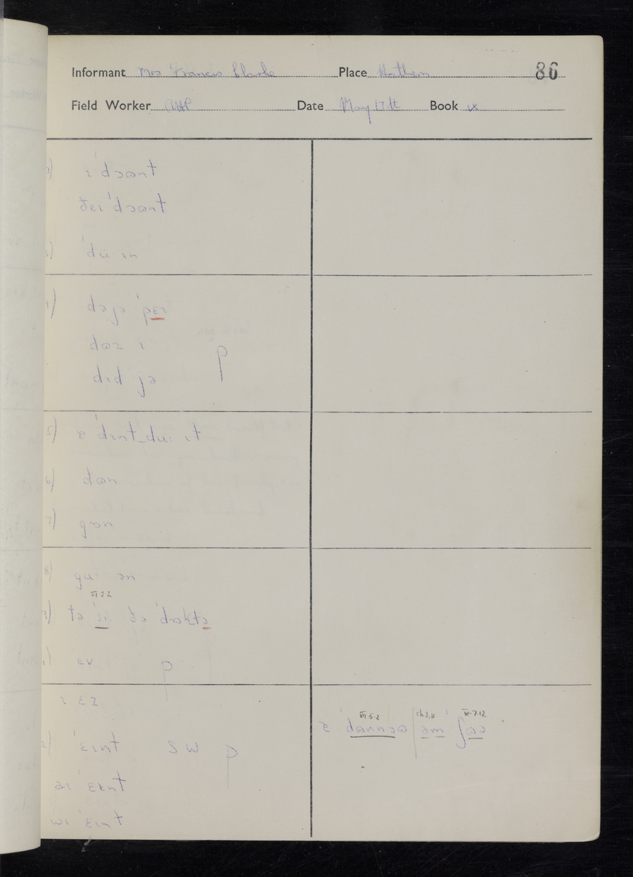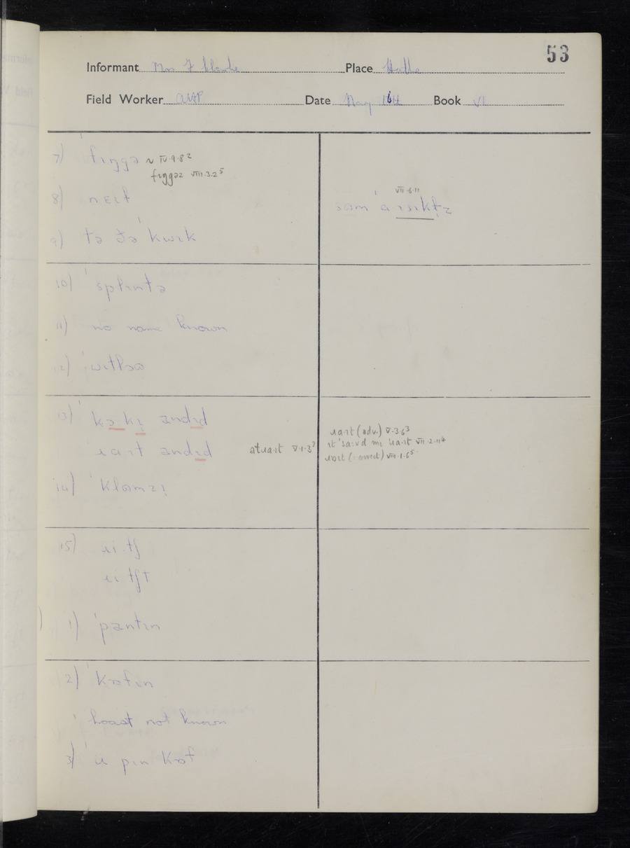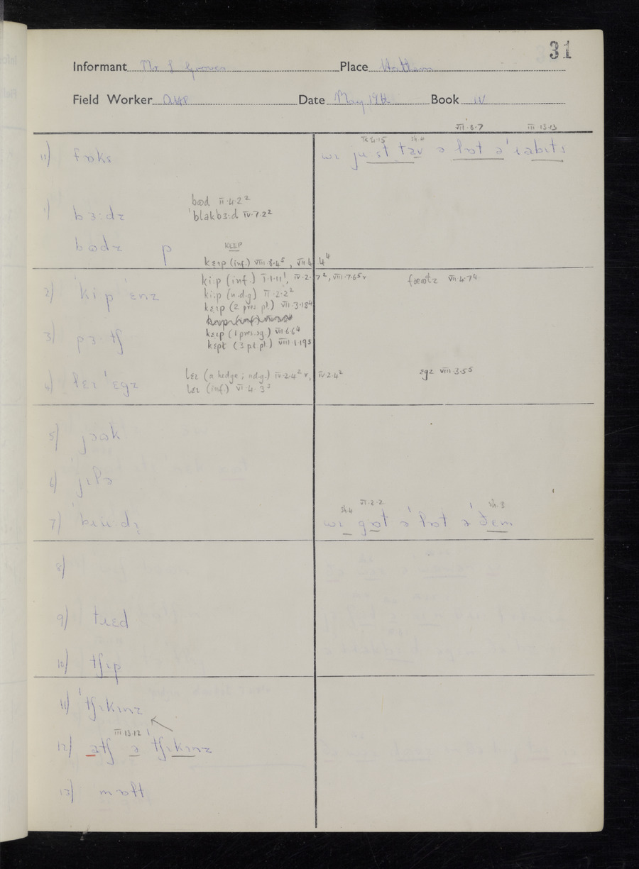 Response book recording the answers given by informants during the Survey of English Dialect. It includes 9 sections that cover a range of topics relating to work, domestic and social life. Answers are recorded in the International Phonetic Alphabet.