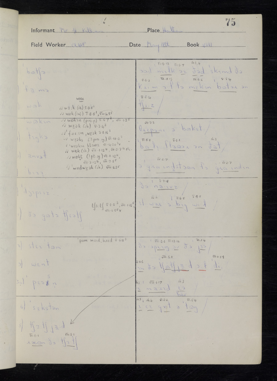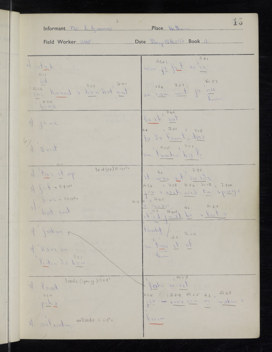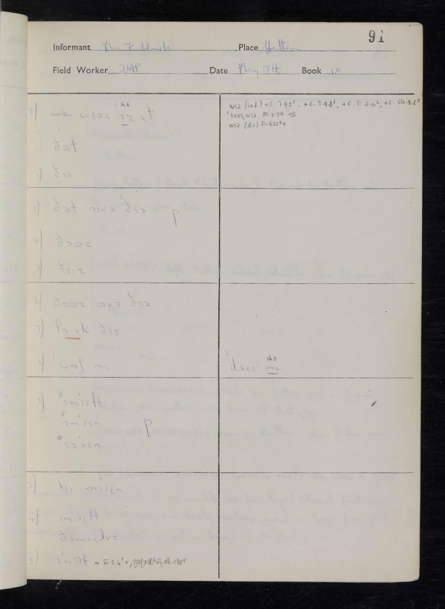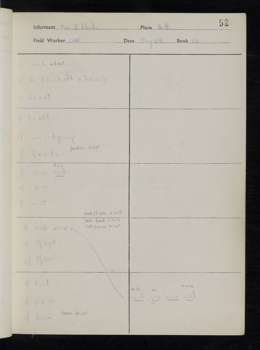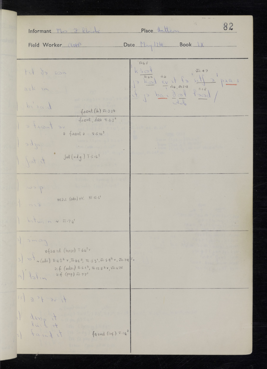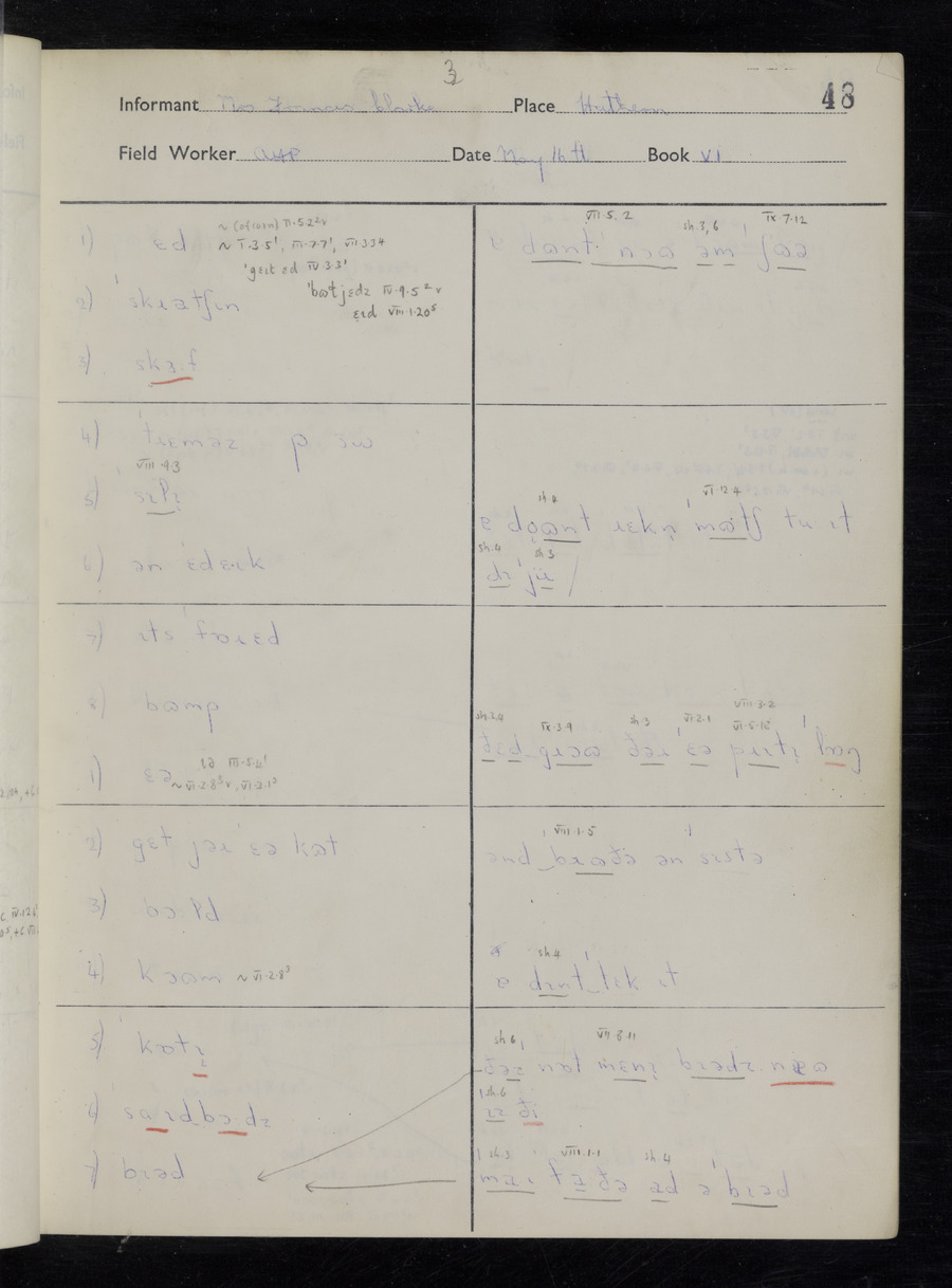 Response book recording the answers given by informants during the Survey of English Dialect. It includes 9 sections that cover a range of topics relating to work, domestic and social life. Answers are recorded in the International Phonetic Alphabet.
