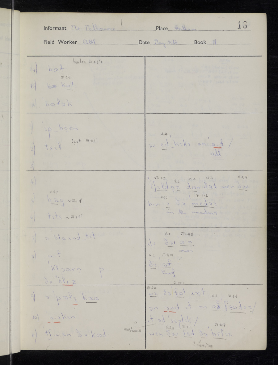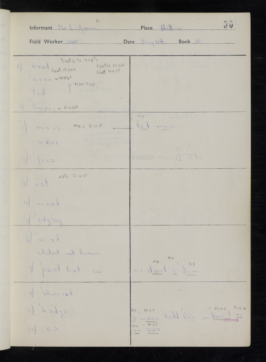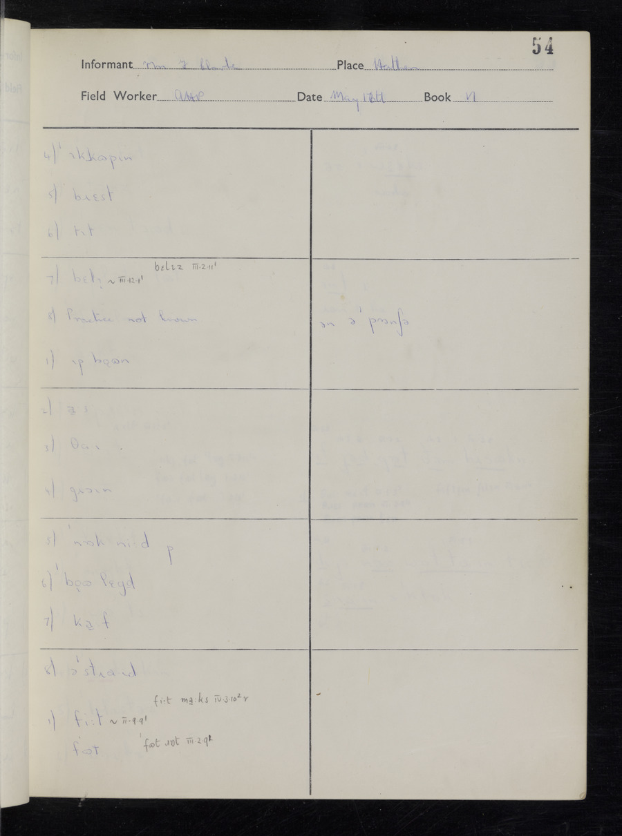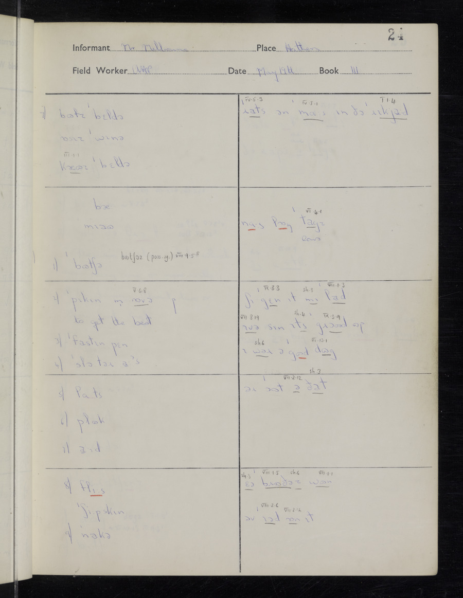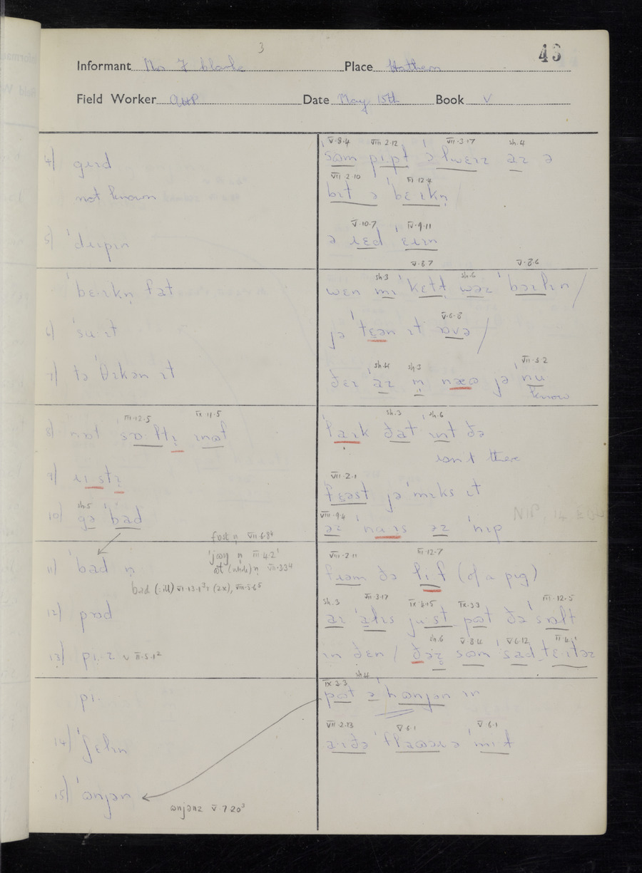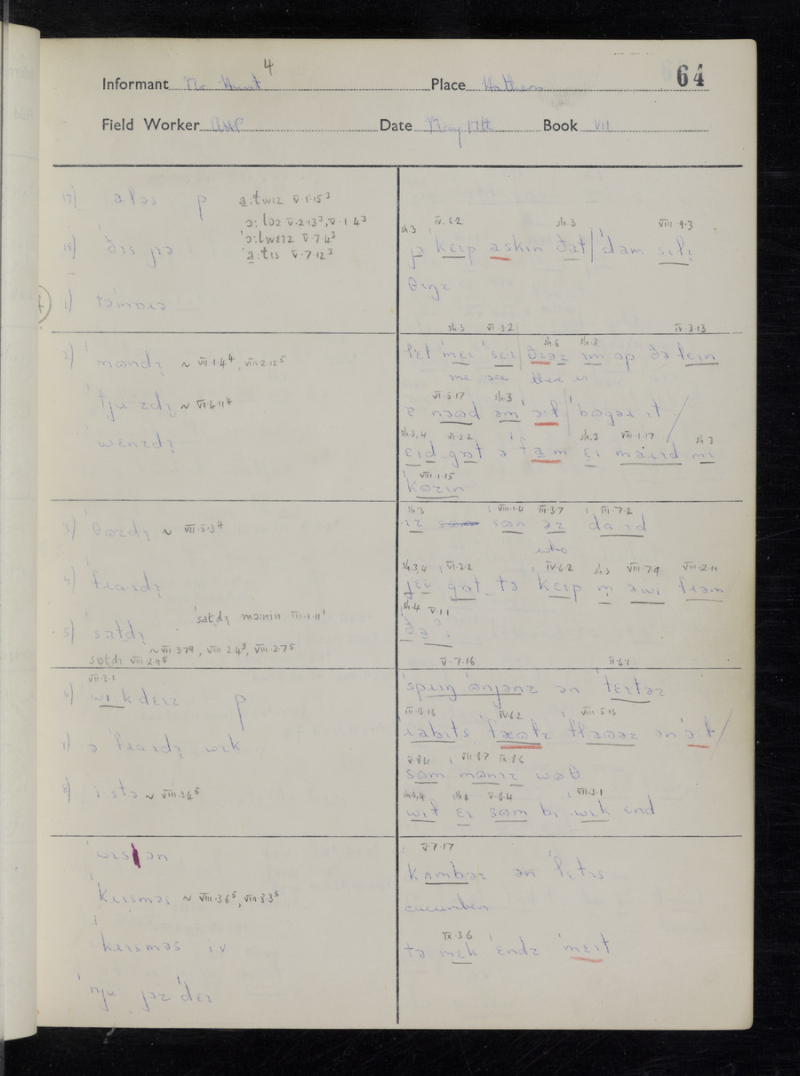 Response book recording the answers given by informants during the Survey of English Dialect. It includes 9 sections that cover a range of topics relating to work, domestic and social life. Answers are recorded in the International Phonetic Alphabet.